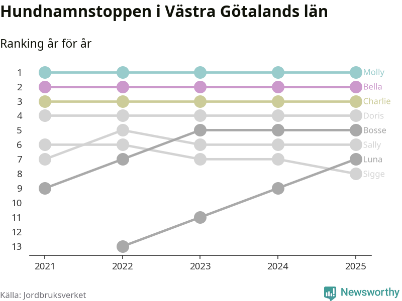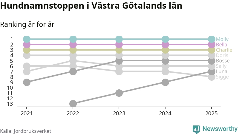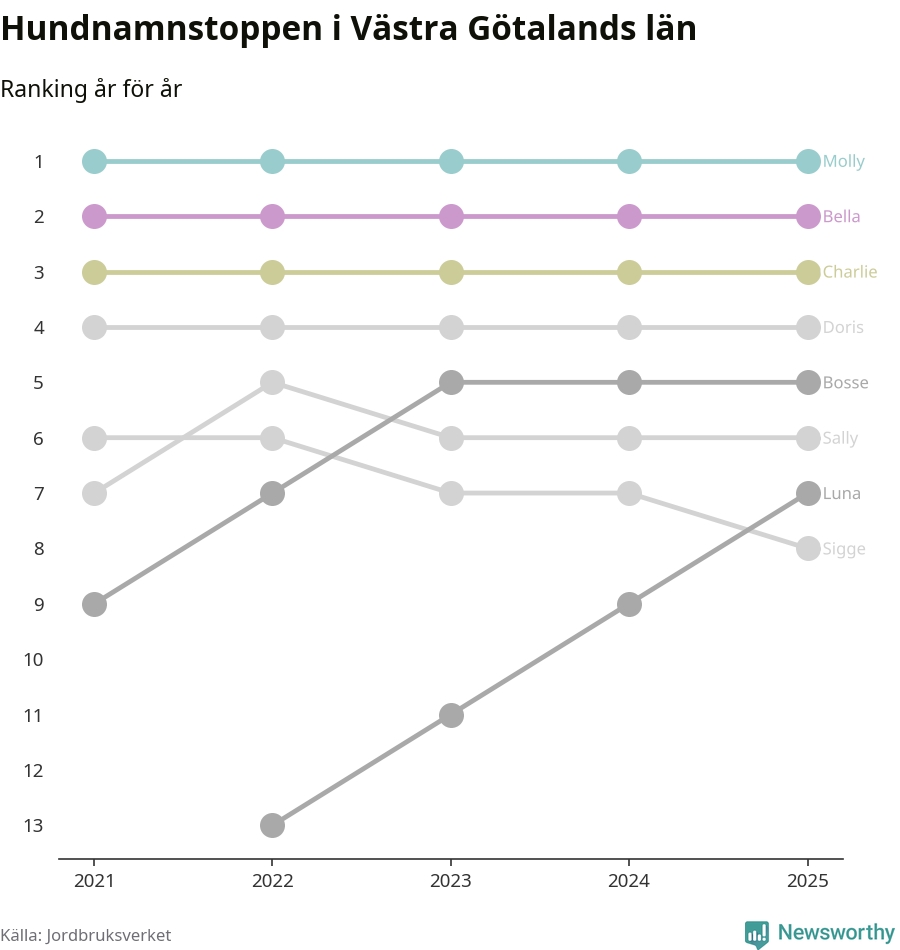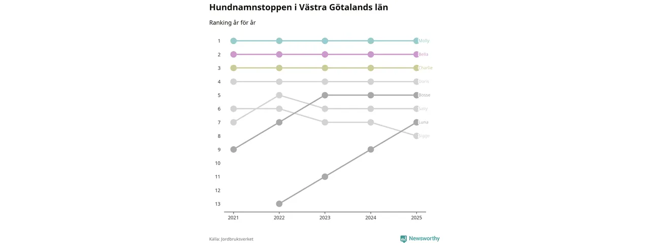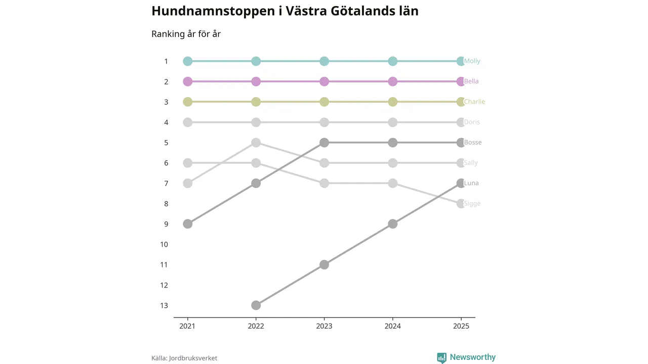 Molly toppar hundnamnsligan i Västra Götalands län, precis som i landet som helhet. Det visar färsk statistik från Jordbruksverket. Här finns hela topplistan för länet.