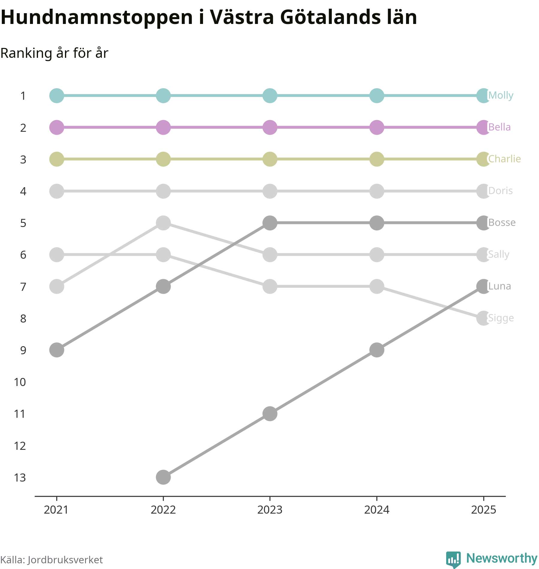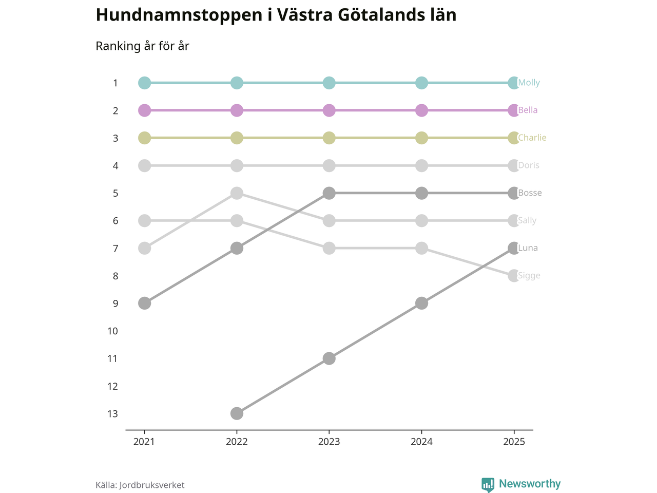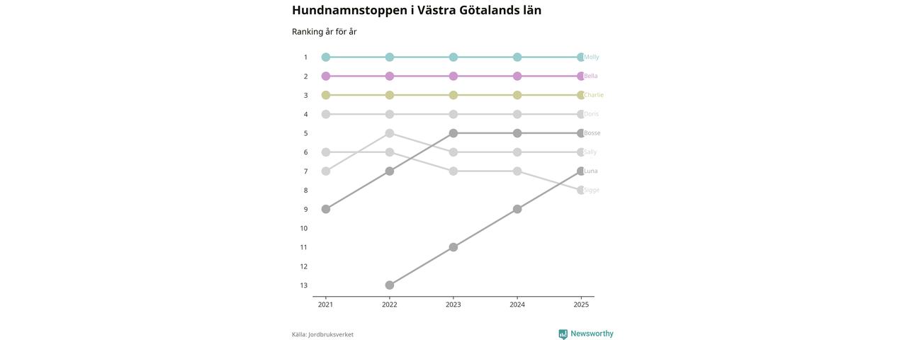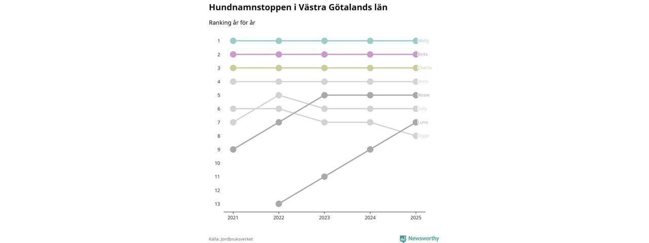 I hela landet är Molly det ohotat populäraste tilltalsnamnet för hundar sedan flera år, följt av Bella och Charlie. Något av de tre namnen toppar listan i 243 av 290 kommuner, och de har varit de vanligaste namnen sedan åtminstone 2018. Men det fjärde populäraste namnet, Doris, knappade in på ledartrion och kommer snart kunna utmana Charlie om tredjeplatsen, om trenden håller i sig.