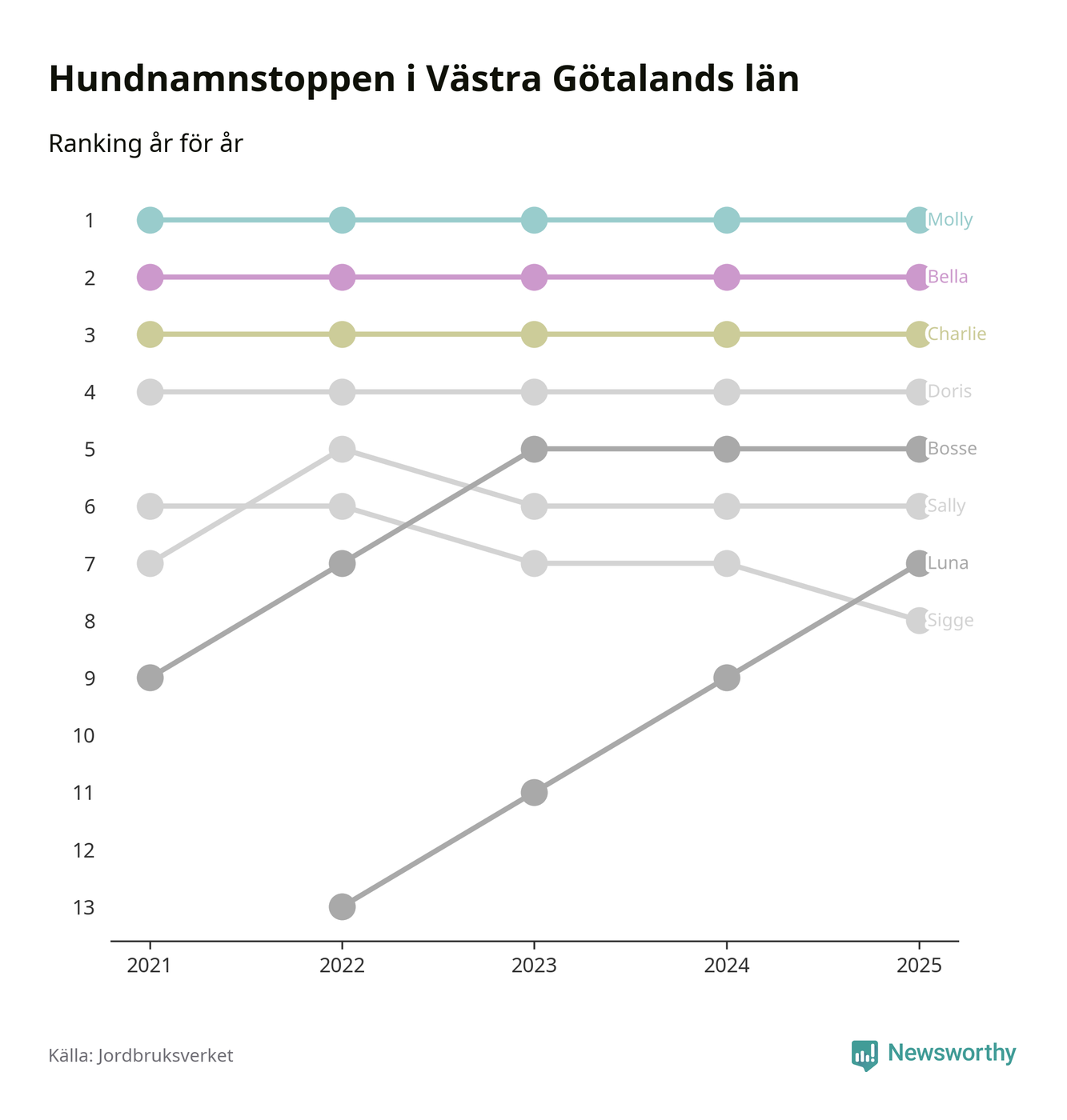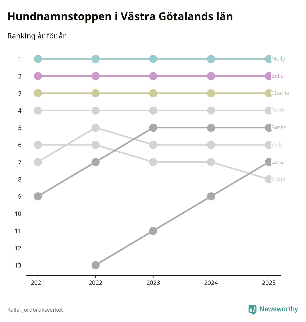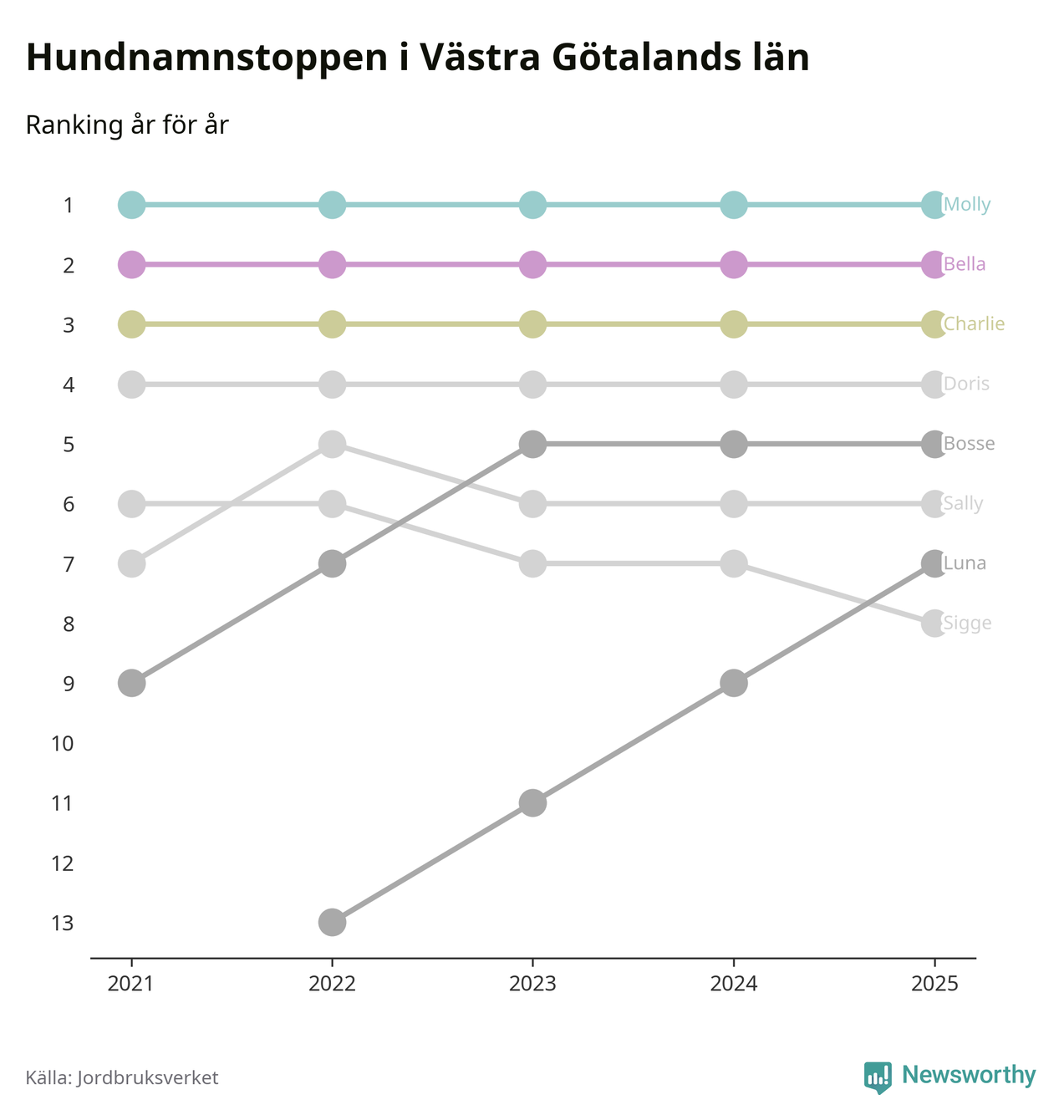I hela landet är Molly det ohotat populäraste tilltalsnamnet för hundar sedan flera år, följt av Bella och Charlie. Något av de tre namnen toppar listan i 243 av 290 kommuner, och de har varit de vanligaste namnen sedan åtminstone 2018. Men det fjärde populäraste namnet, Doris, knappade in på ledartrion och kommer snart kunna utmana Charlie om tredjeplatsen, om trenden håller i sig.