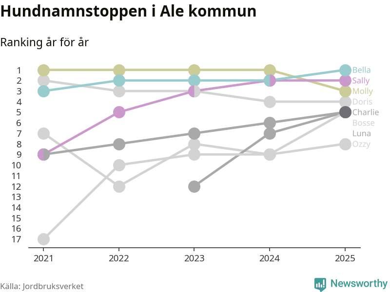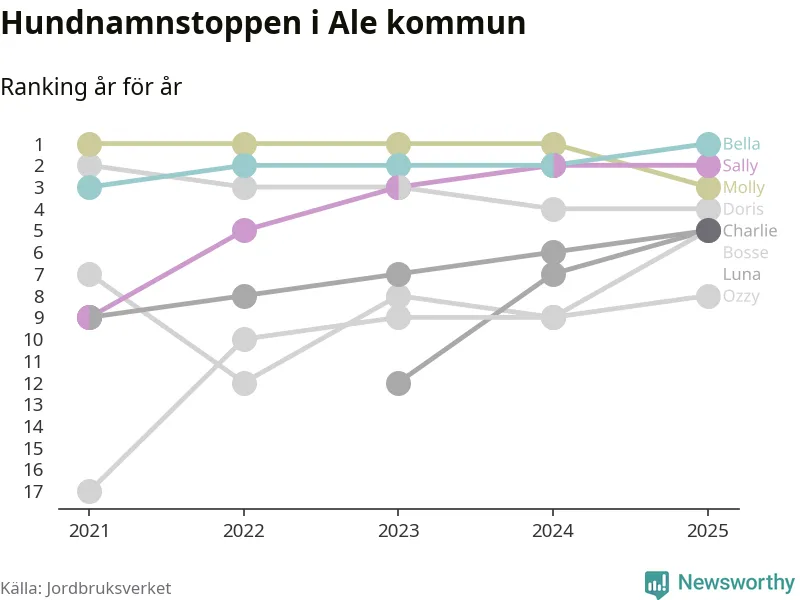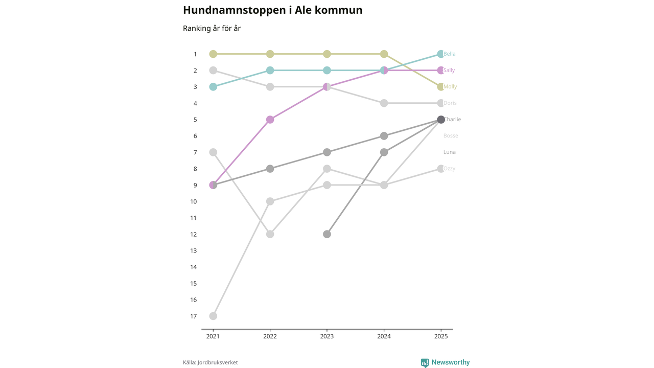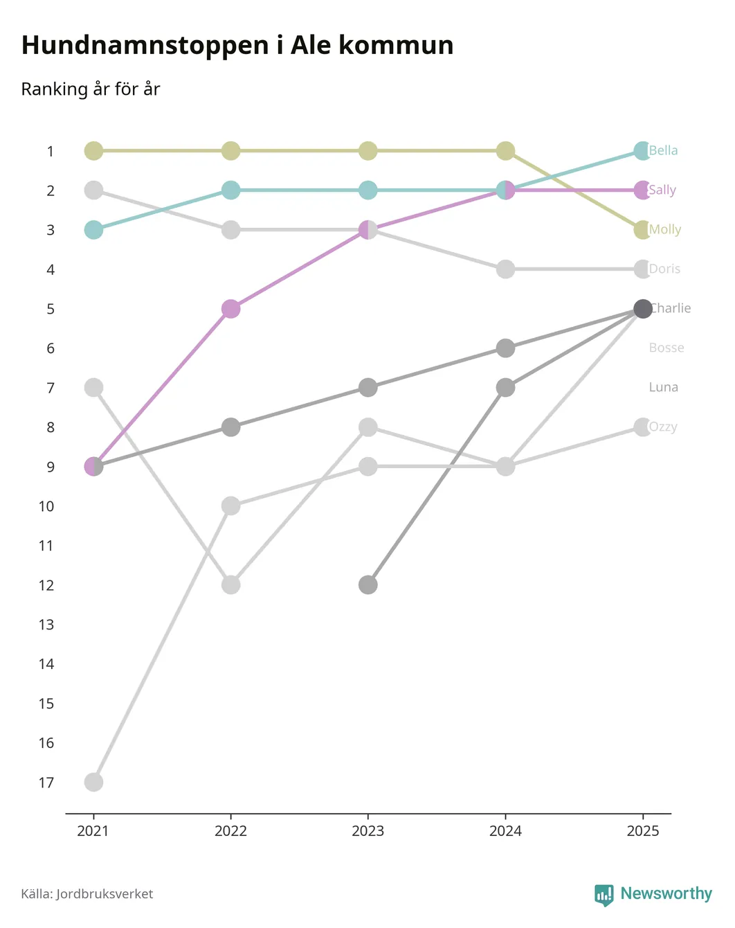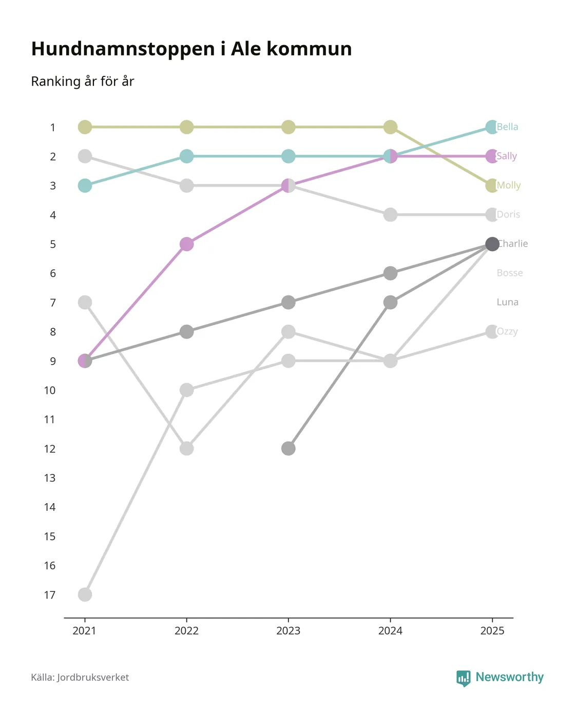 I hela landet är Molly det ohotat populäraste tilltalsnamnet för hundar sedan flera år, följt av Bella och Charlie. Något av de tre namnen toppar listan i 243 av 290 kommuner, och de har varit de vanligaste namnen sedan åtminstone 2018. Men det fjärde populäraste namnet, Doris, knappade in på ledartrion och kommer snart kunna utmana Charlie om tredjeplatsen, om trenden håller i sig.