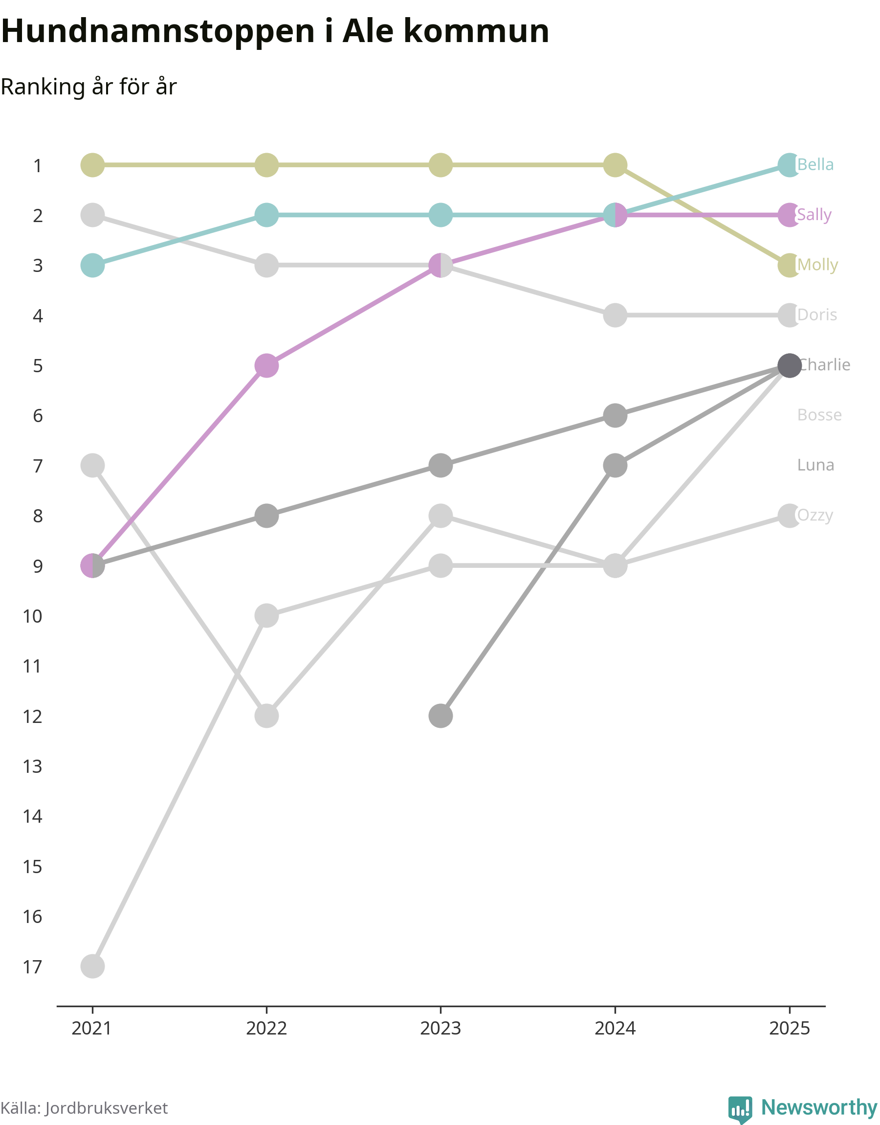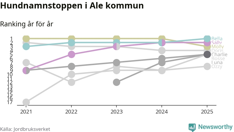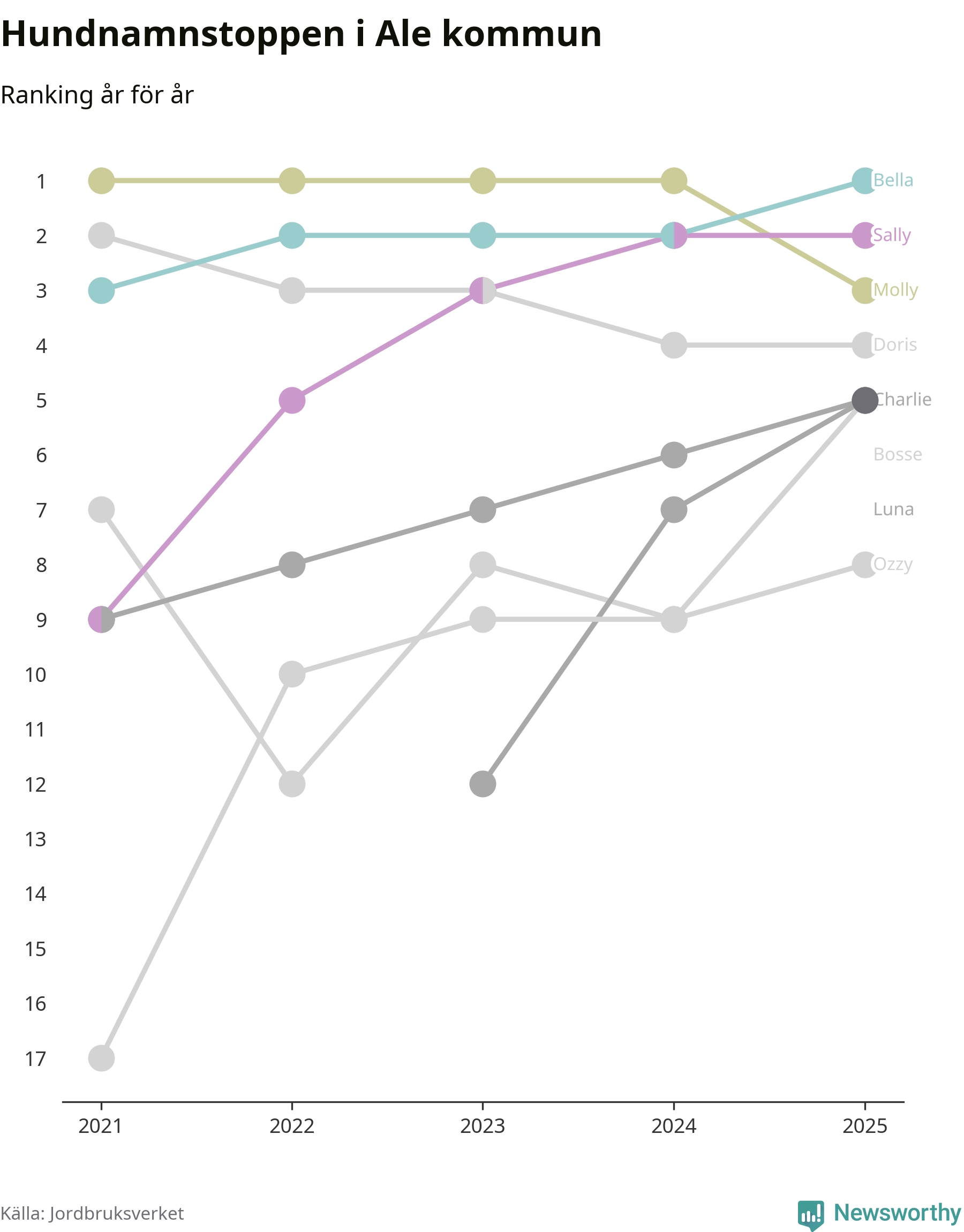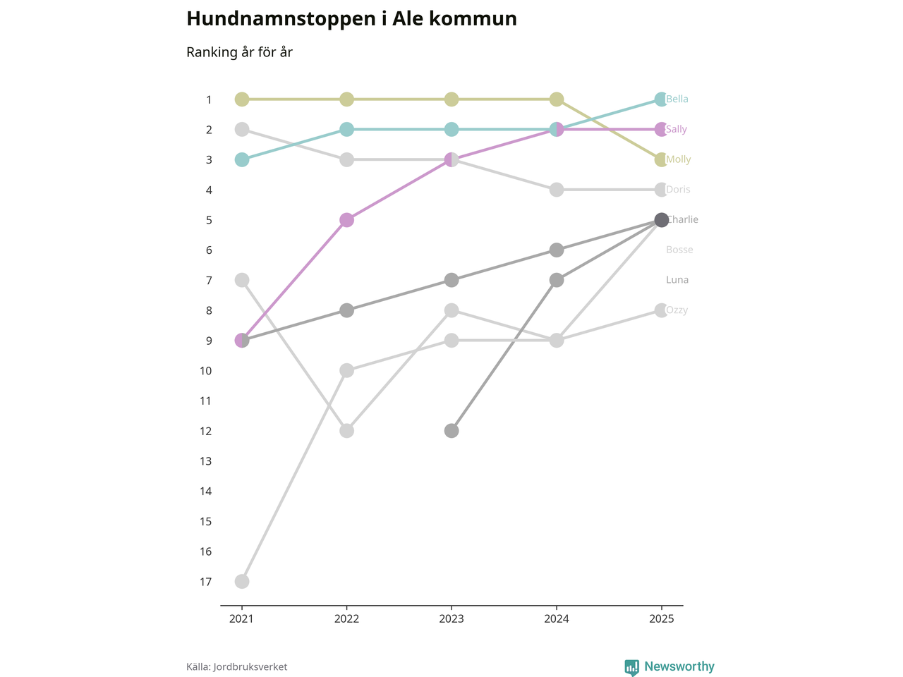 I hela landet är Molly det ohotat populäraste tilltalsnamnet för hundar sedan flera år, följt av Bella och Charlie. Något av de tre namnen toppar listan i 243 av 290 kommuner, och de har varit de vanligaste namnen sedan åtminstone 2018. Men det fjärde populäraste namnet, Doris, knappade in på ledartrion och kommer snart kunna utmana Charlie om tredjeplatsen, om trenden håller i sig.