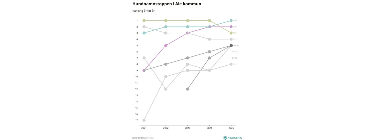 Bella är ny etta på topplistan över Ales hundnamn, visar ny statistik från Jordbruksverkets hundregister. Bella finns också bland hela landets allra populäraste namn.
