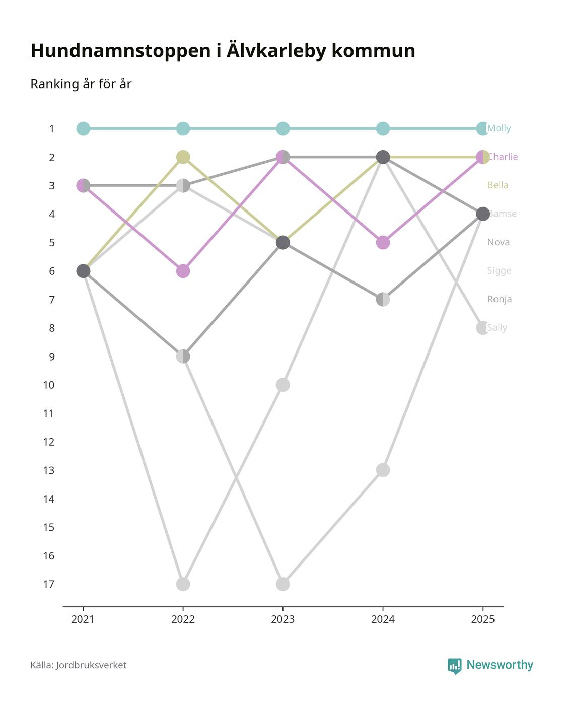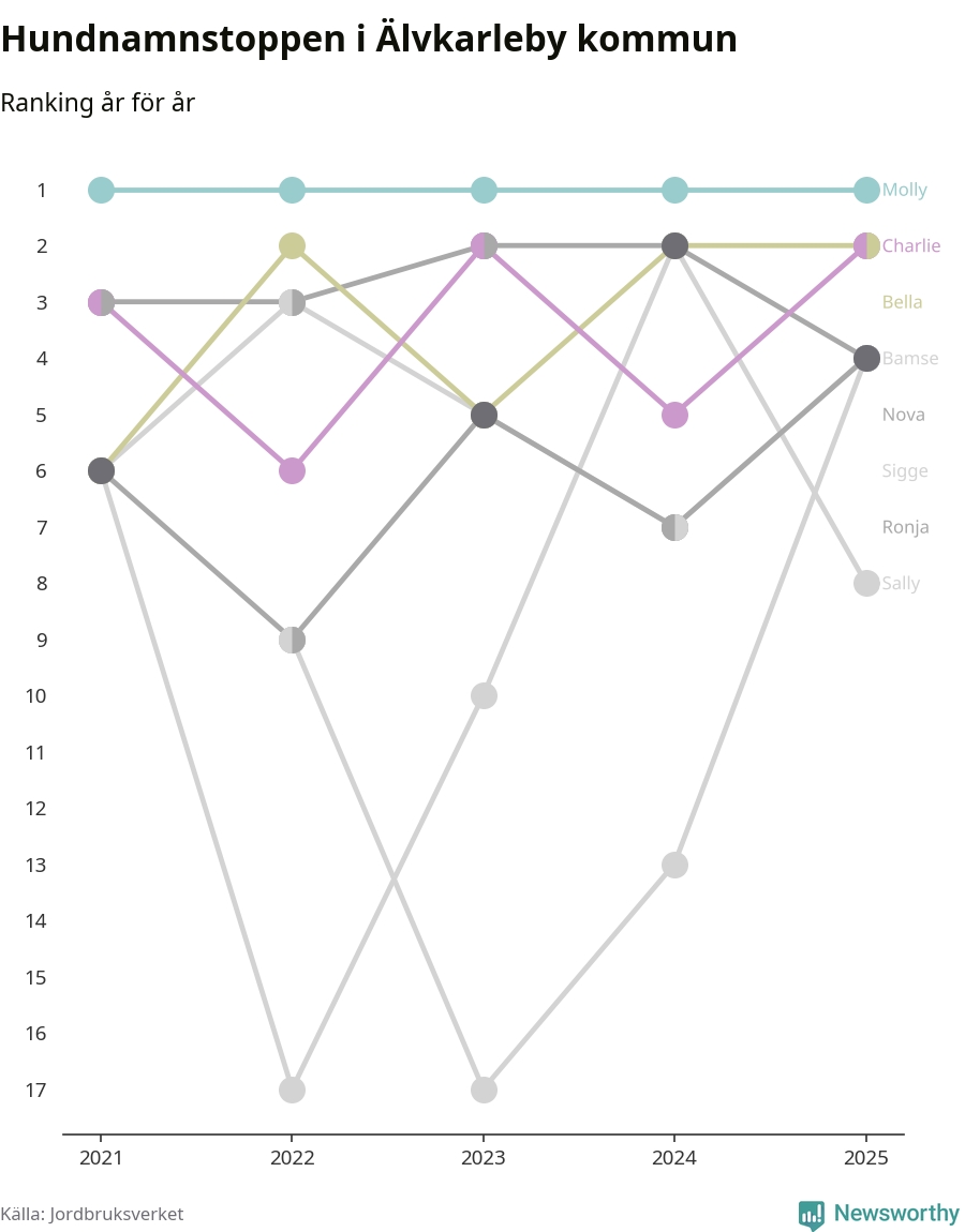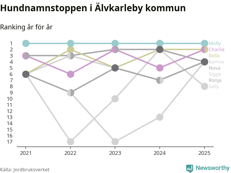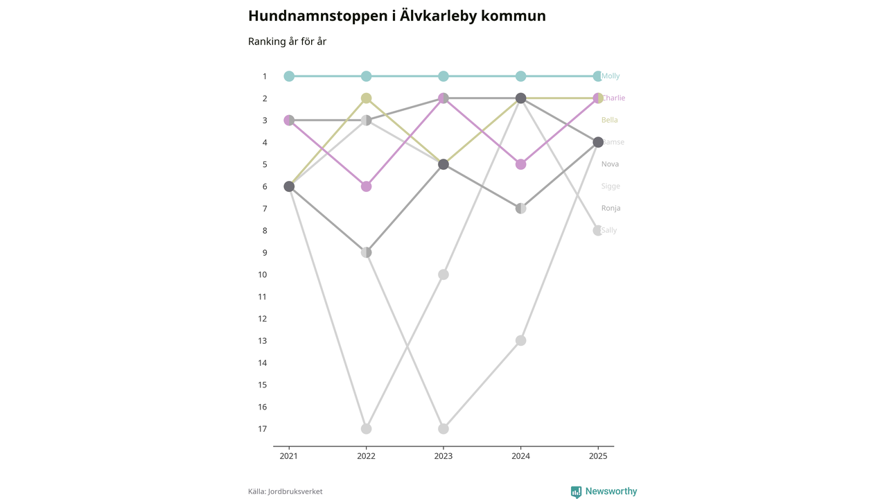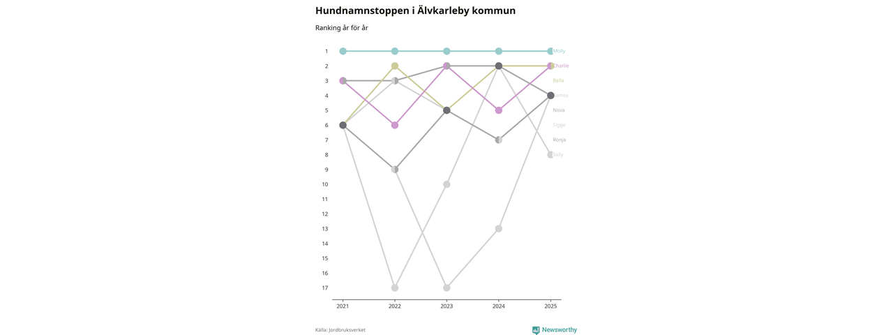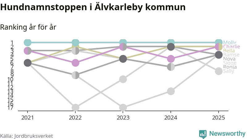 Molly är fortsatt ohotad etta bland hundnamnen i Sverige, följt av Bella och Charlie. Så har det sett ut flera år i rad, och även bland Älvkarlebyhundarna ligger alltså Molly i topp.