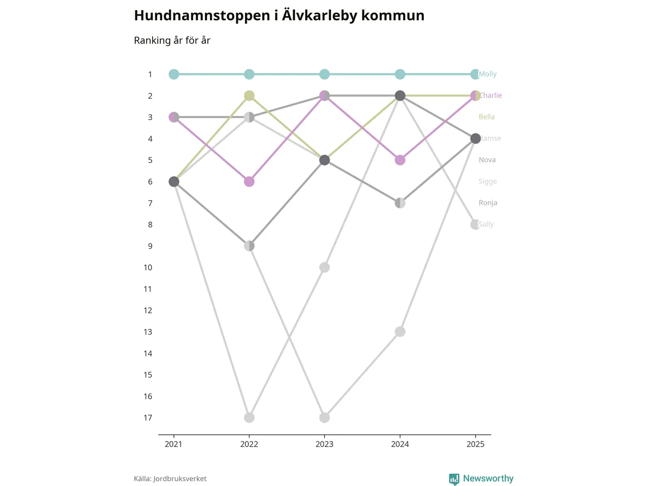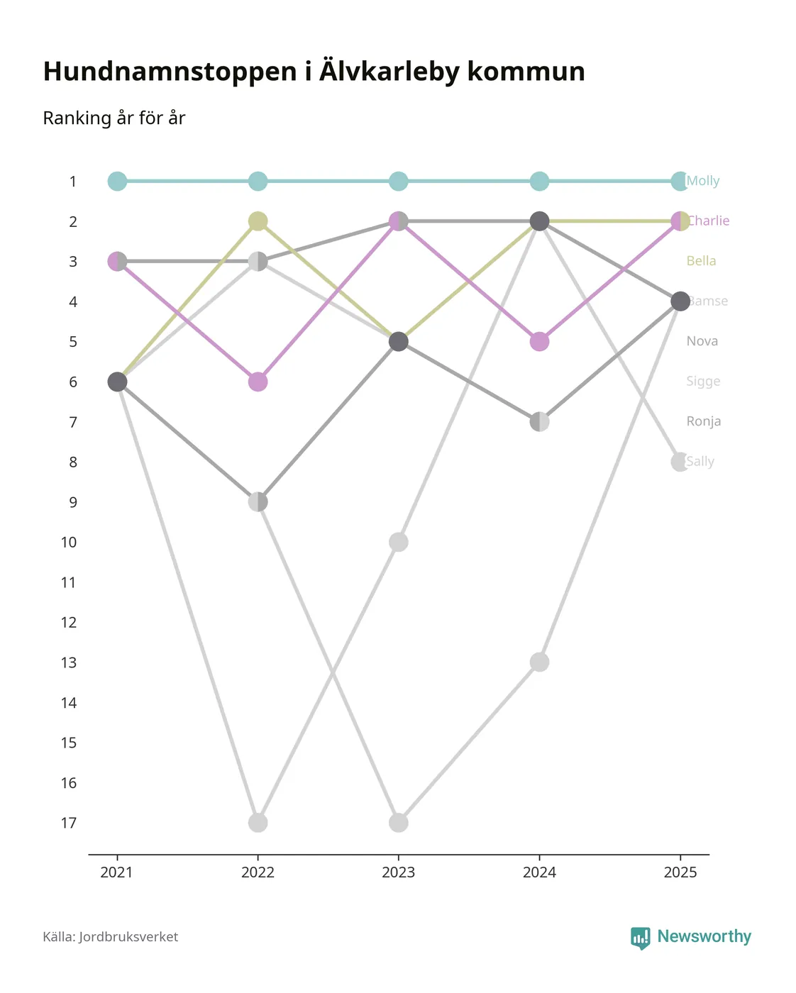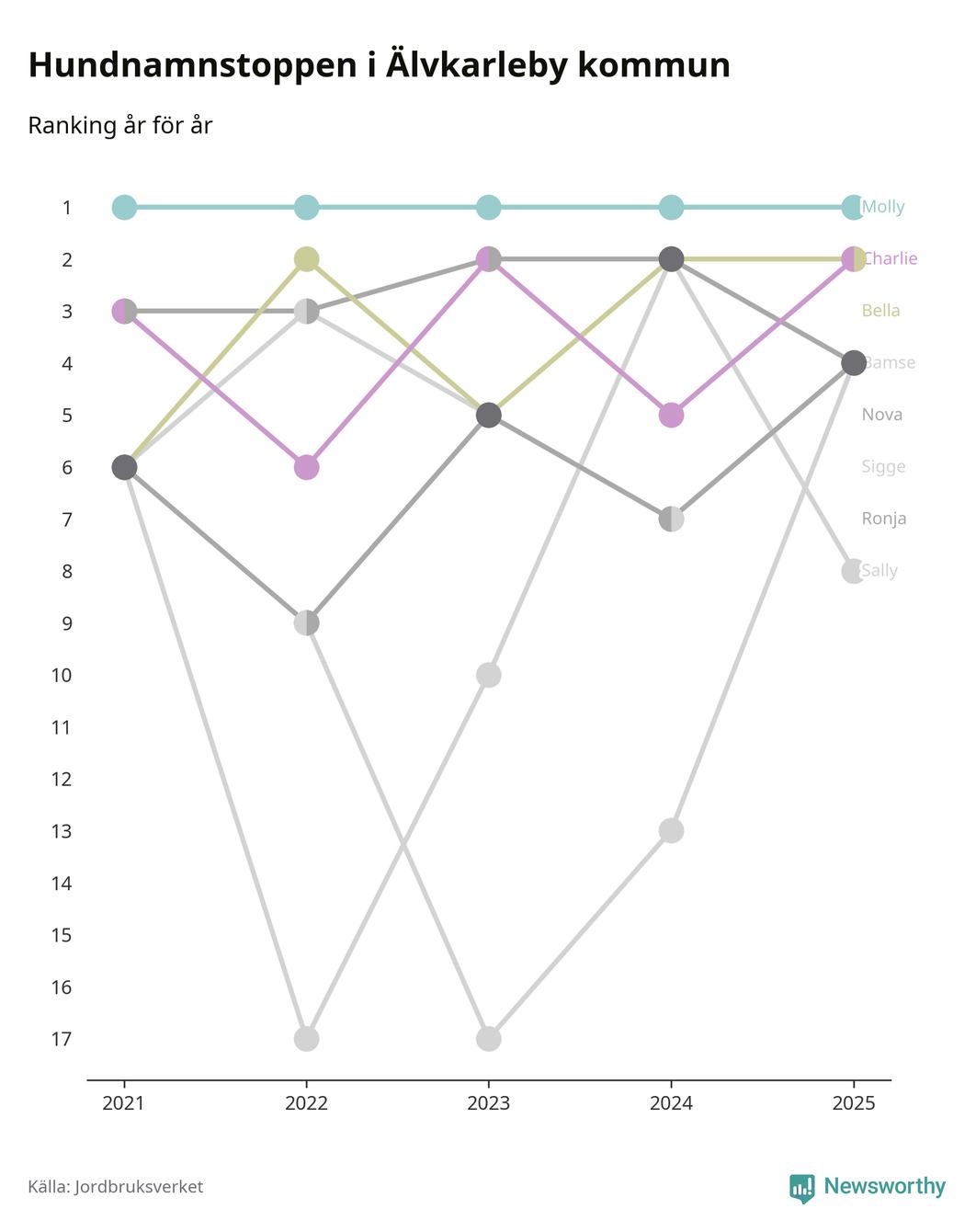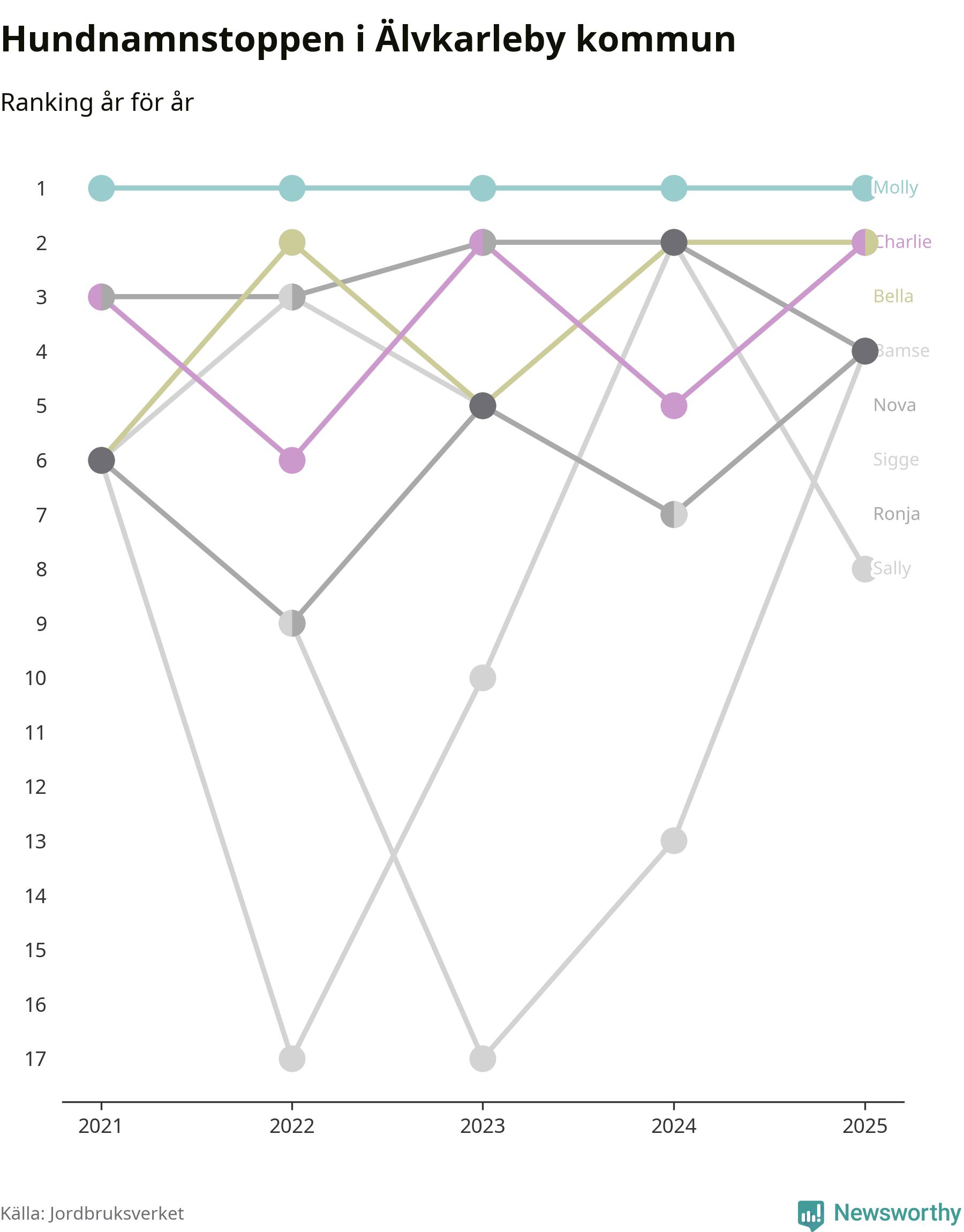 Molly är fortsatt ohotad etta bland hundnamnen i Sverige, följt av Bella och Charlie. Så har det sett ut flera år i rad, och även bland Älvkarlebyhundarna ligger alltså Molly i topp.