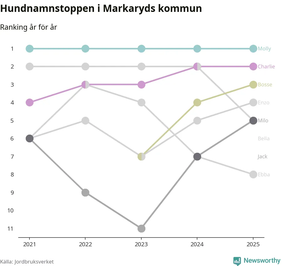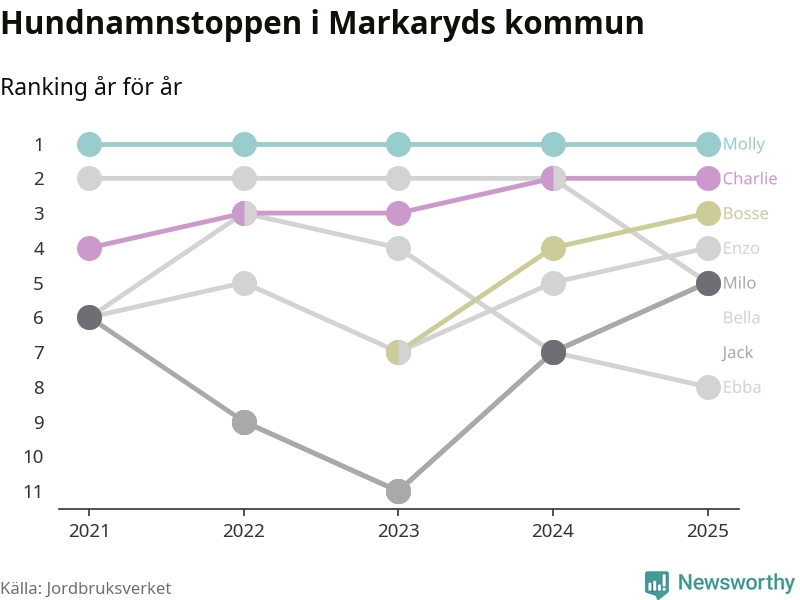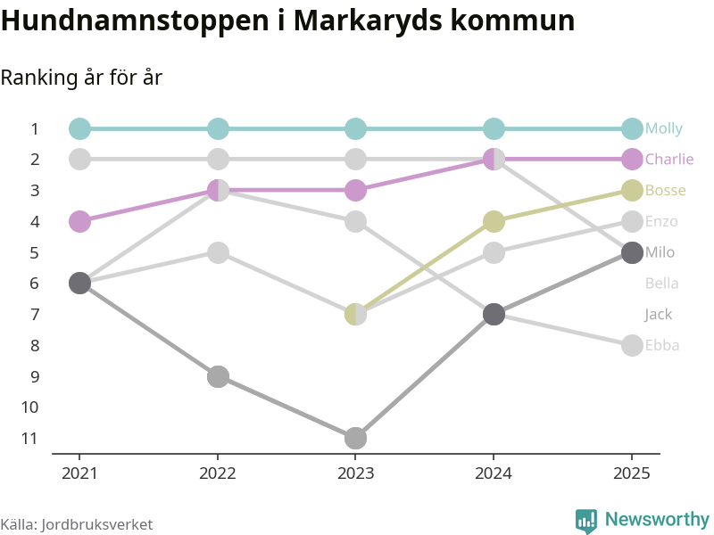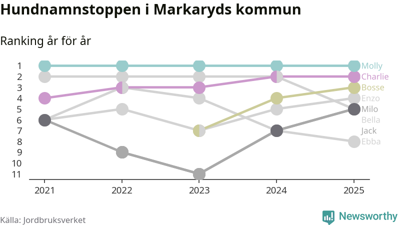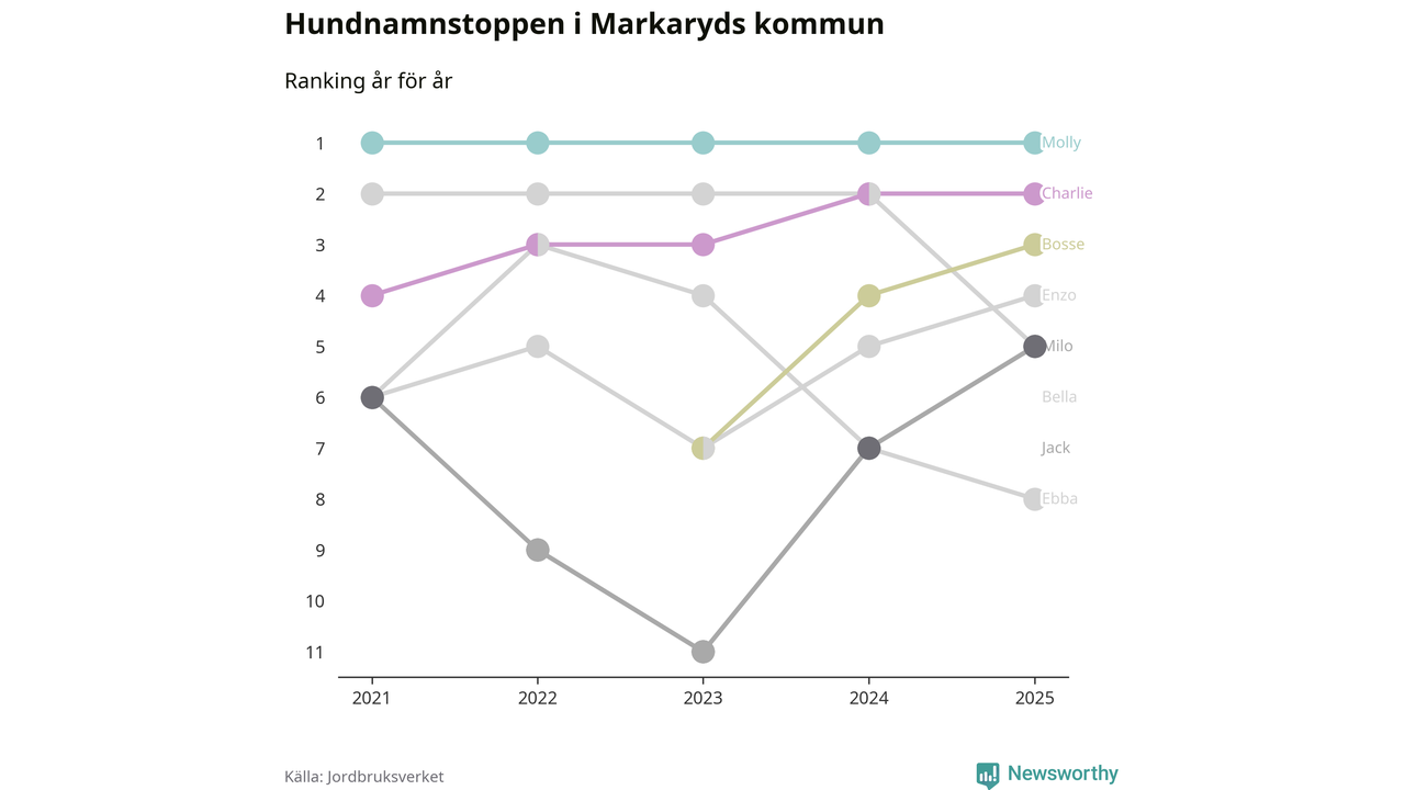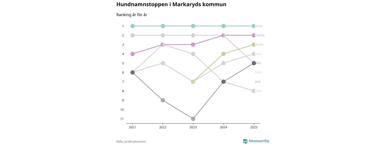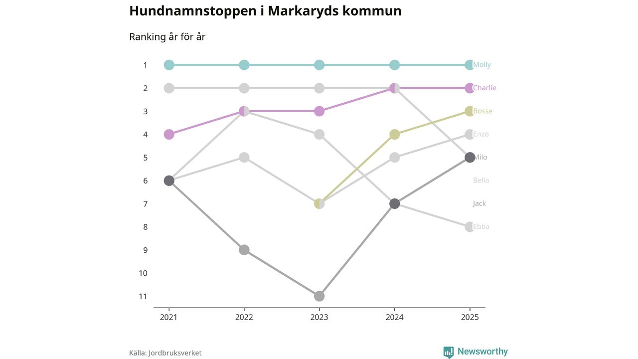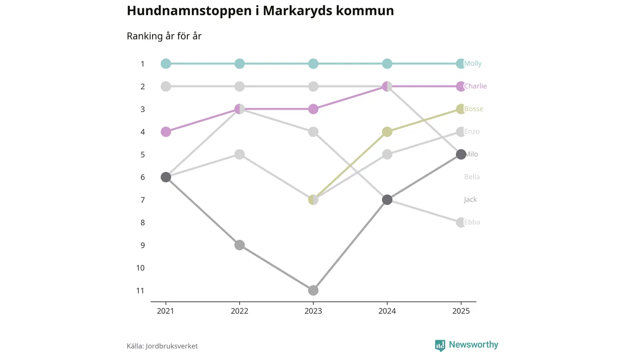 Molly toppar hundnamnsligan i Markaryds kommun, precis som i landet som helhet. Det visar färsk statistik från Jordbruksverket. Här finns hela topplistan för kommunen.