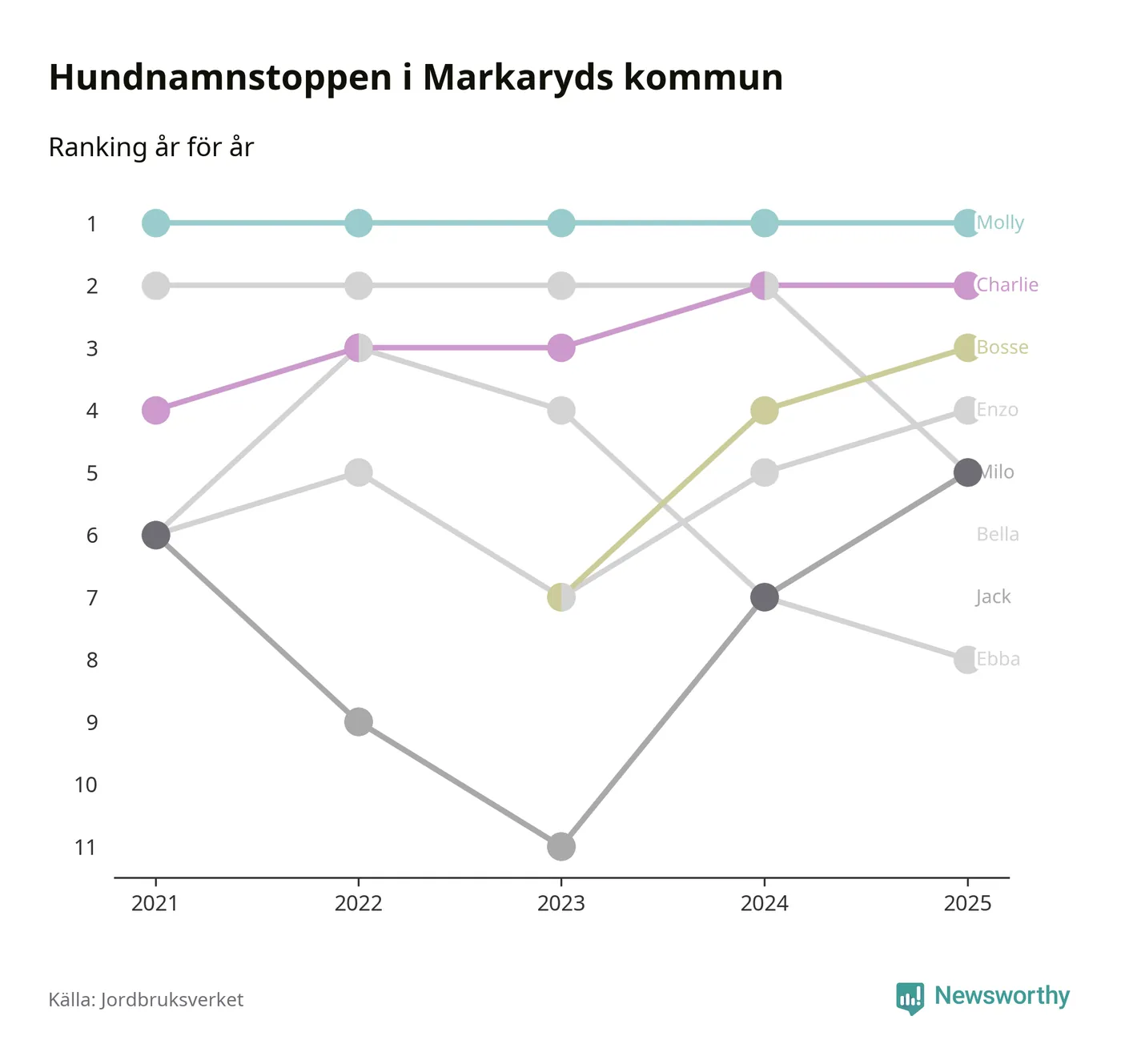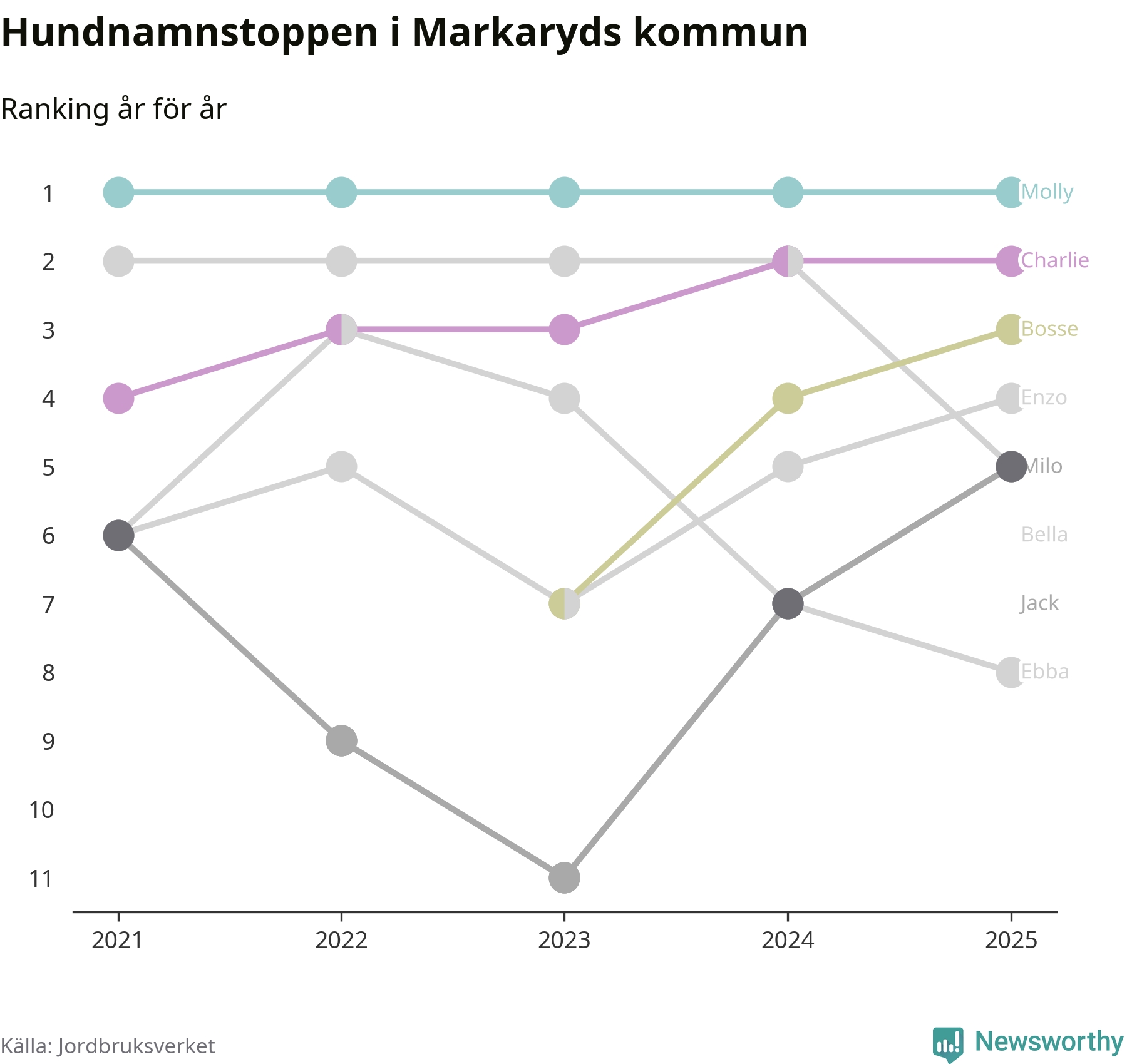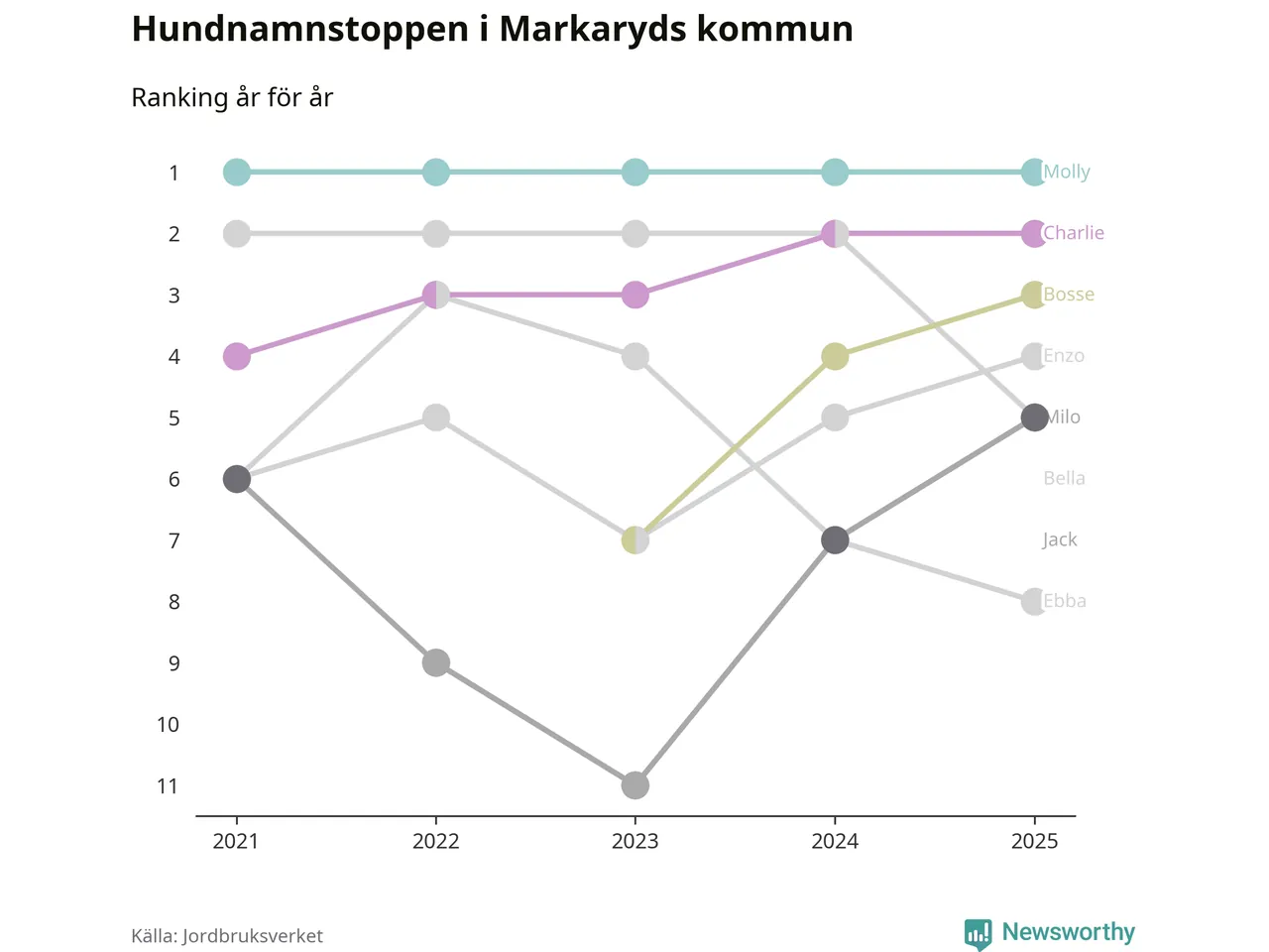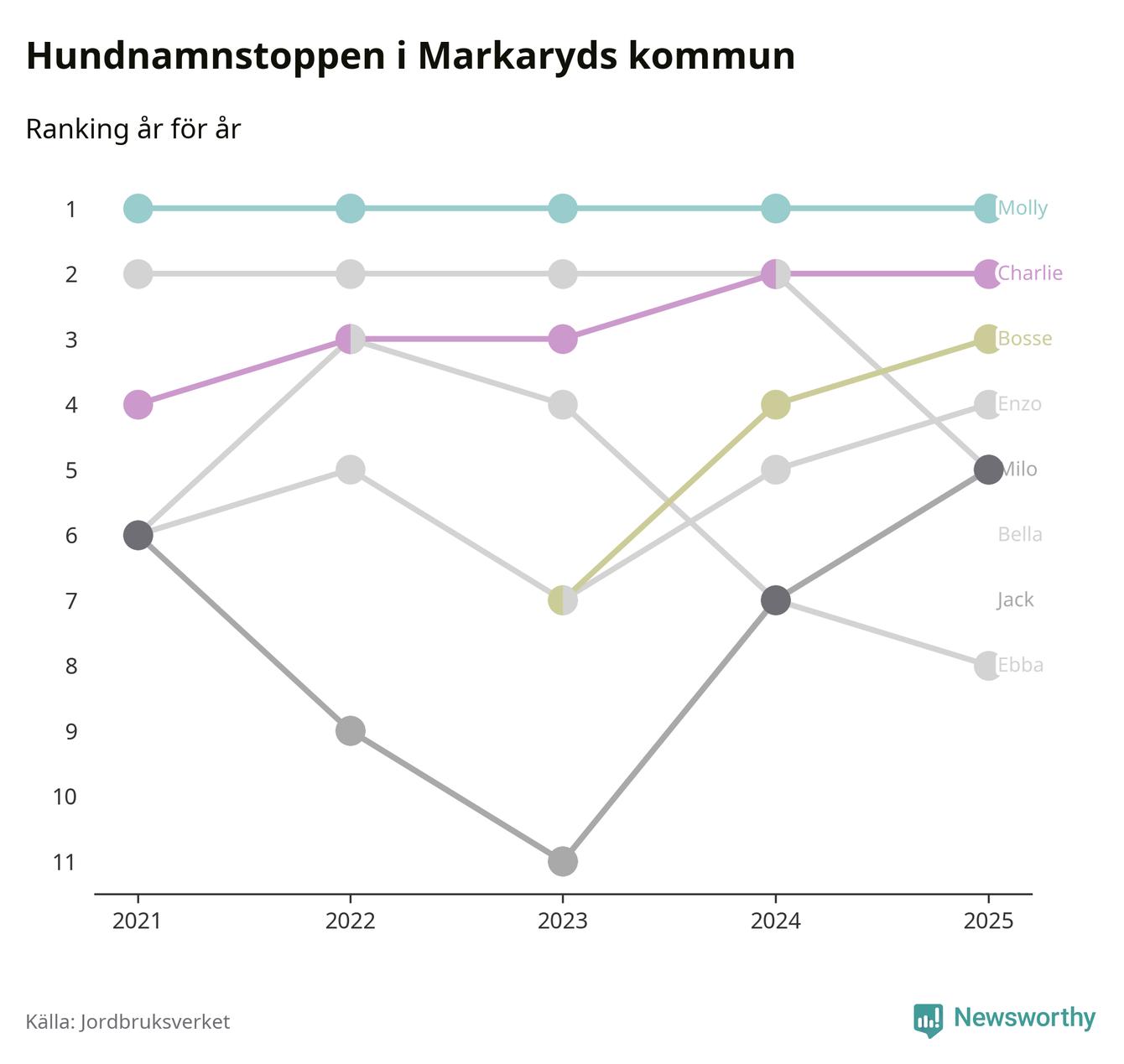Molly toppar hundnamnsligan i Markaryds kommun, precis som i landet som helhet. Det visar färsk statistik från Jordbruksverket. Här finns hela topplistan för kommunen.