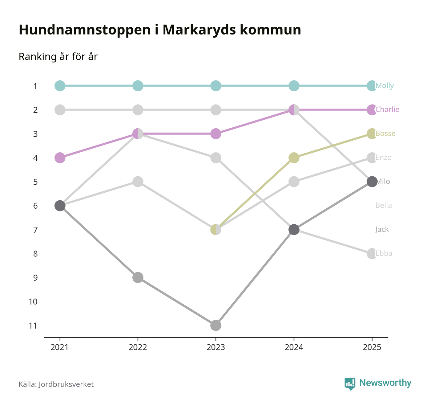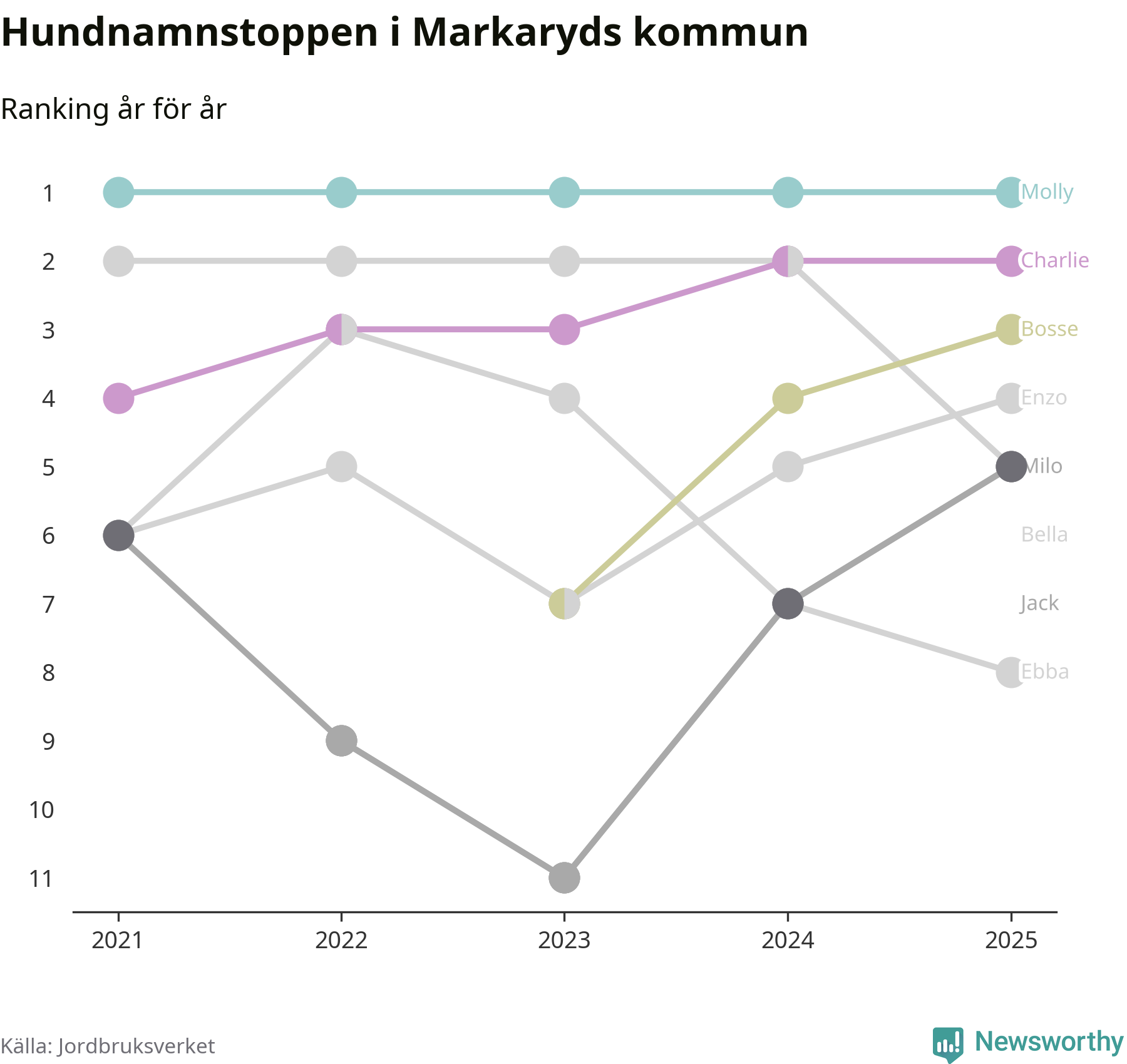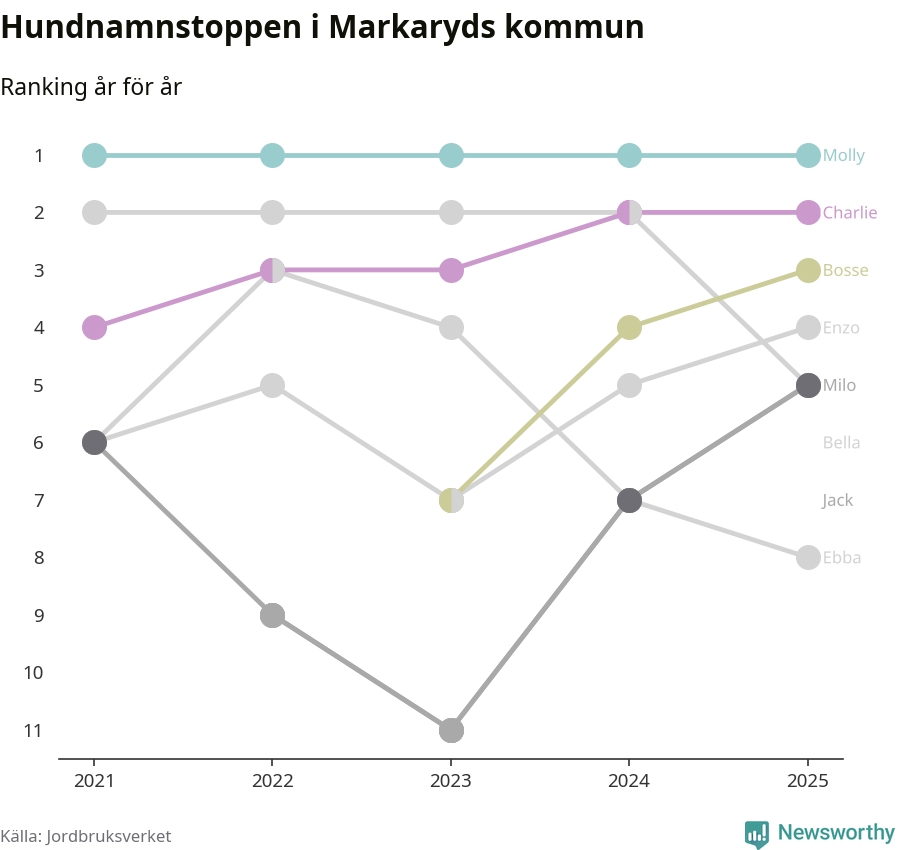 Molly är fortsatt ohotad etta bland hundnamnen i Sverige, följt av Bella och Charlie. Så har det sett ut flera år i rad, och även bland Markarydshundarna ligger alltså Molly i topp.