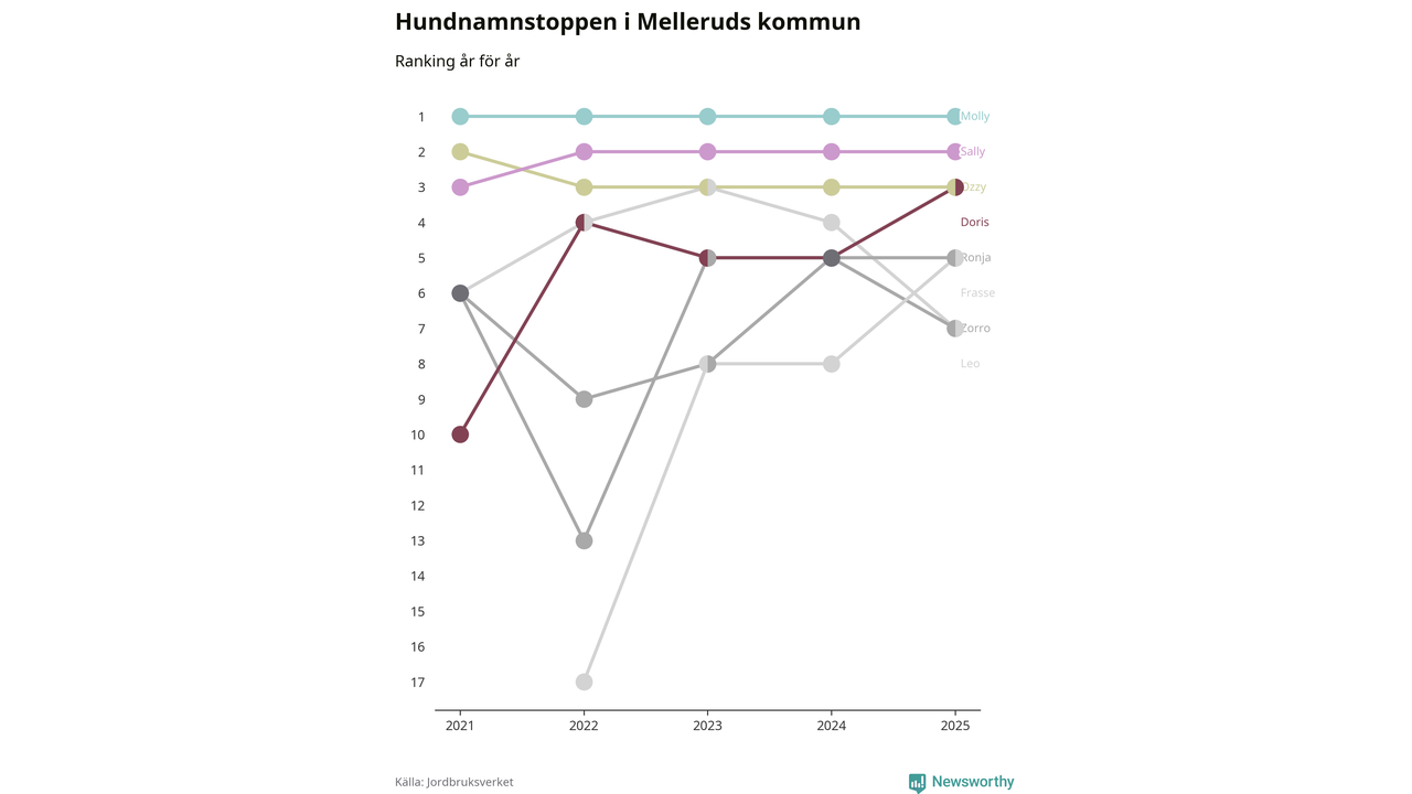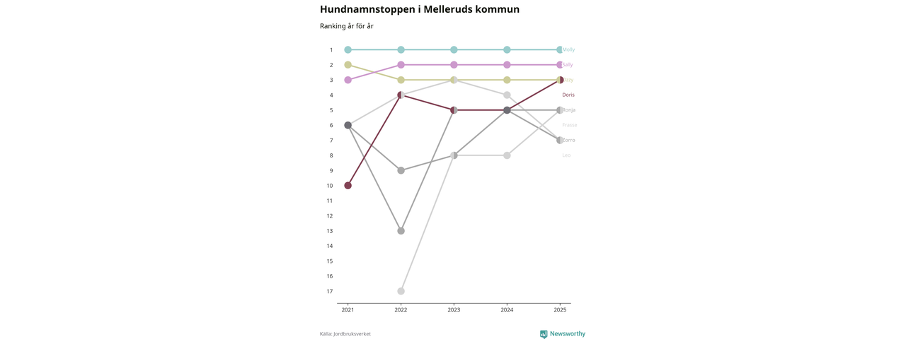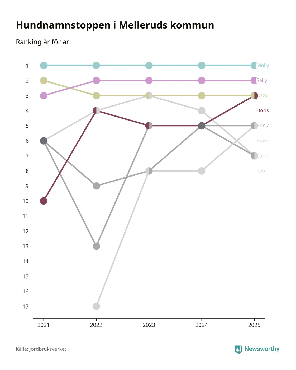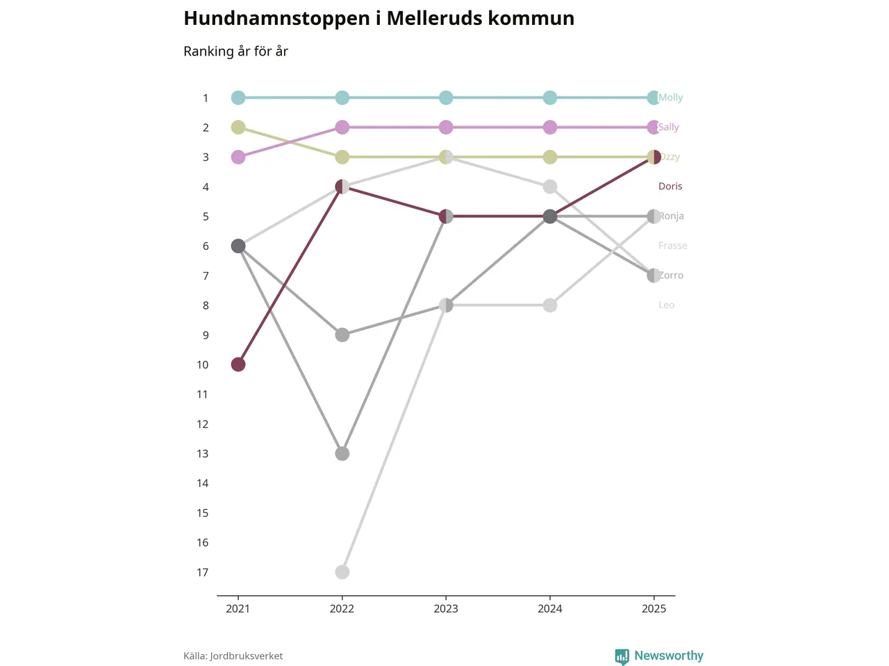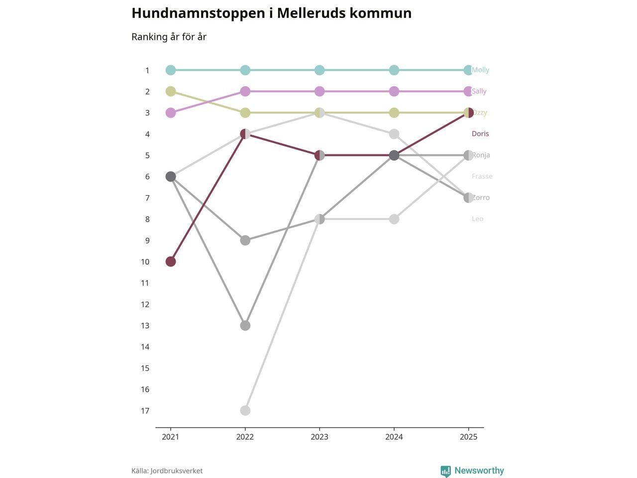 I hela landet är Molly det ohotat populäraste tilltalsnamnet för hundar sedan flera år, följt av Bella och Charlie. Något av de tre namnen toppar listan i 243 av 290 kommuner, och de har varit de vanligaste namnen sedan åtminstone 2018. Men det fjärde populäraste namnet, Doris, knappade in på ledartrion och kommer snart kunna utmana Charlie om tredjeplatsen, om trenden håller i sig.