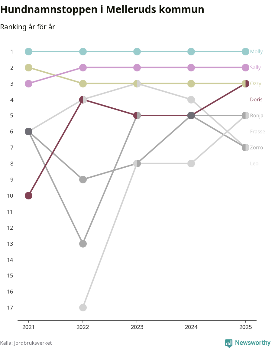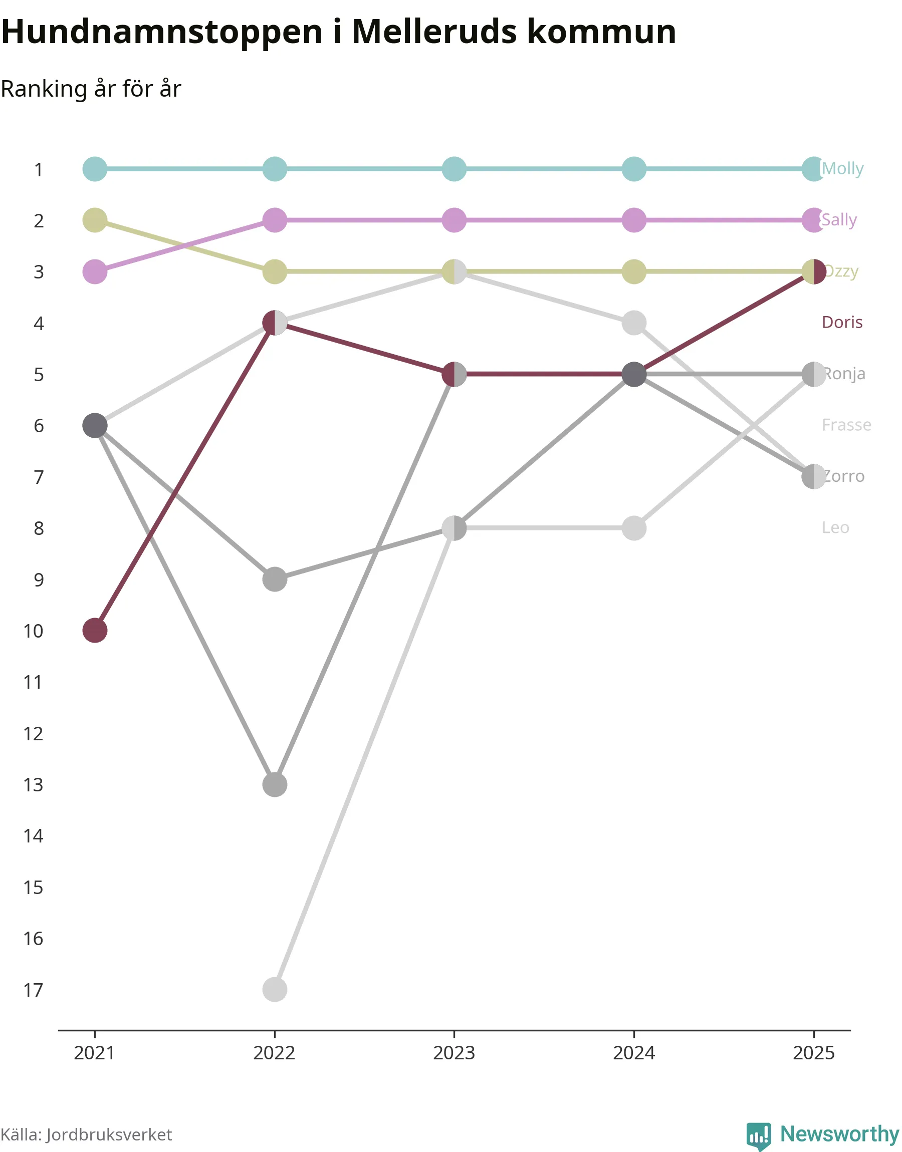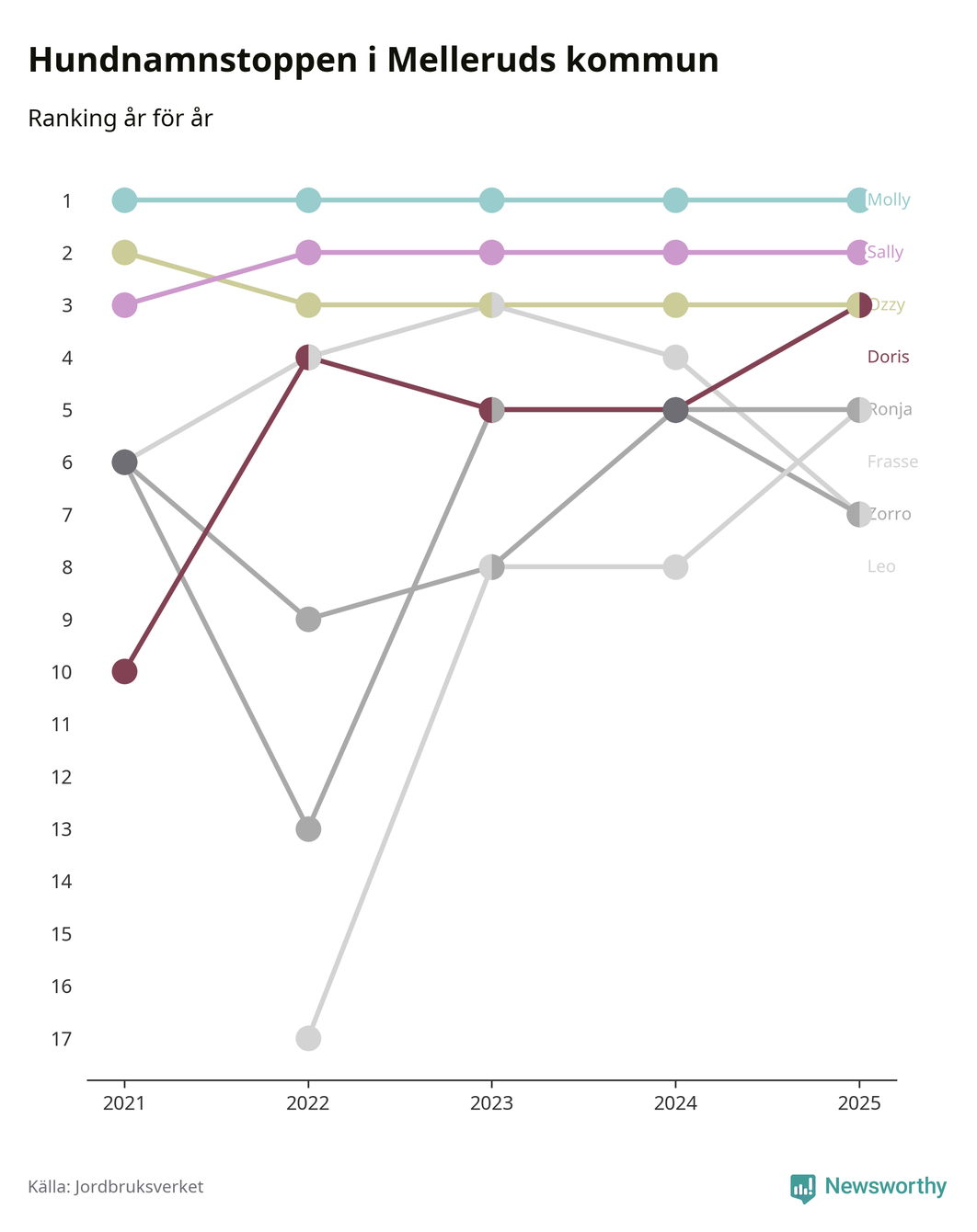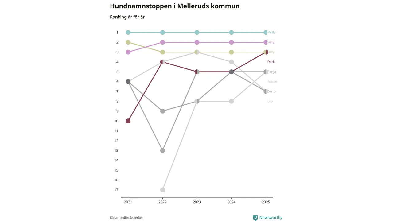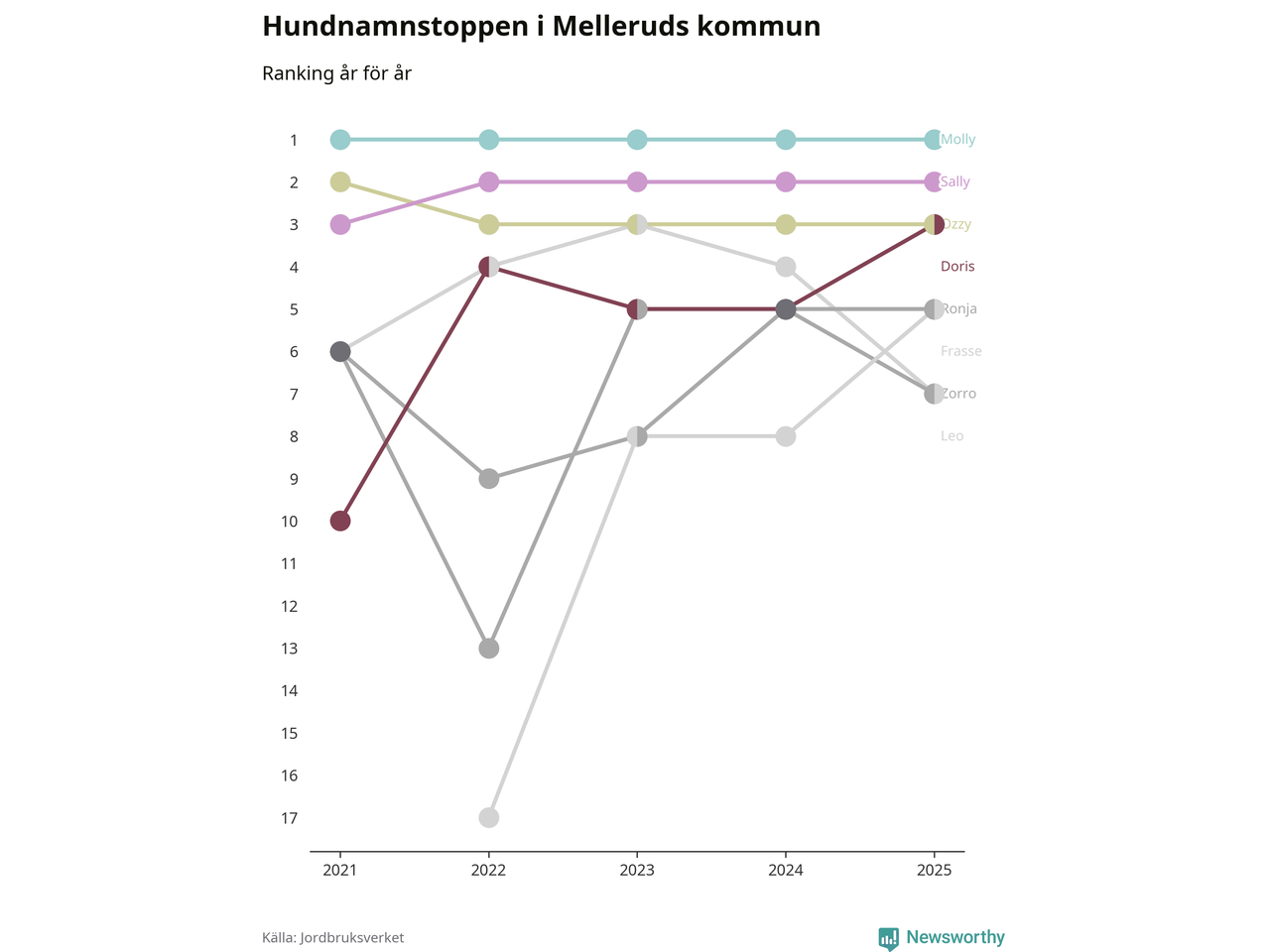 I hela landet är Molly det ohotat populäraste tilltalsnamnet för hundar sedan flera år, följt av Bella och Charlie. Något av de tre namnen toppar listan i 243 av 290 kommuner, och de har varit de vanligaste namnen sedan åtminstone 2018. Men det fjärde populäraste namnet, Doris, knappade in på ledartrion och kommer snart kunna utmana Charlie om tredjeplatsen, om trenden håller i sig.