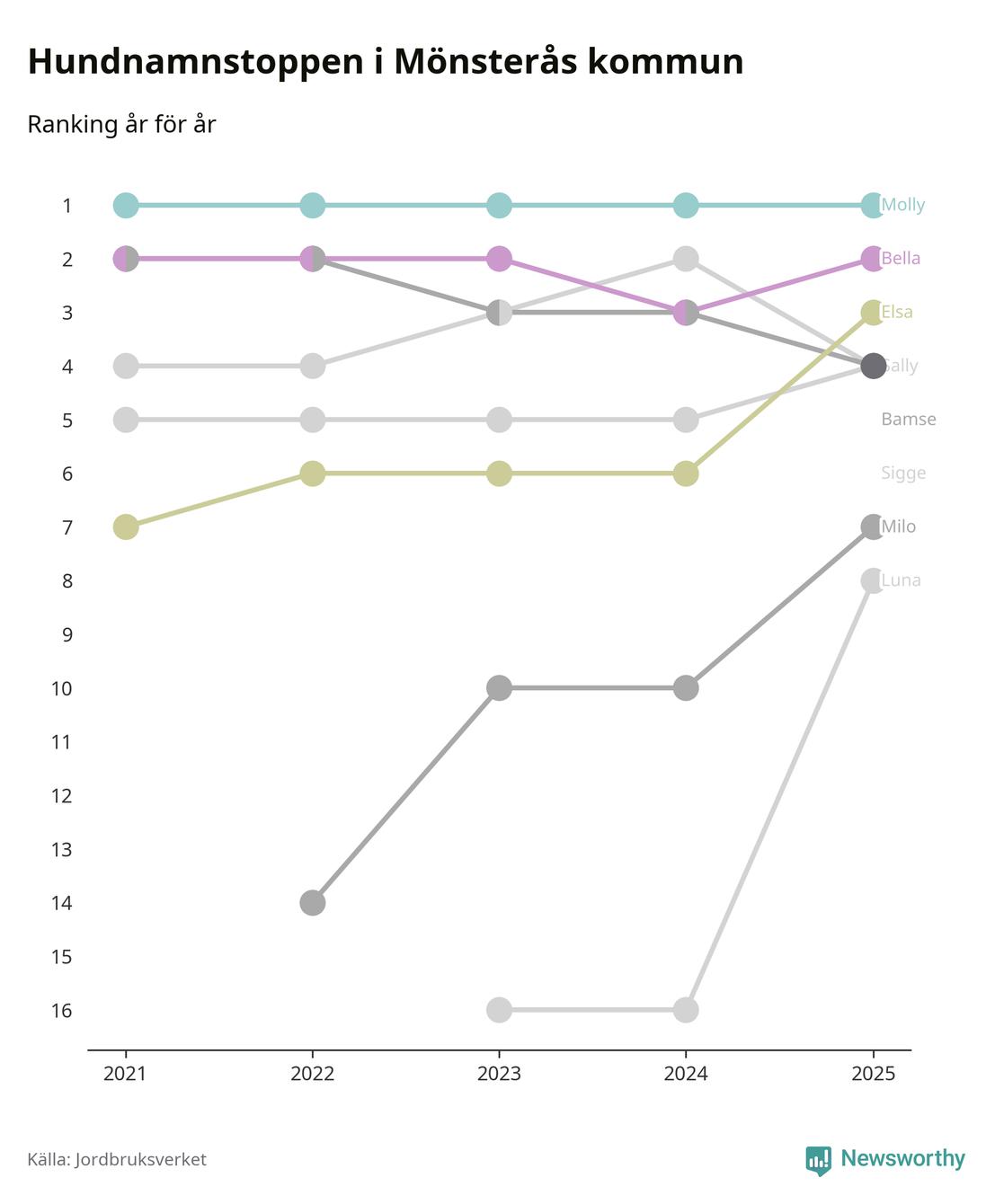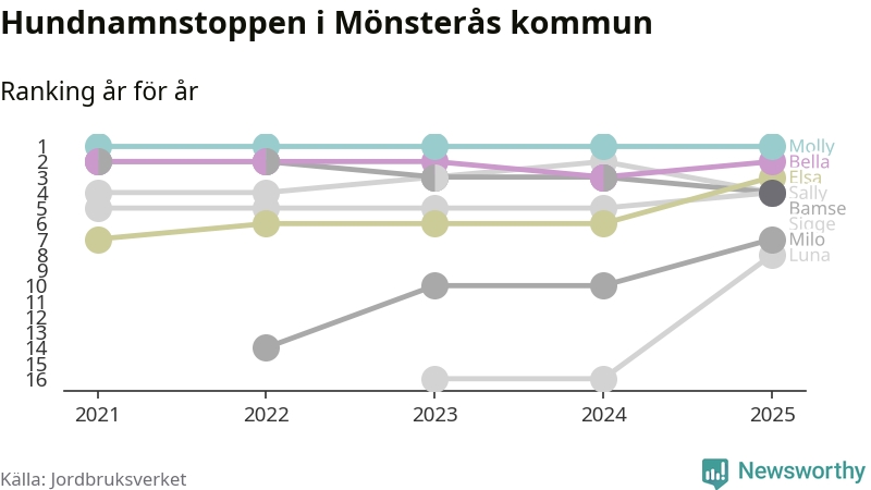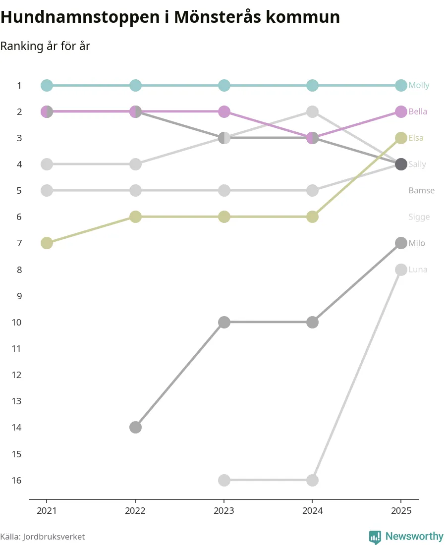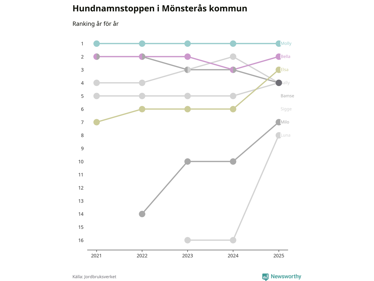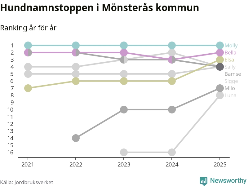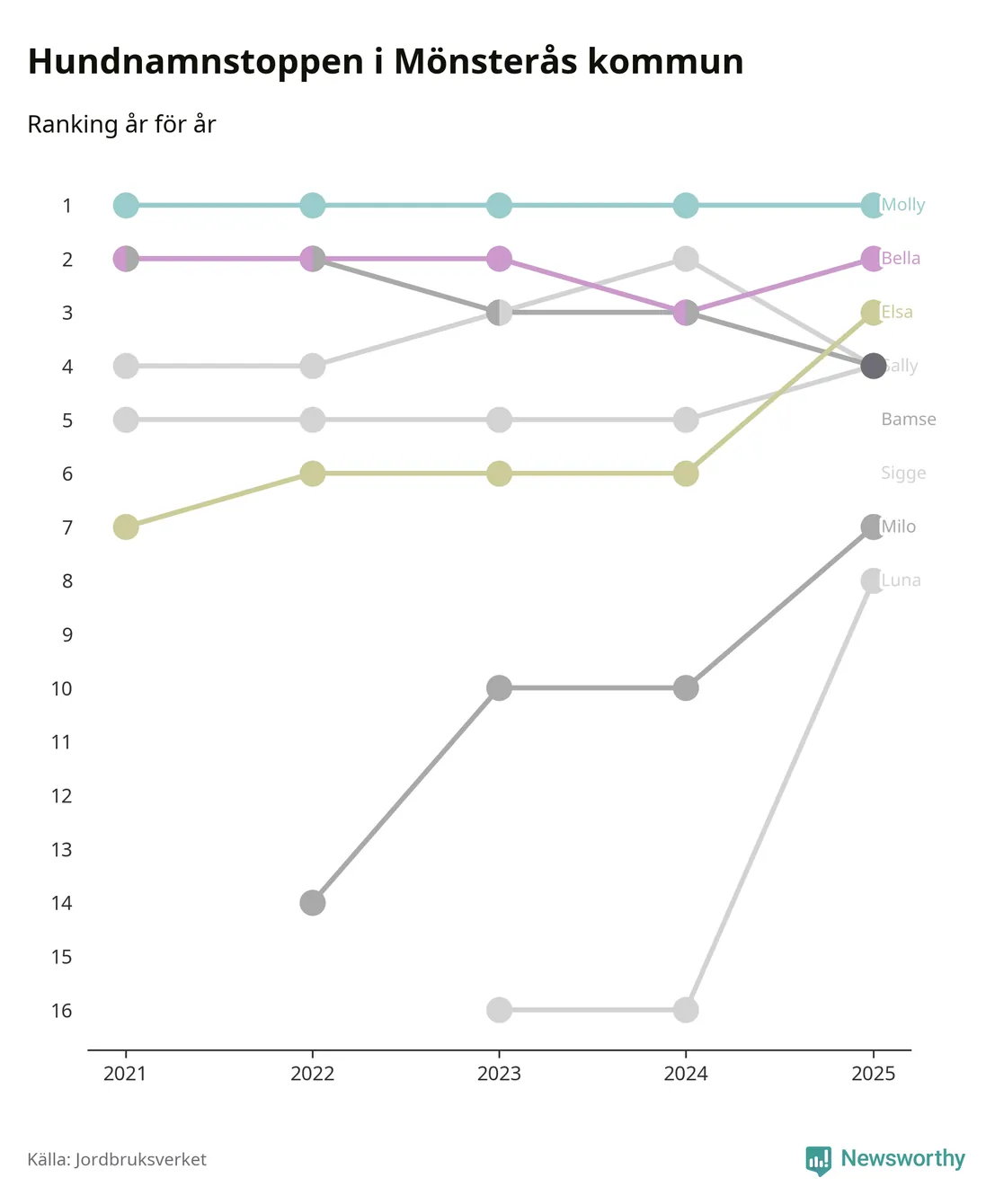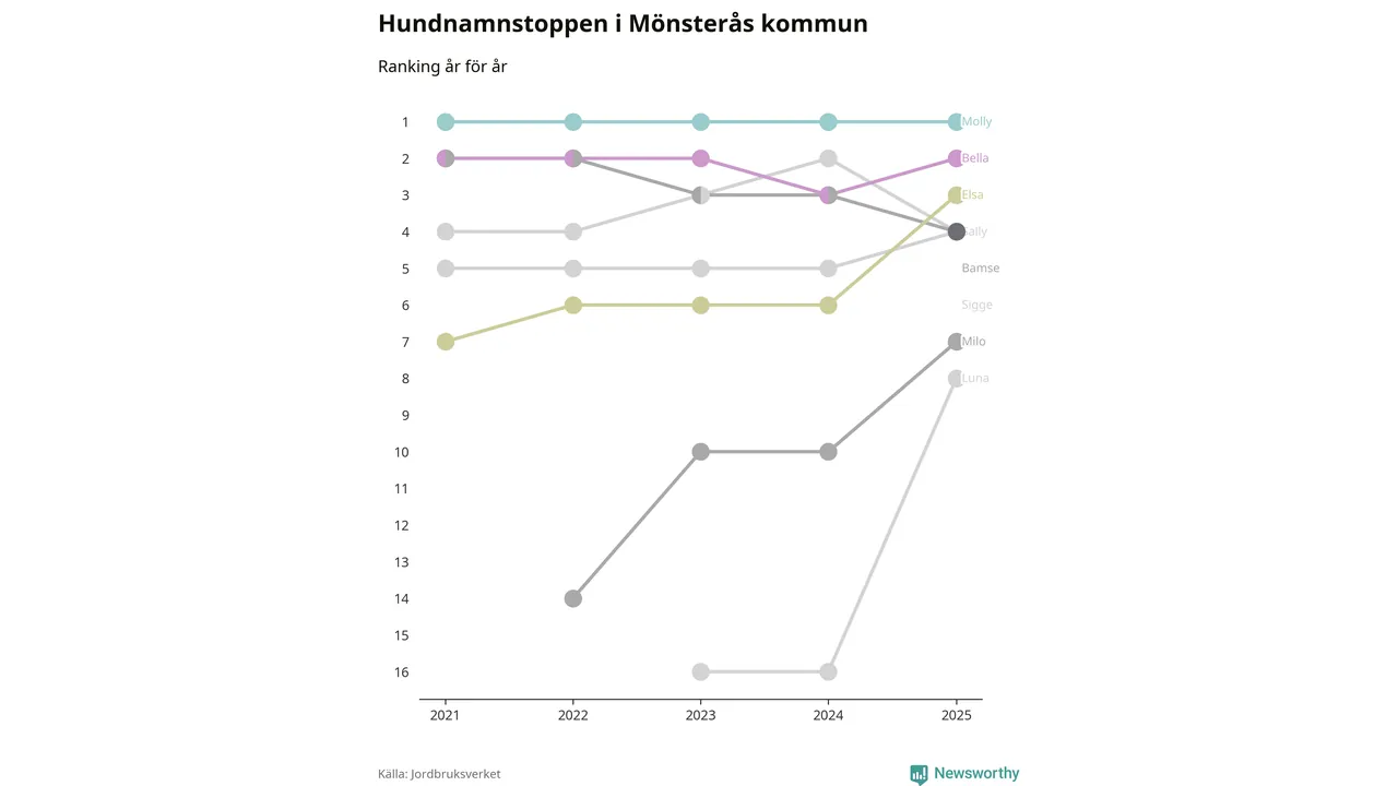 Molly toppar hundnamnsligan i Mönsterås kommun, precis som i landet som helhet. Det visar färsk statistik från Jordbruksverket. Här finns hela topplistan för kommunen.