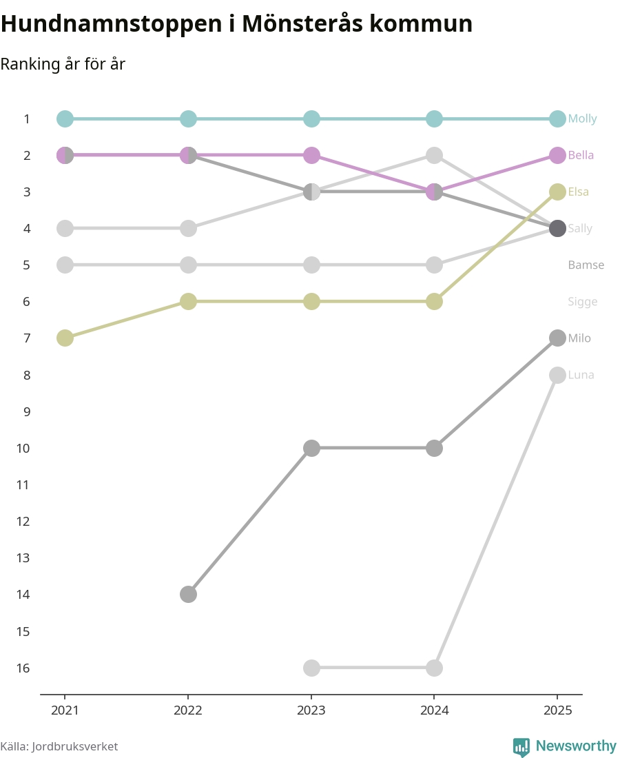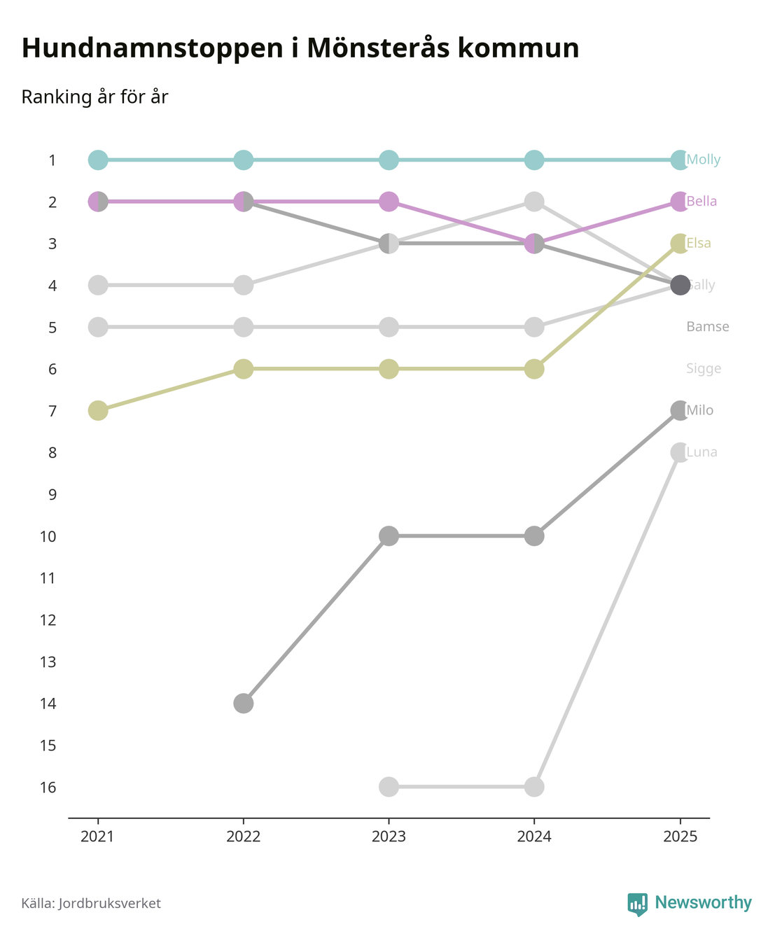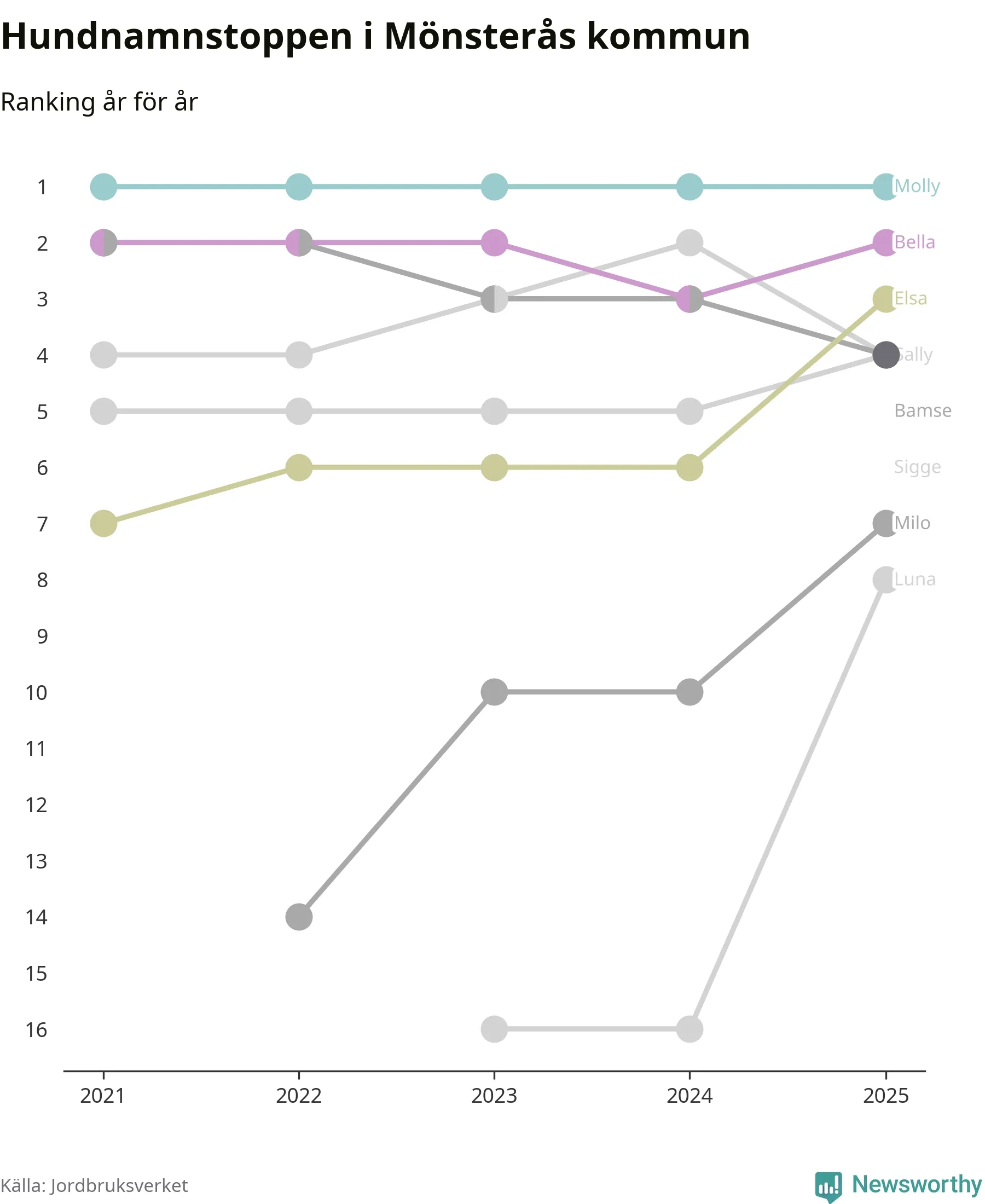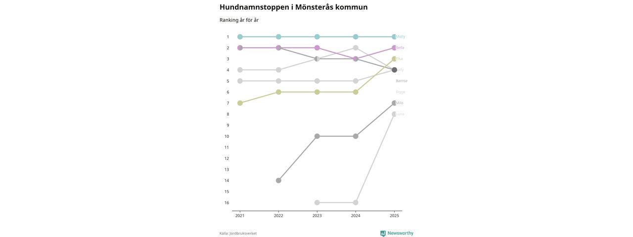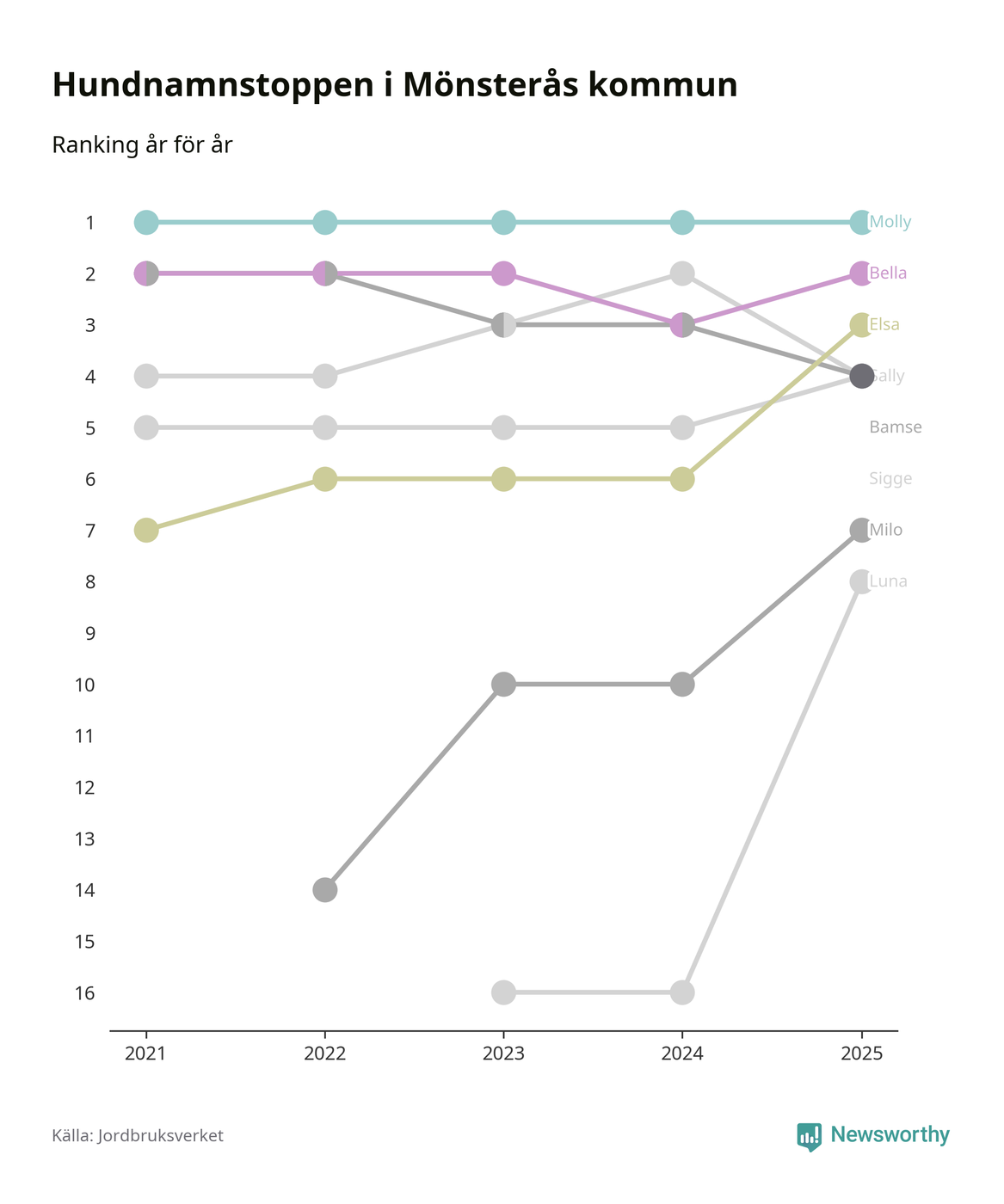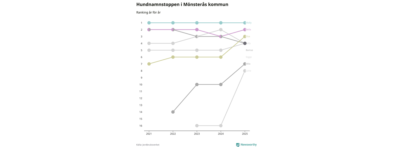 Molly toppar hundnamnsligan i Mönsterås kommun, precis som i landet som helhet. Det visar färsk statistik från Jordbruksverket. Här finns hela topplistan för kommunen.