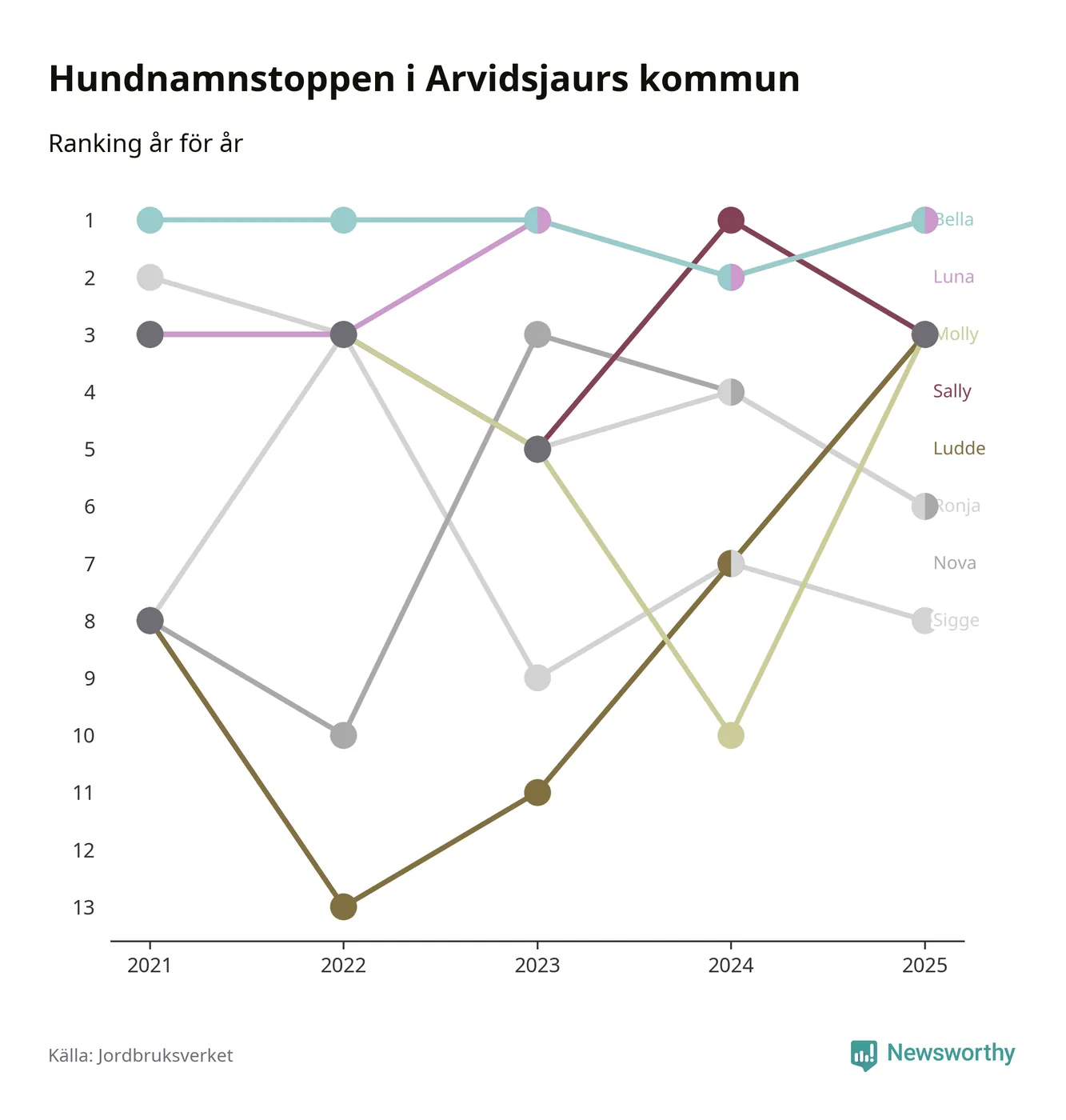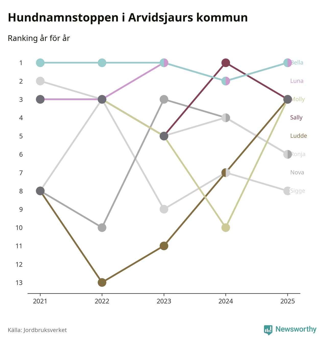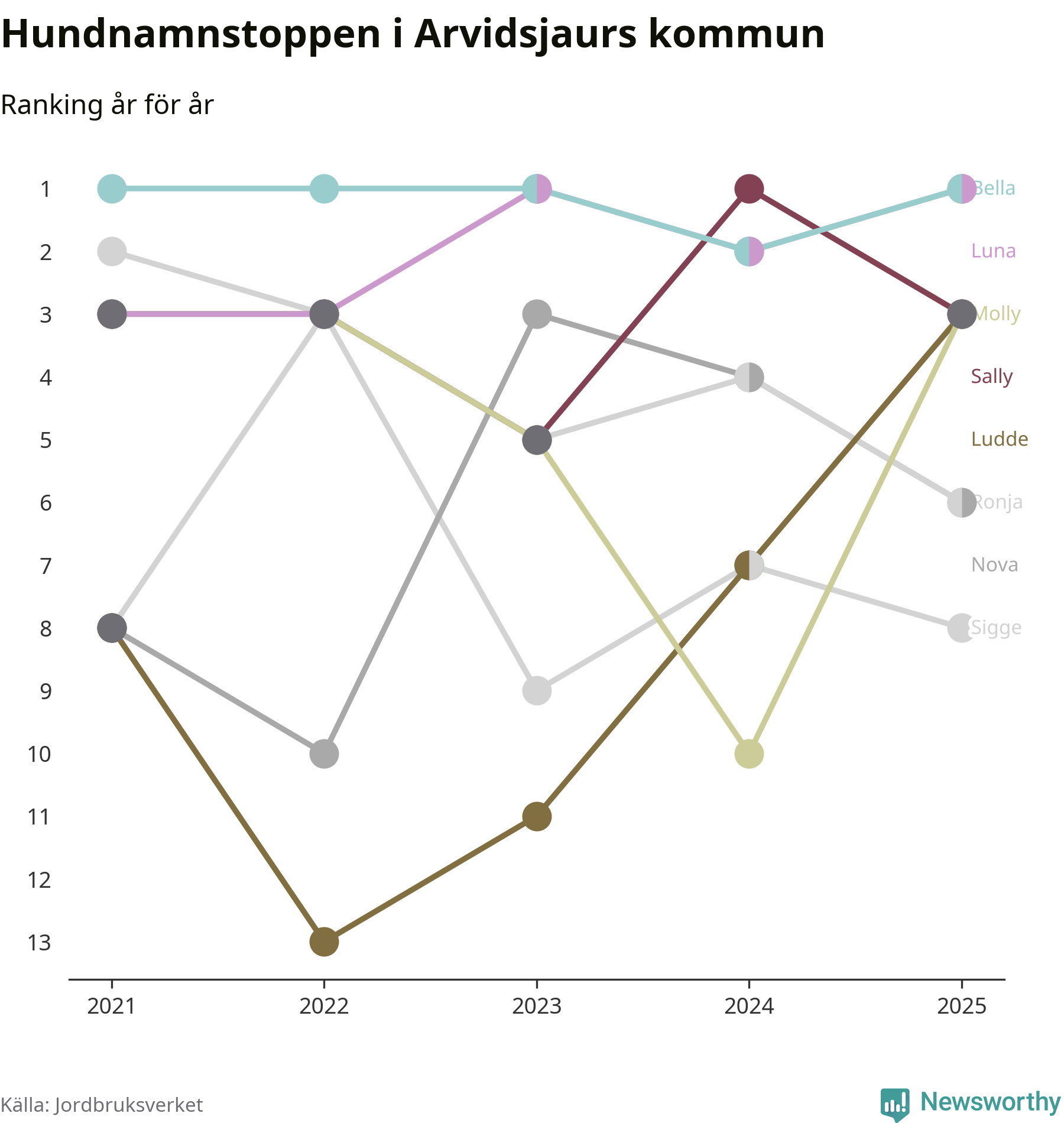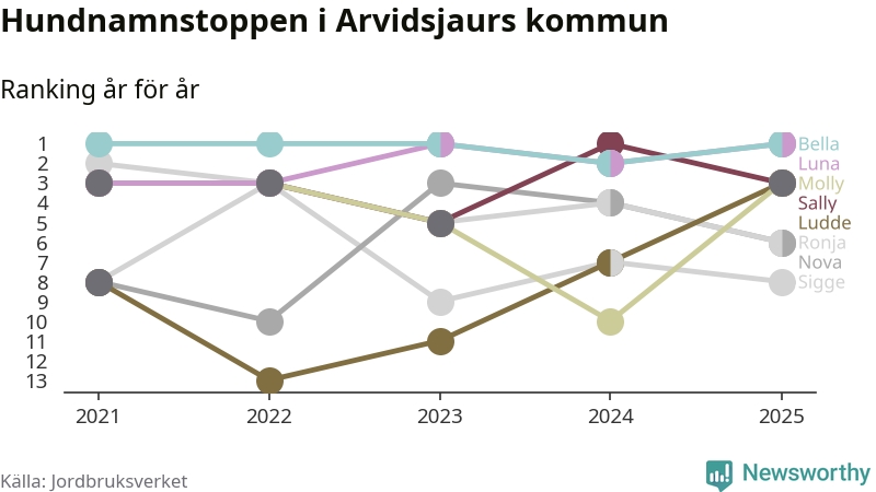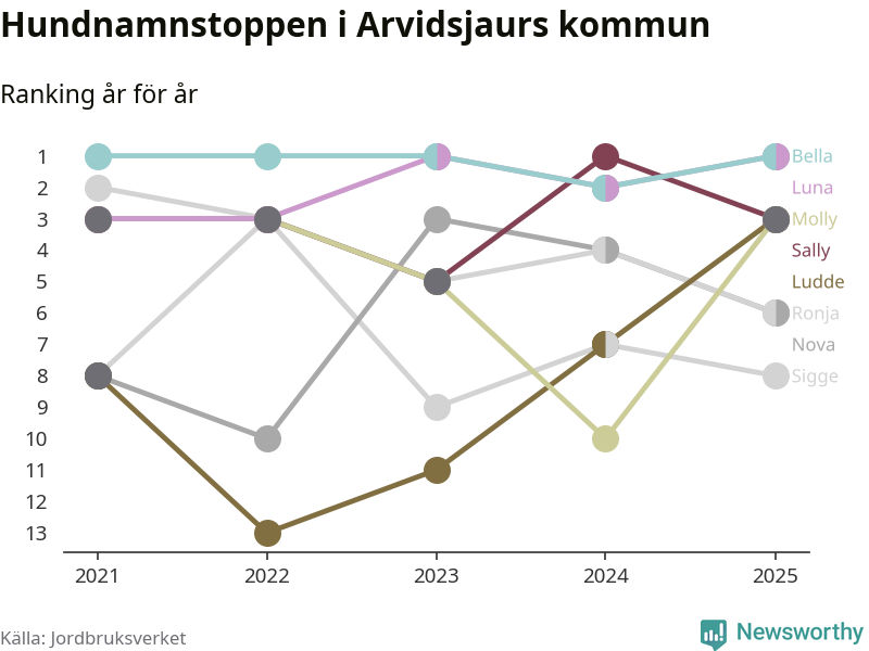 Molly är fortsatt ohotad etta bland hundnamnen i Sverige, följt av Bella och Charlie. Så har det sett ut flera år i rad, men bland Arvidsjaurshundarna är Bella och Luna populärast. Arvidsjaur är en av elva kommuner i landet där Luna är vanligast, eller på delad förstaplats.