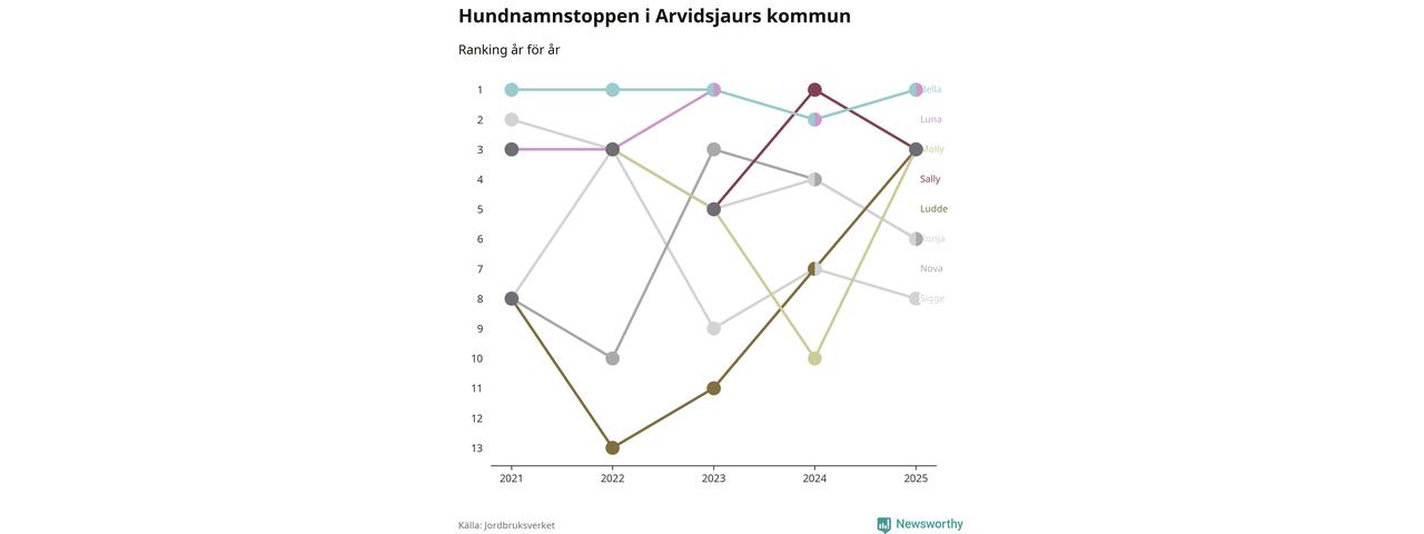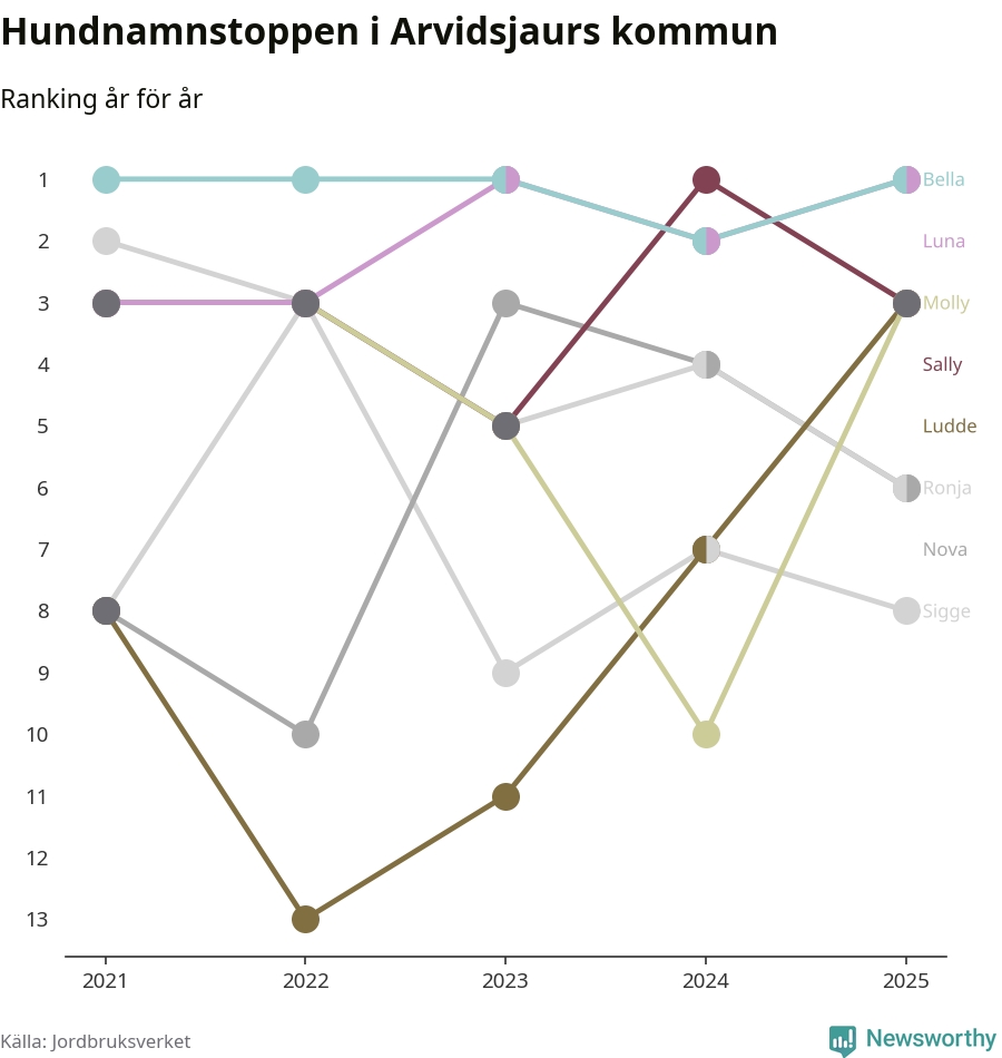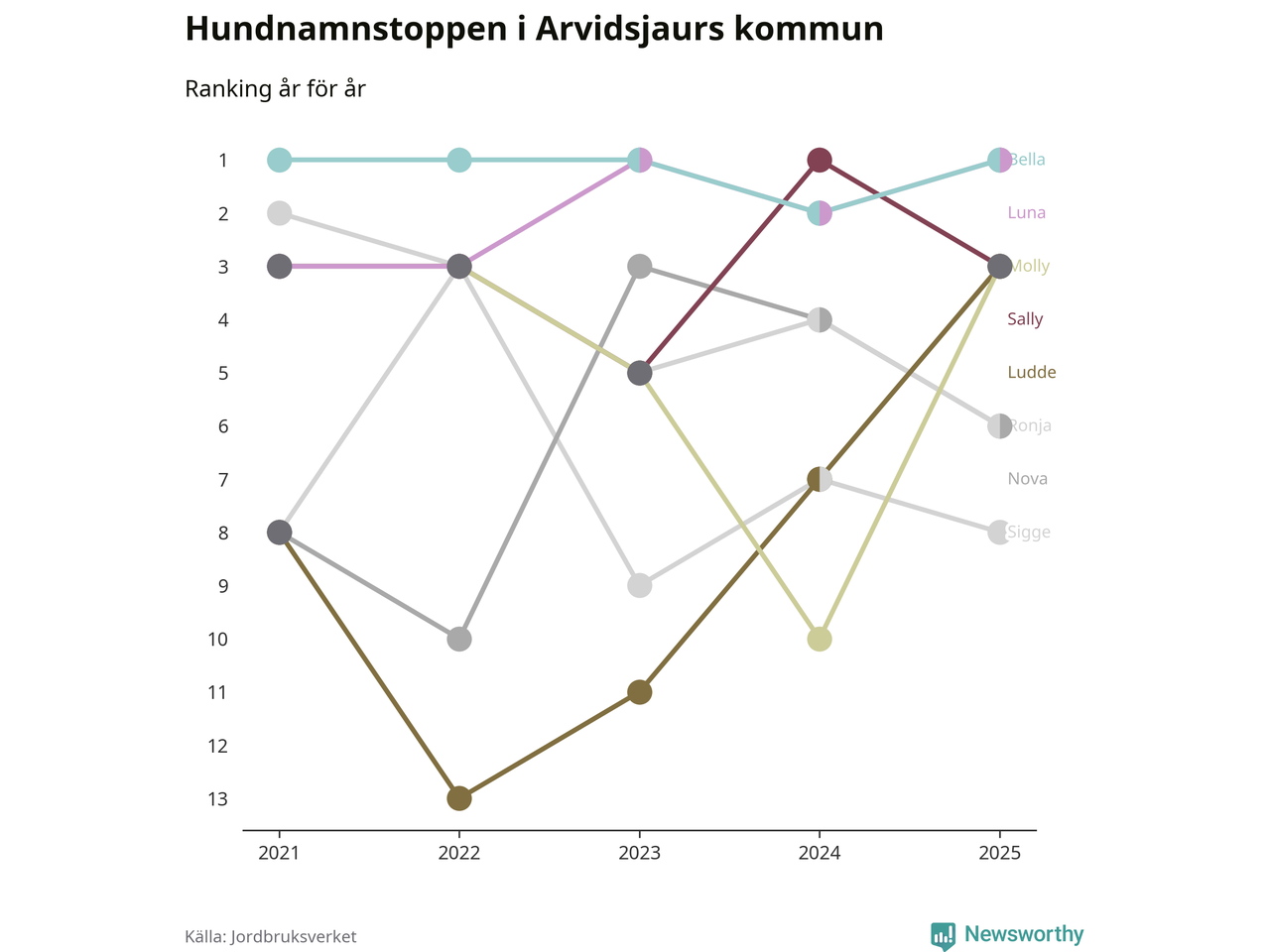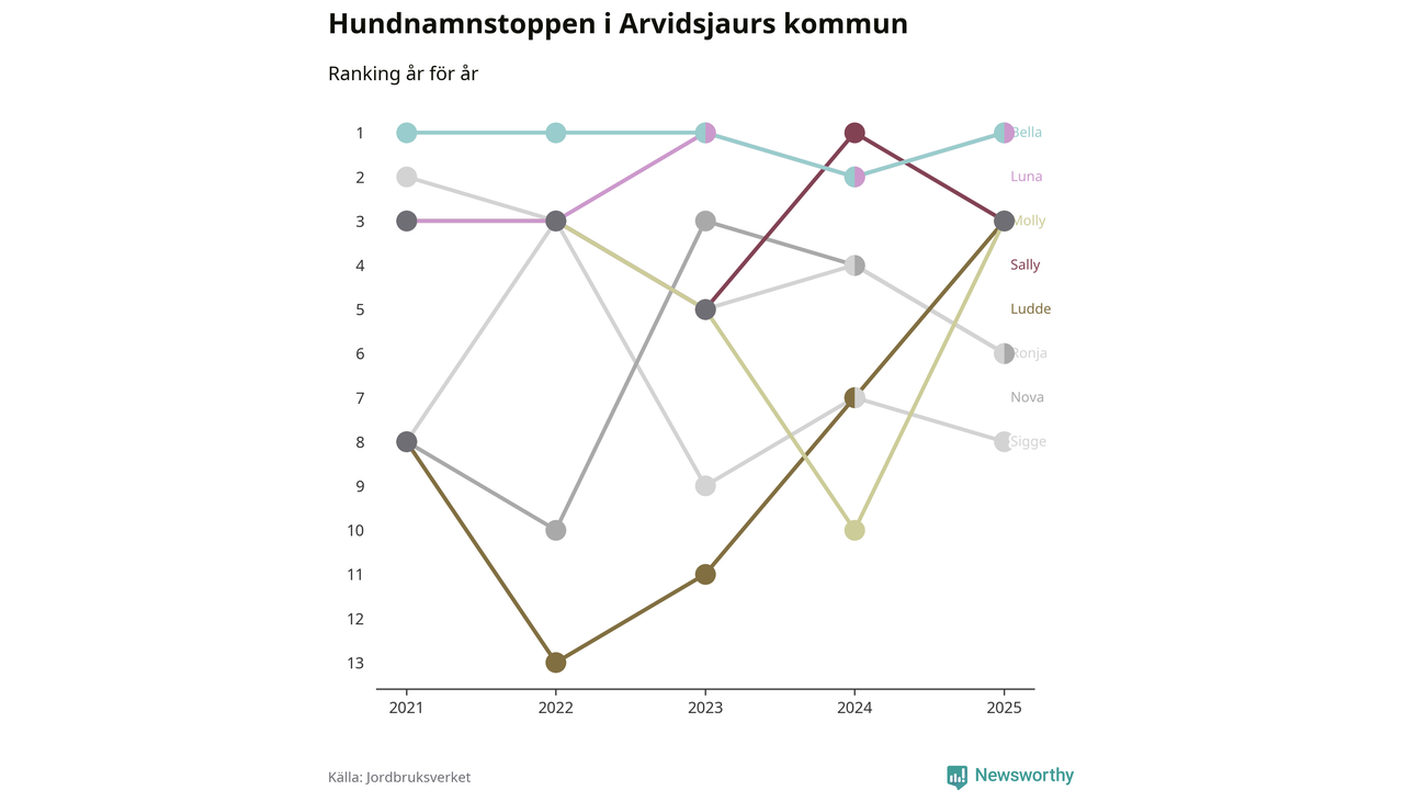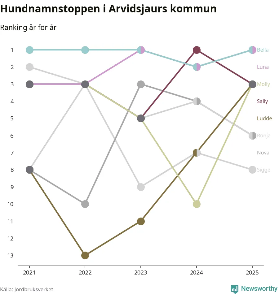 Molly är fortsatt ohotad etta bland hundnamnen i Sverige, följt av Bella och Charlie. Så har det sett ut flera år i rad, men bland Arvidsjaurshundarna är Bella och Luna populärast. Arvidsjaur är en av elva kommuner i landet där Luna är vanligast, eller på delad förstaplats.