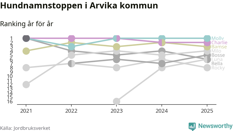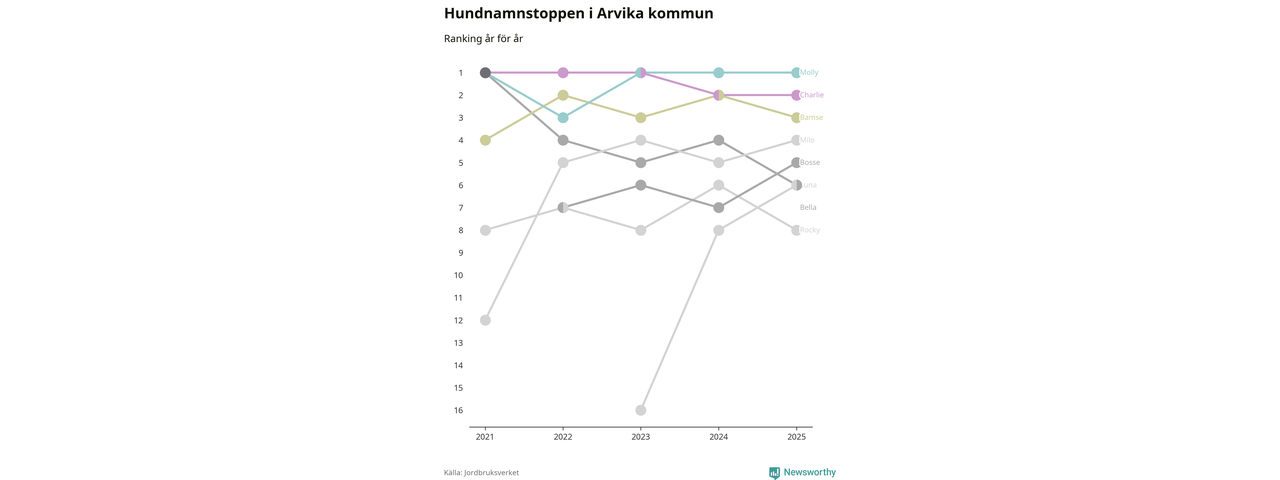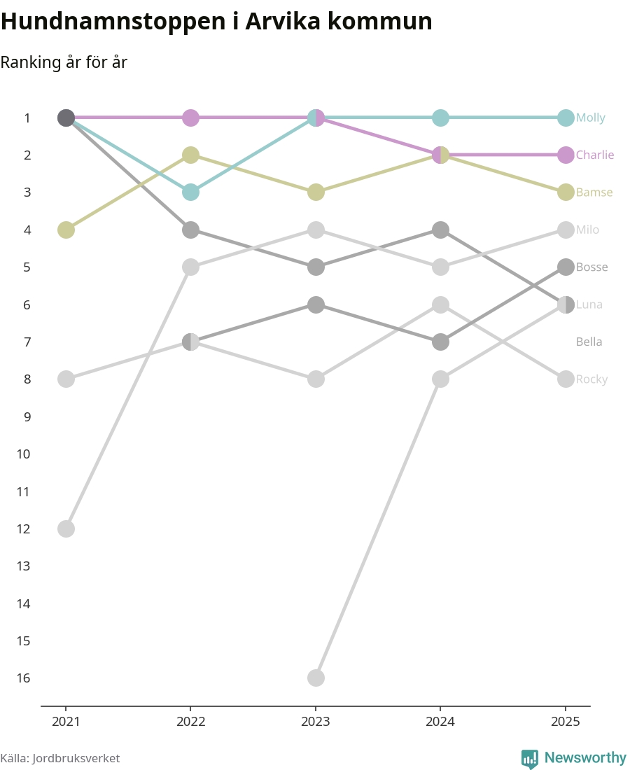 Molly är fortsatt ohotad etta bland hundnamnen i Sverige, följt av Bella och Charlie. Så har det sett ut flera år i rad, och även bland Arvikahundarna ligger alltså Molly i topp.