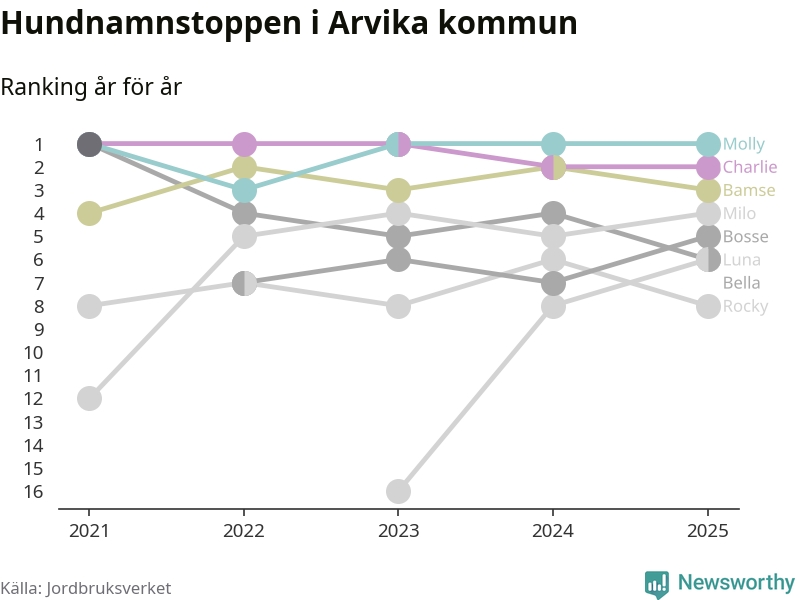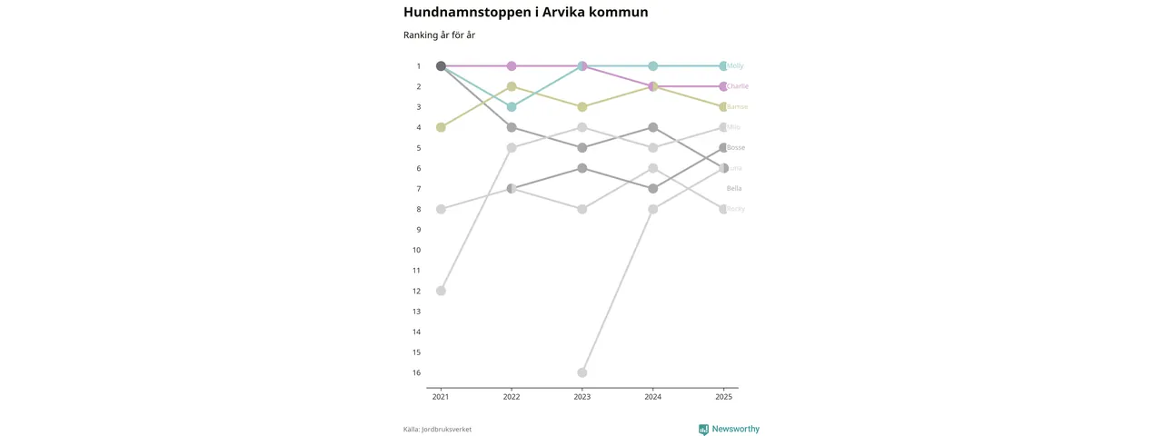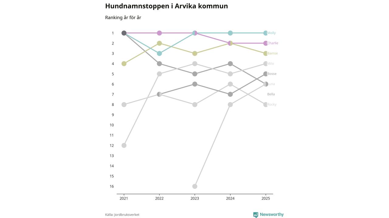 Molly toppar hundnamnsligan i Arvika kommun, precis som i landet som helhet. Det visar färsk statistik från Jordbruksverket. Här finns hela topplistan för kommunen.