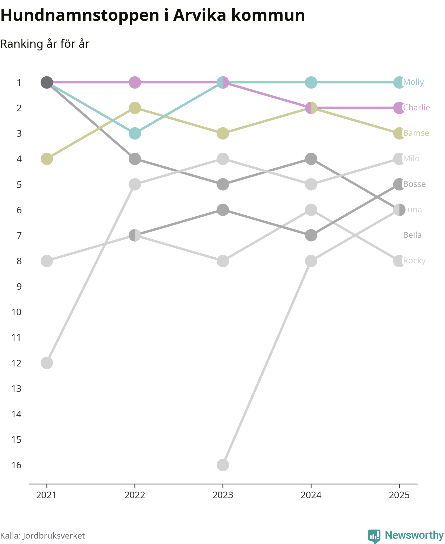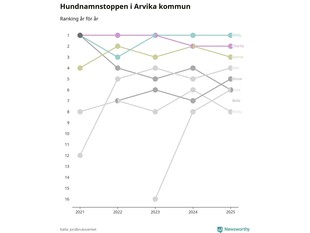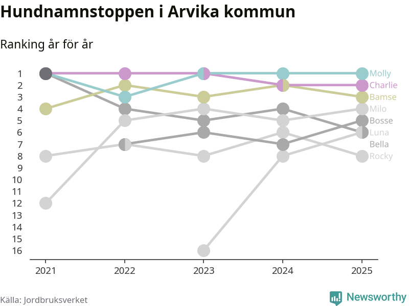 I hela landet är Molly det ohotat populäraste tilltalsnamnet för hundar sedan flera år, följt av Bella och Charlie. Något av de tre namnen toppar listan i 243 av 290 kommuner, och de har varit de vanligaste namnen sedan åtminstone 2018. Men det fjärde populäraste namnet, Doris, knappade in på ledartrion och kommer snart kunna utmana Charlie om tredjeplatsen, om trenden håller i sig.