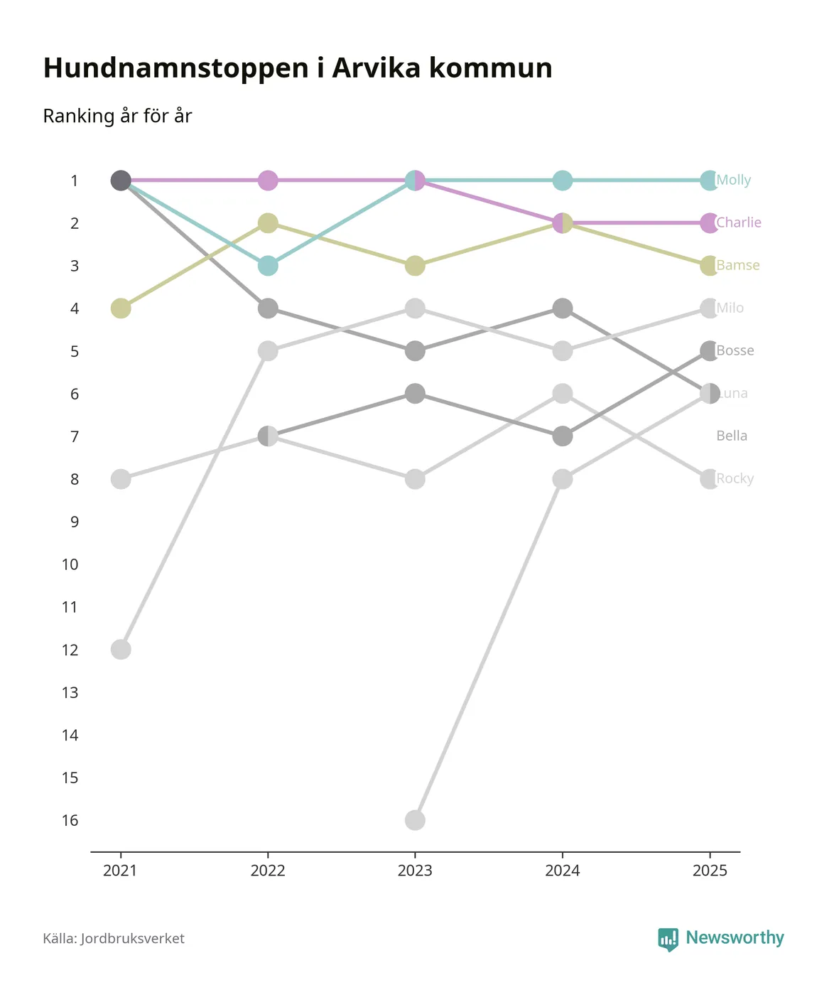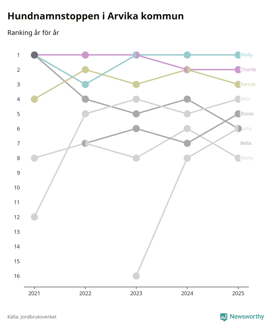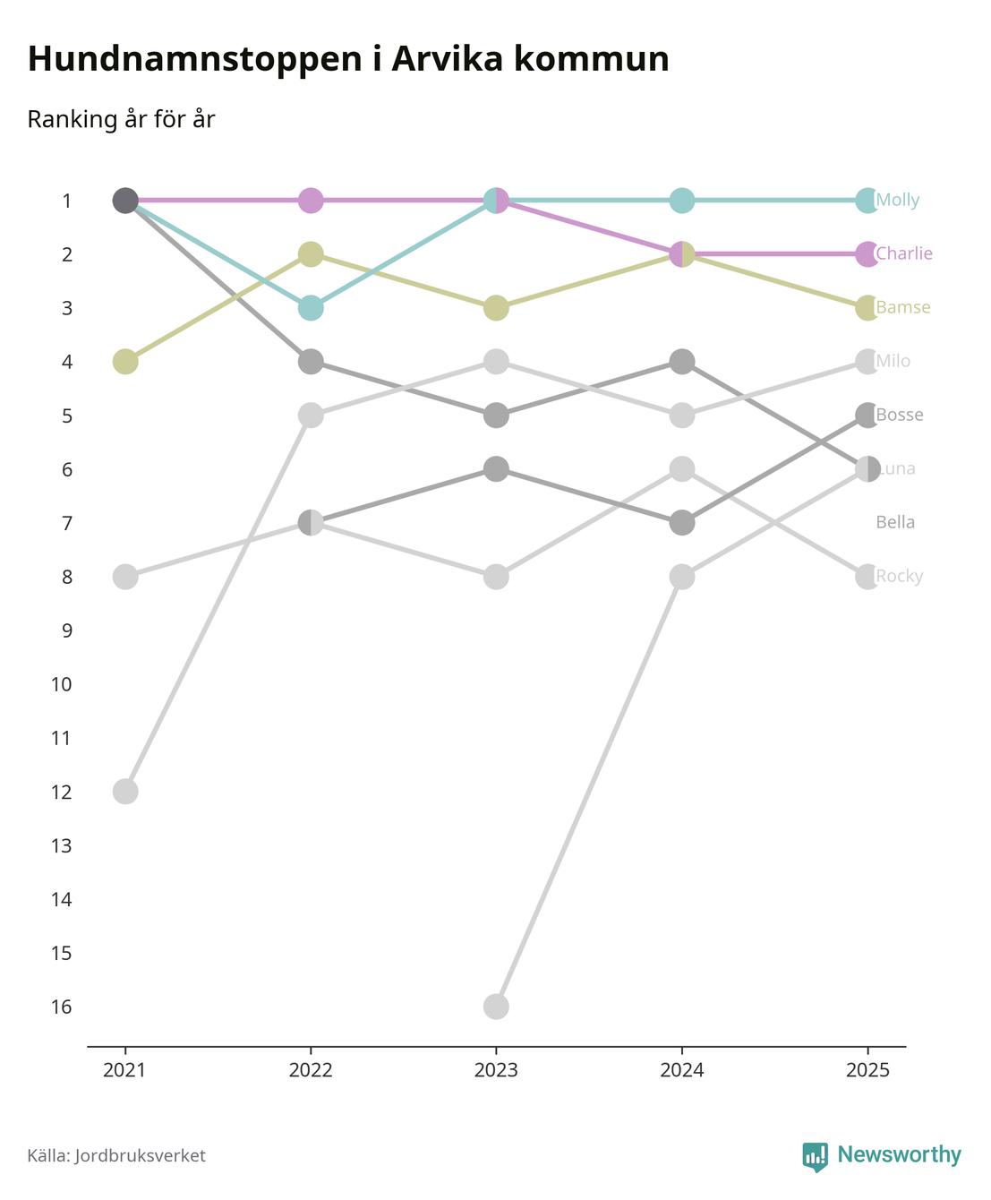 I hela landet är Molly det ohotat populäraste tilltalsnamnet för hundar sedan flera år, följt av Bella och Charlie. Något av de tre namnen toppar listan i 243 av 290 kommuner, och de har varit de vanligaste namnen sedan åtminstone 2018. Men det fjärde populäraste namnet, Doris, knappade in på ledartrion och kommer snart kunna utmana Charlie om tredjeplatsen, om trenden håller i sig.