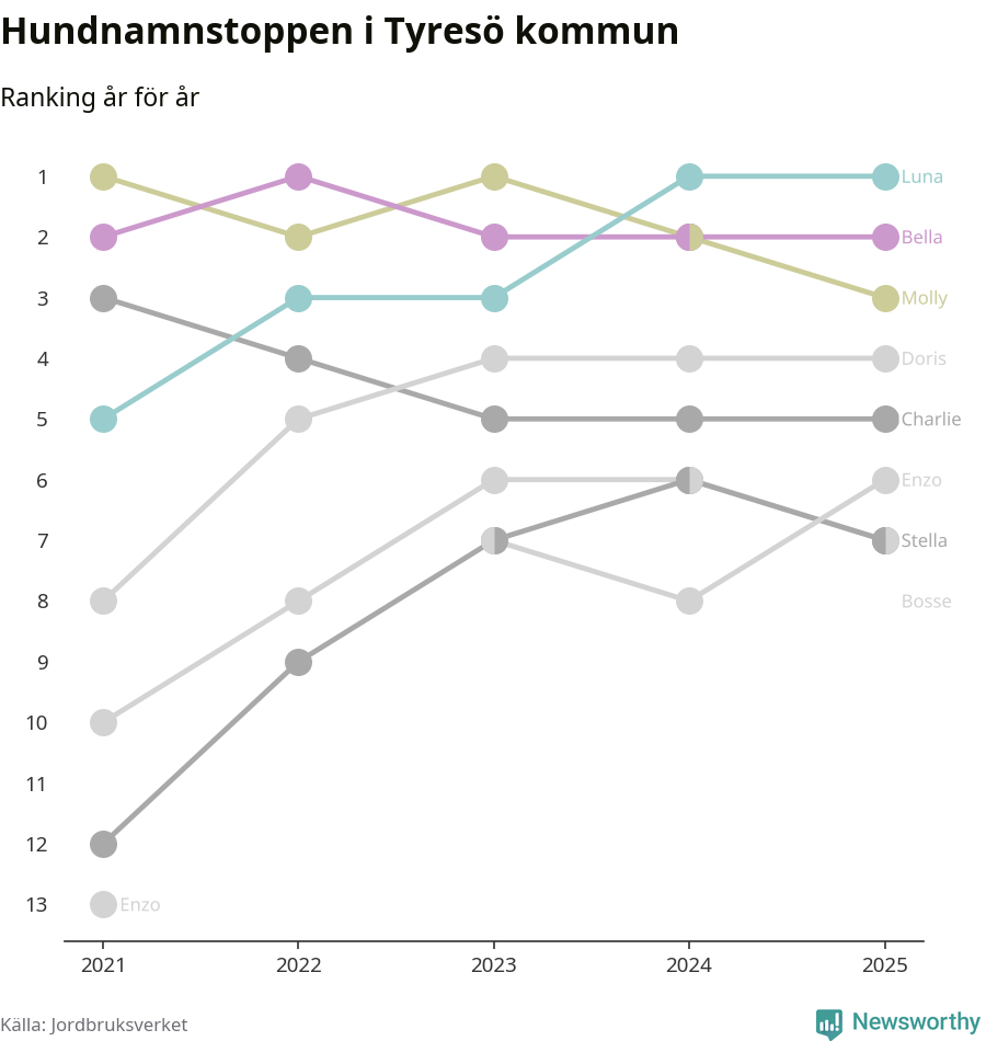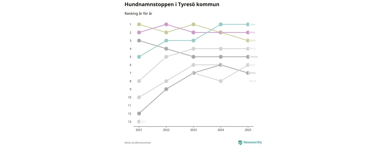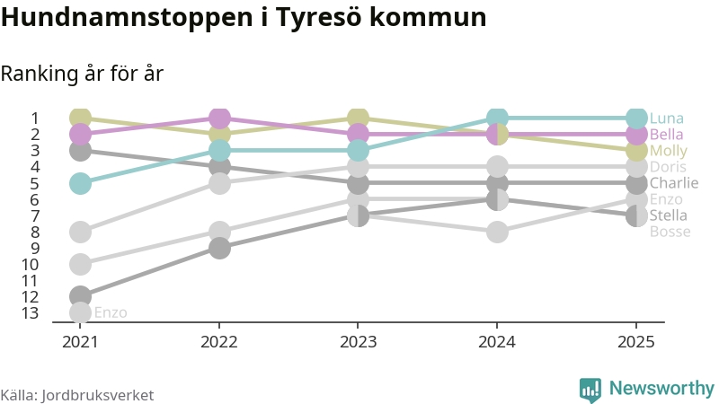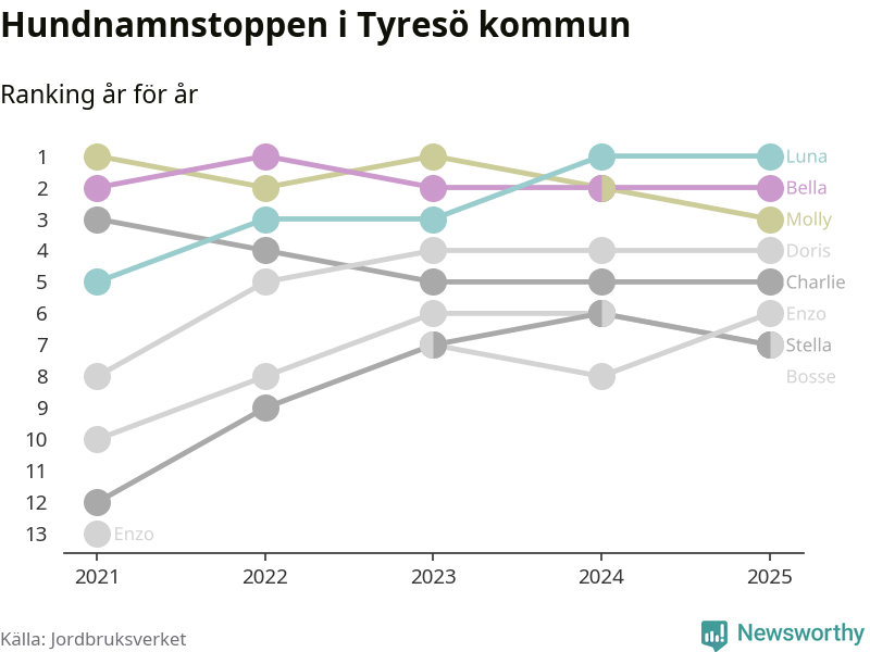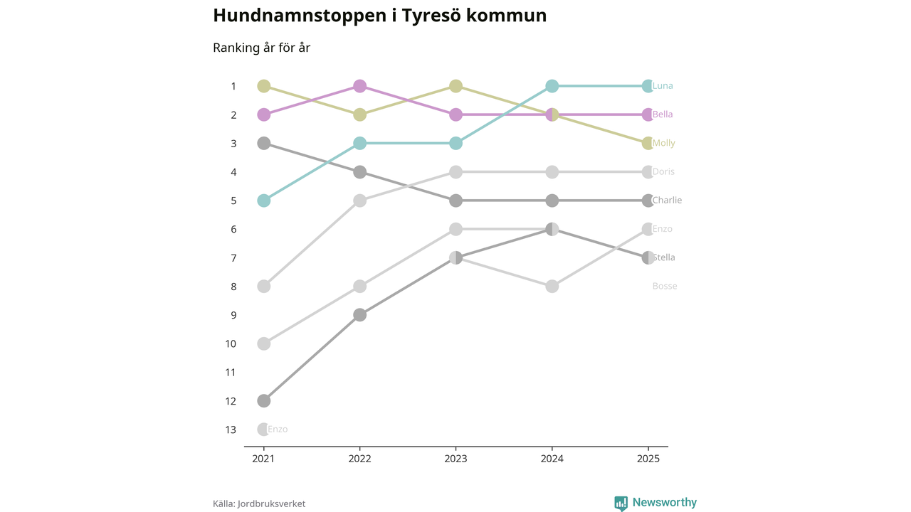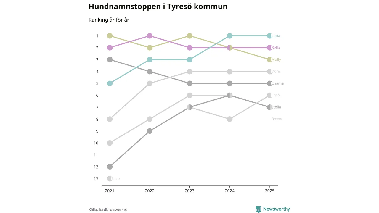 Molly är fortsatt ohotad etta bland hundnamnen i Sverige, följt av Bella och Charlie. Så har det sett ut flera år i rad, men bland Tyresöhundarna är Luna populärast. Tyresö är en av elva kommuner i landet där Luna är vanligast, eller på delad förstaplats.