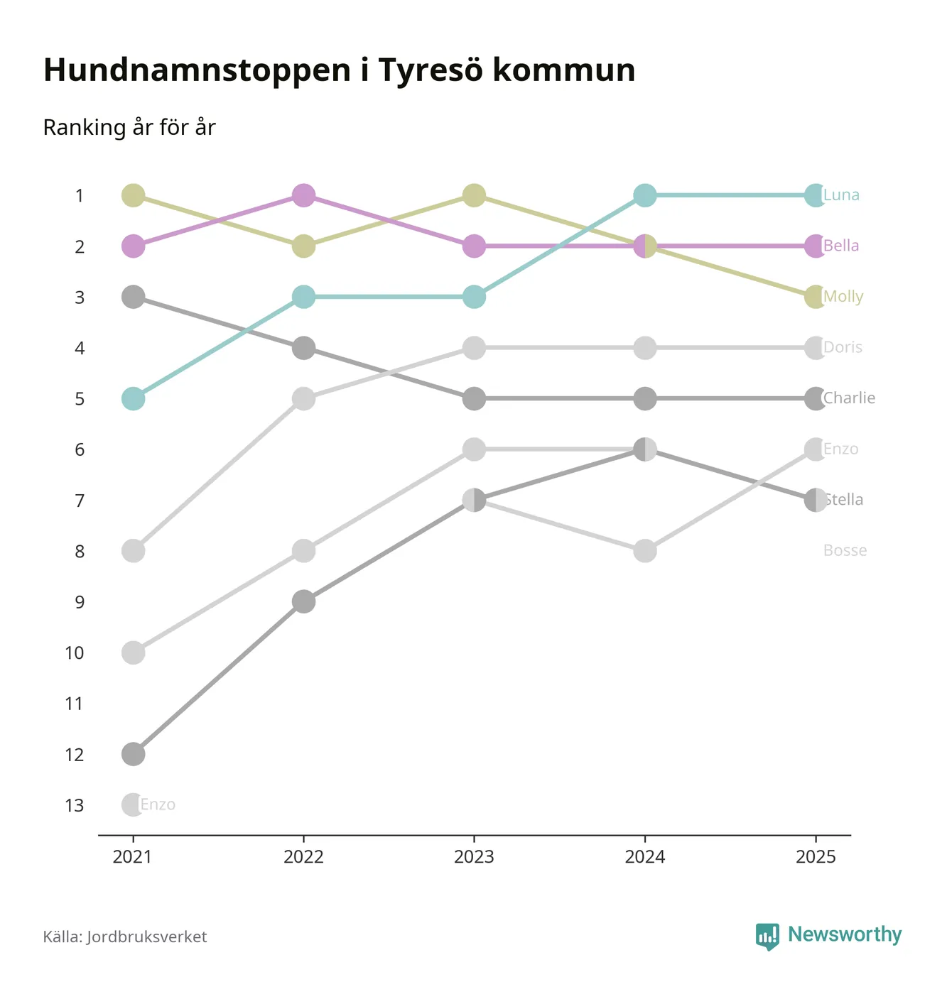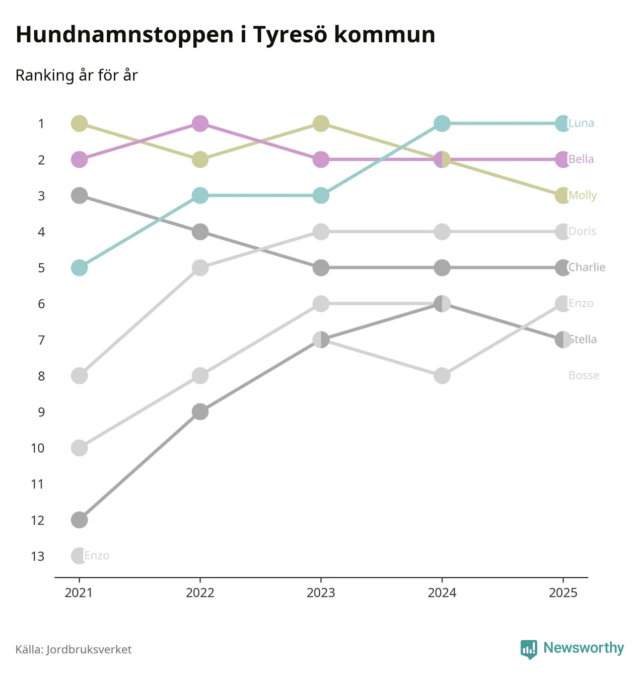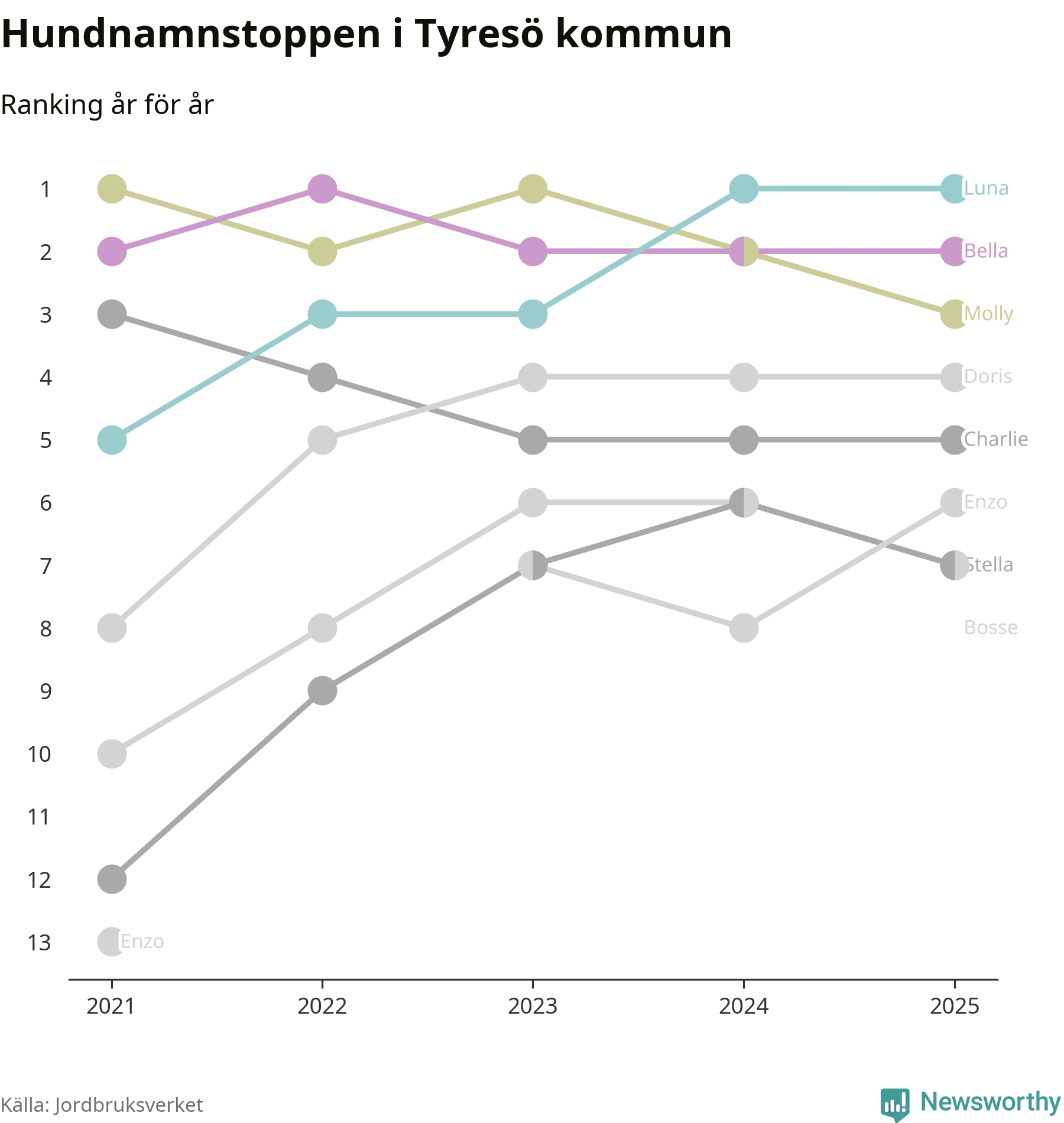 Molly är fortsatt ohotad etta bland hundnamnen i Sverige, följt av Bella och Charlie. Så har det sett ut flera år i rad, men bland Tyresöhundarna är Luna populärast. Tyresö är en av elva kommuner i landet där Luna är vanligast, eller på delad förstaplats.