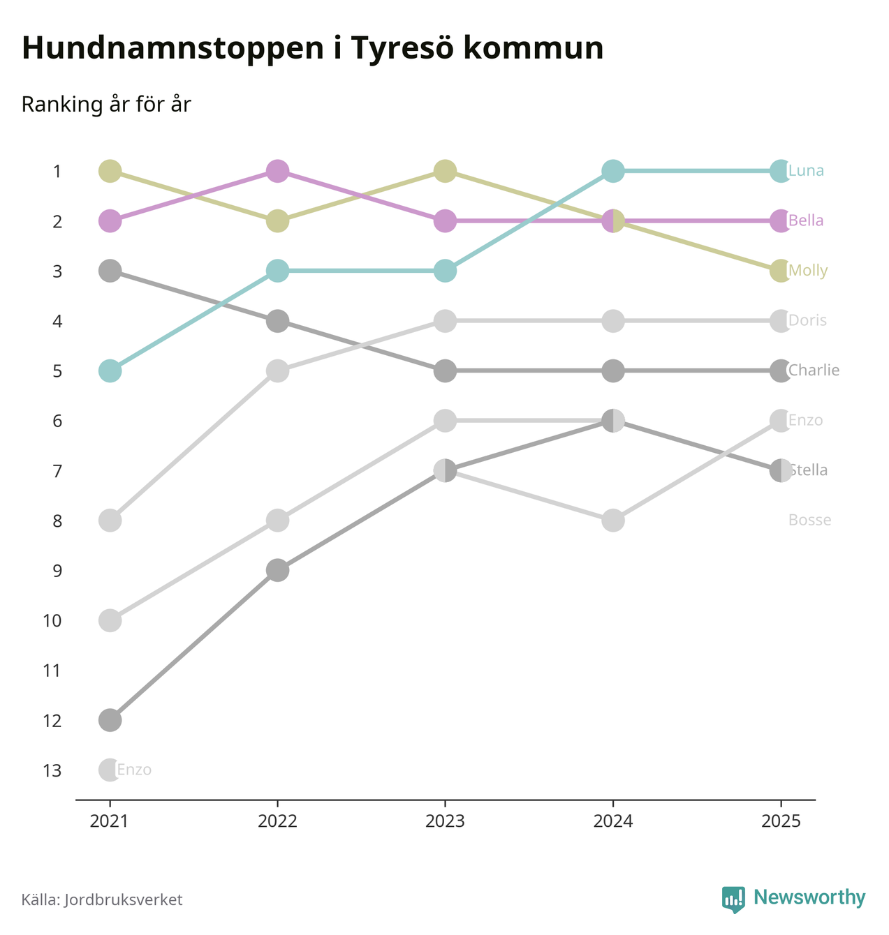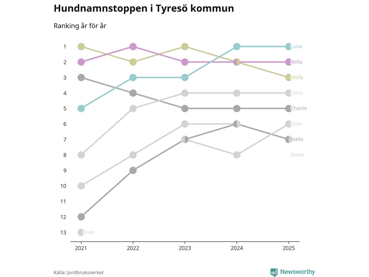I hela landet är Molly det ohotat populäraste tilltalsnamnet för hundar sedan flera år, följt av Bella och Charlie. Något av de tre namnen toppar listan i 243 av 290 kommuner, och de har varit de vanligaste namnen sedan åtminstone 2018. Men det fjärde populäraste namnet, Doris, knappade in på ledartrion och kommer snart kunna utmana Charlie om tredjeplatsen, om trenden håller i sig.