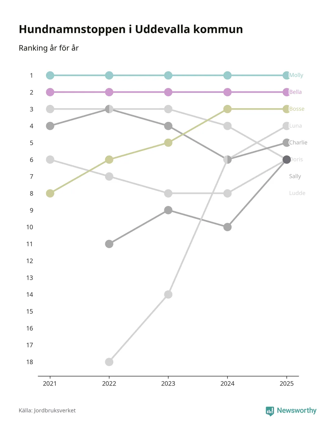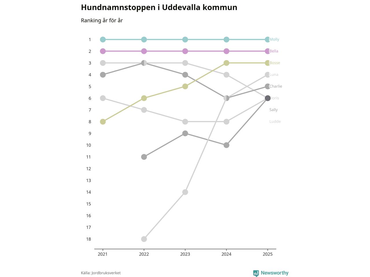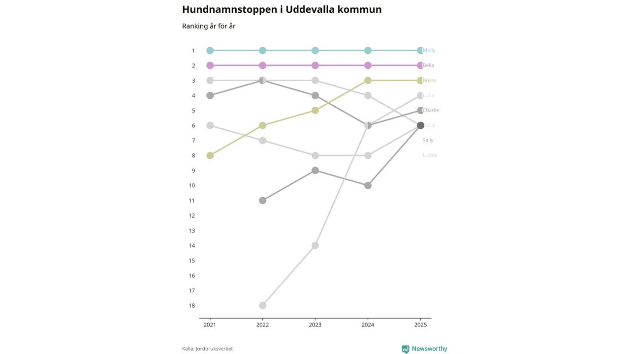 Molly toppar hundnamnsligan i Uddevalla kommun, precis som i landet som helhet. Det visar färsk statistik från Jordbruksverket. Här finns hela topplistan för kommunen.