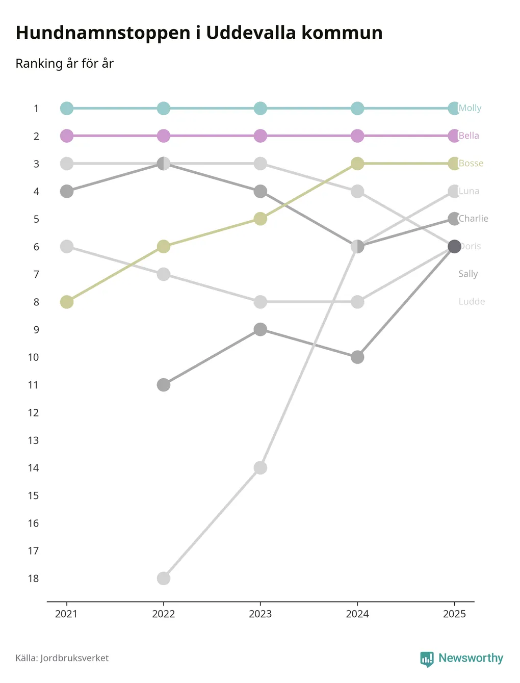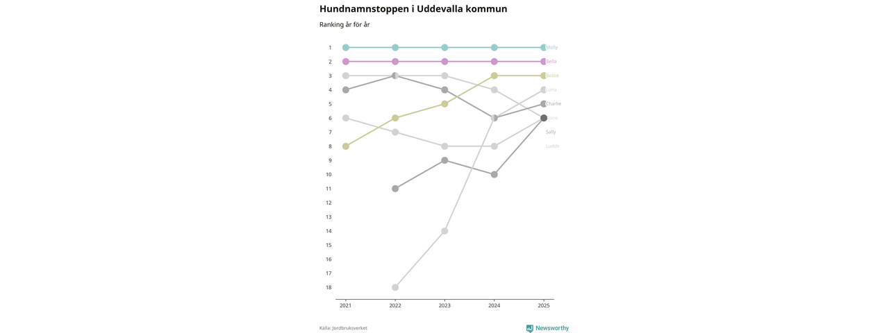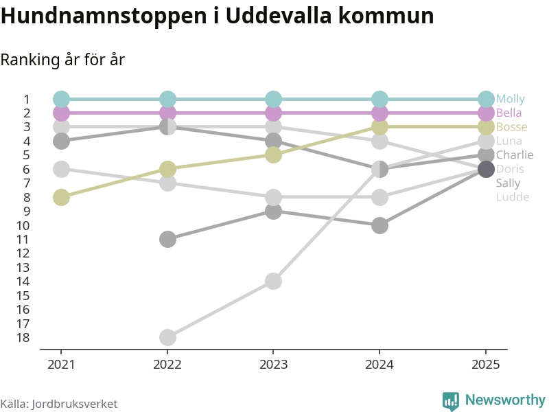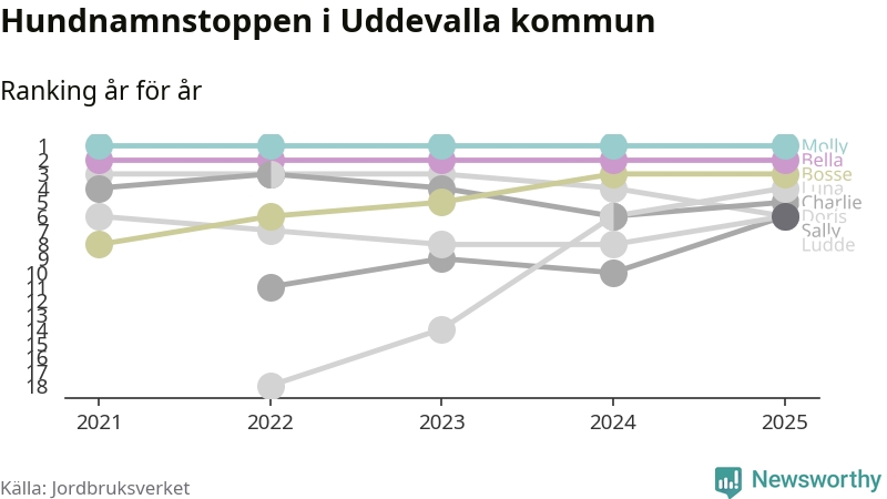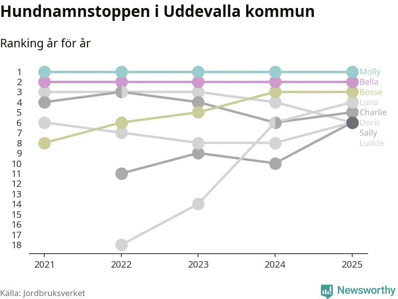 Molly toppar hundnamnsligan i Uddevalla kommun, precis som i landet som helhet. Det visar färsk statistik från Jordbruksverket. Här finns hela topplistan för kommunen.