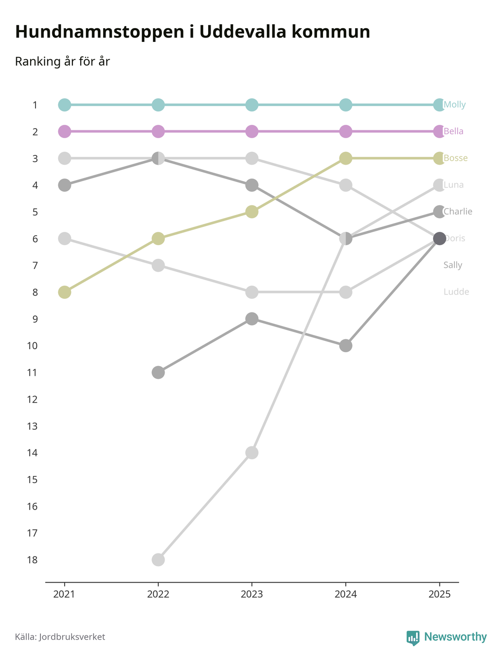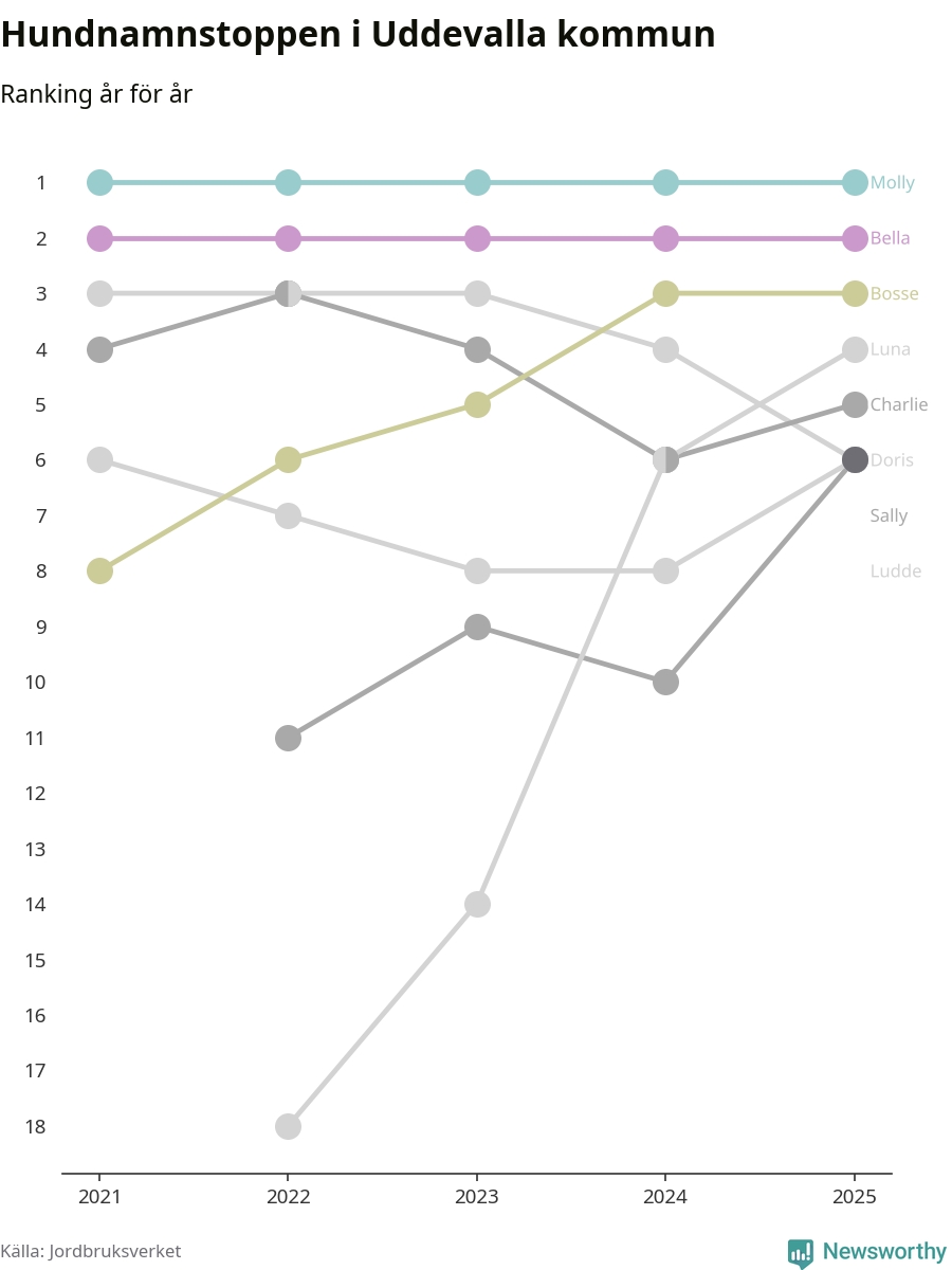 I hela landet är Molly det ohotat populäraste tilltalsnamnet för hundar sedan flera år, följt av Bella och Charlie. Något av de tre namnen toppar listan i 243 av 290 kommuner, och de har varit de vanligaste namnen sedan åtminstone 2018. Men det fjärde populäraste namnet, Doris, knappade in på ledartrion och kommer snart kunna utmana Charlie om tredjeplatsen, om trenden håller i sig.