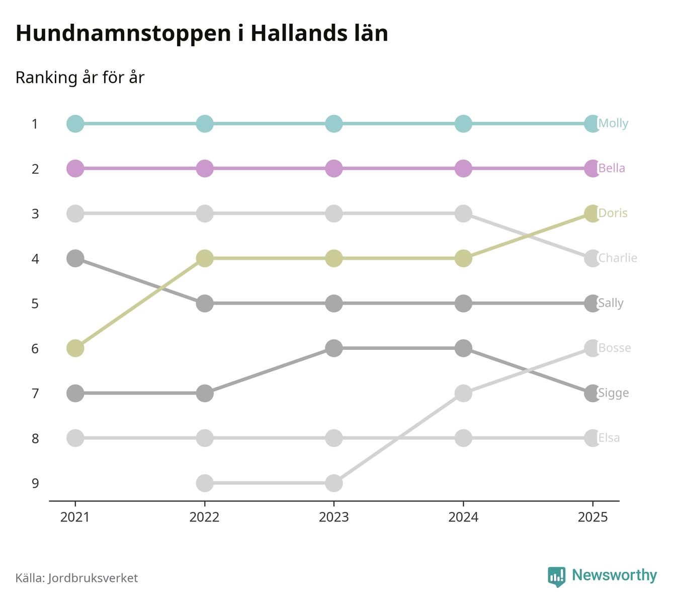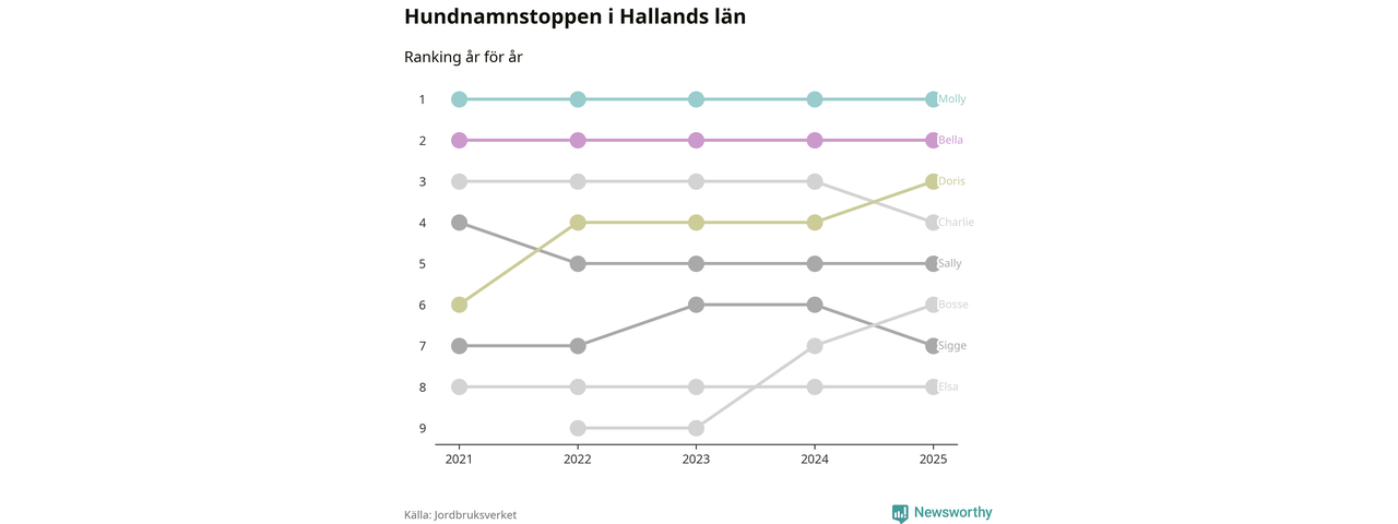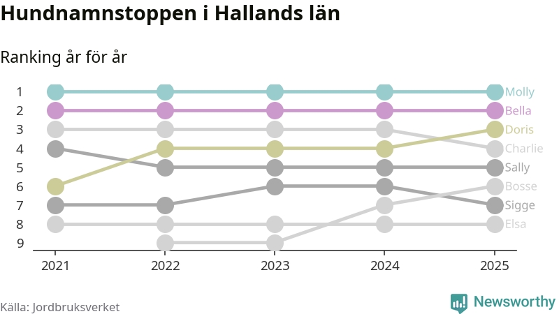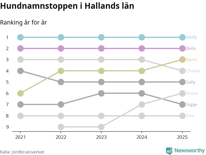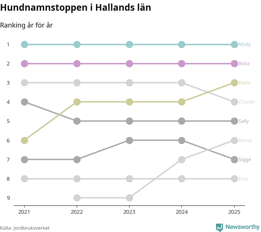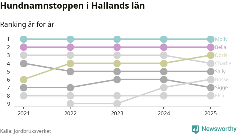 I hela landet är Molly det ohotat populäraste tilltalsnamnet för hundar sedan flera år, följt av Bella och Charlie. Något av de tre namnen toppar listan i 243 av 290 kommuner, och de har varit de vanligaste namnen sedan åtminstone 2018. Men det fjärde populäraste namnet, Doris, knappade in på ledartrion och kommer snart kunna utmana Charlie om tredjeplatsen, om trenden håller i sig.