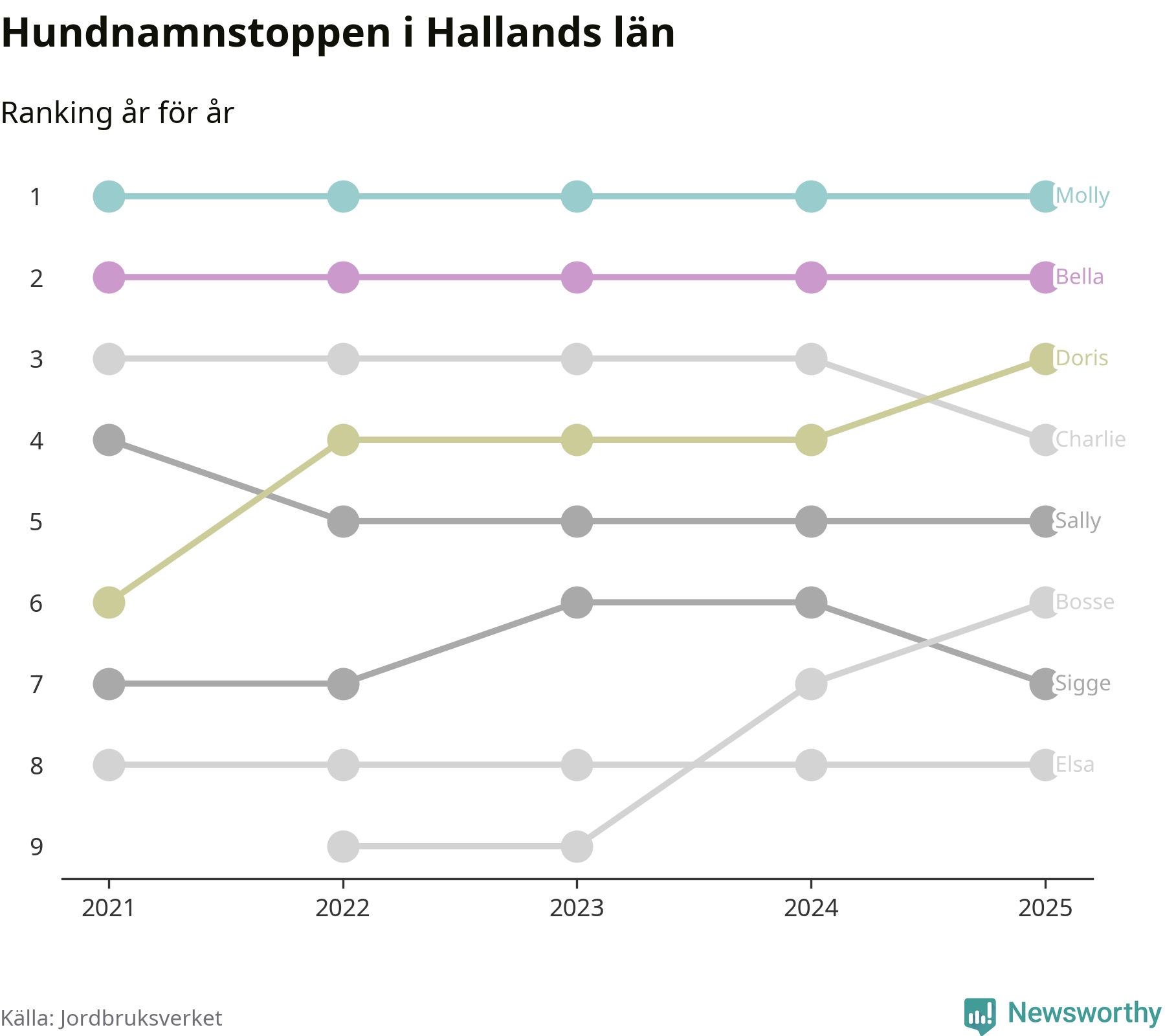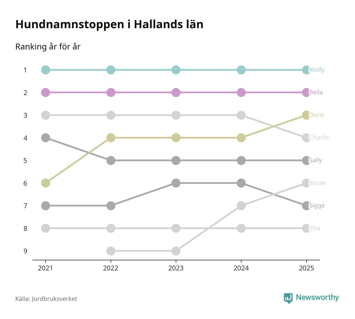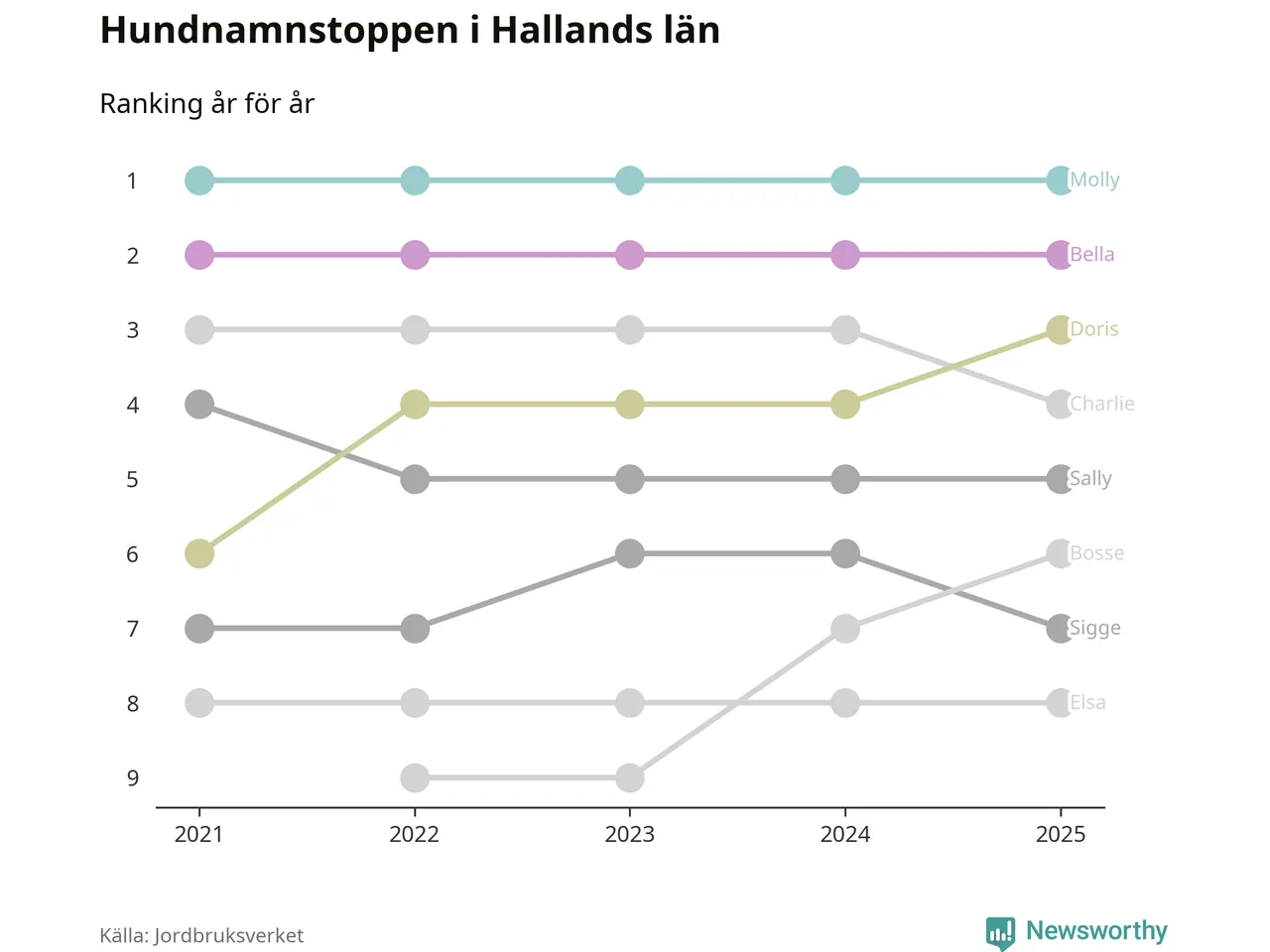 I hela landet är Molly det ohotat populäraste tilltalsnamnet för hundar sedan flera år, följt av Bella och Charlie. Något av de tre namnen toppar listan i 243 av 290 kommuner, och de har varit de vanligaste namnen sedan åtminstone 2018. Men det fjärde populäraste namnet, Doris, knappade in på ledartrion och kommer snart kunna utmana Charlie om tredjeplatsen, om trenden håller i sig.