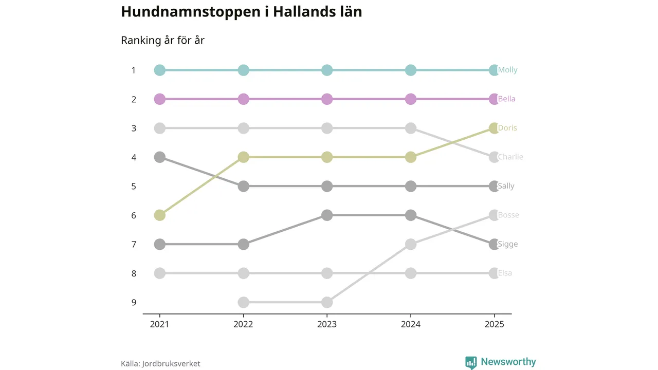 Molly toppar hundnamnsligan i Hallands län, precis som i landet som helhet. Det visar färsk statistik från Jordbruksverket. Här finns hela topplistan för länet.