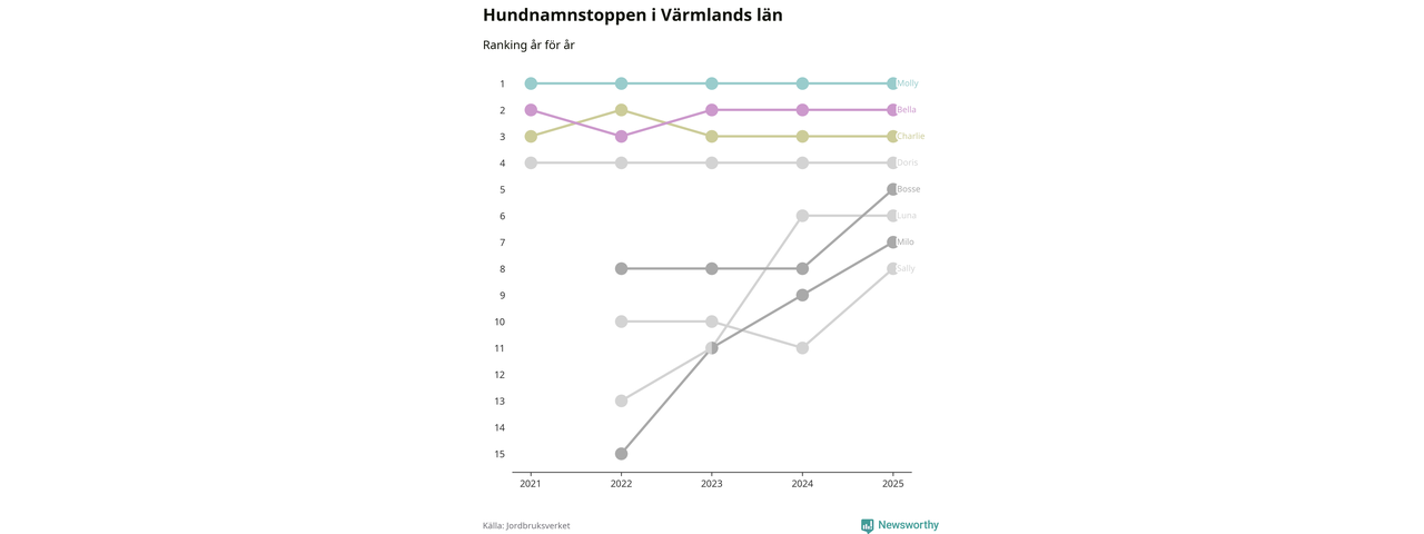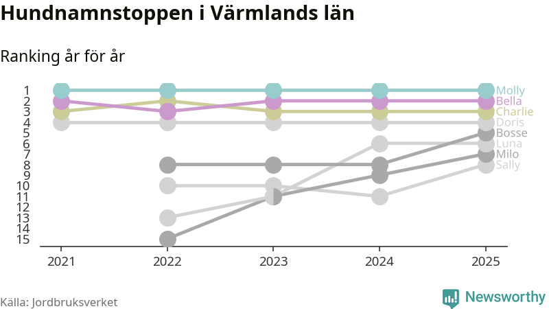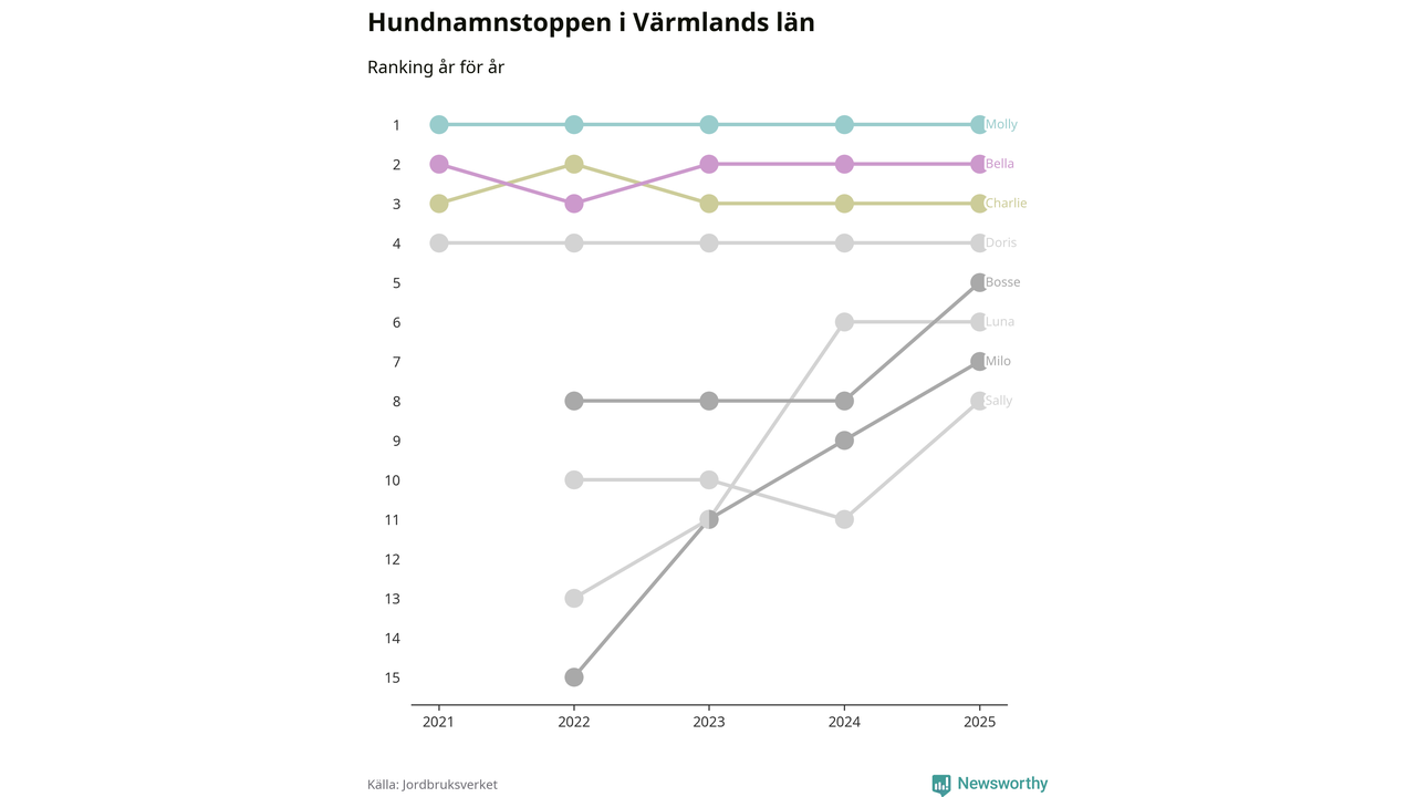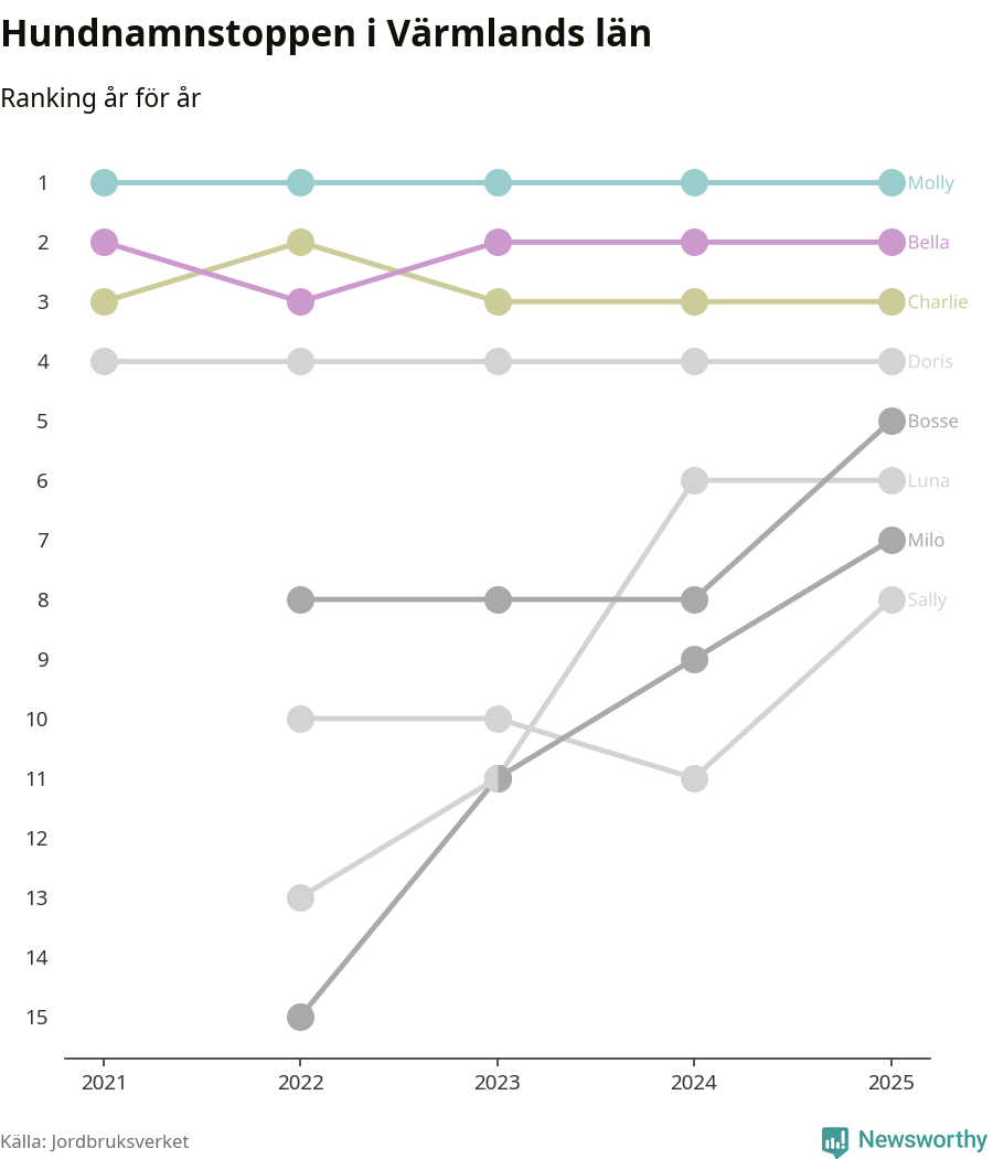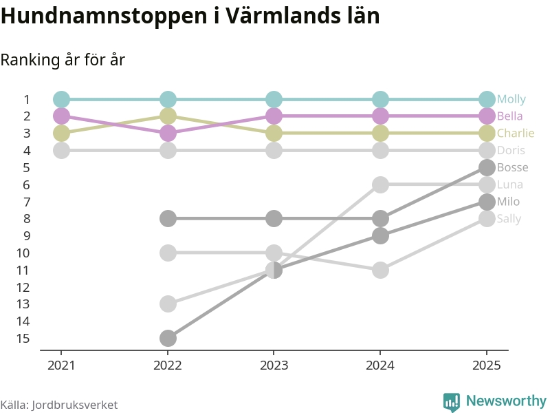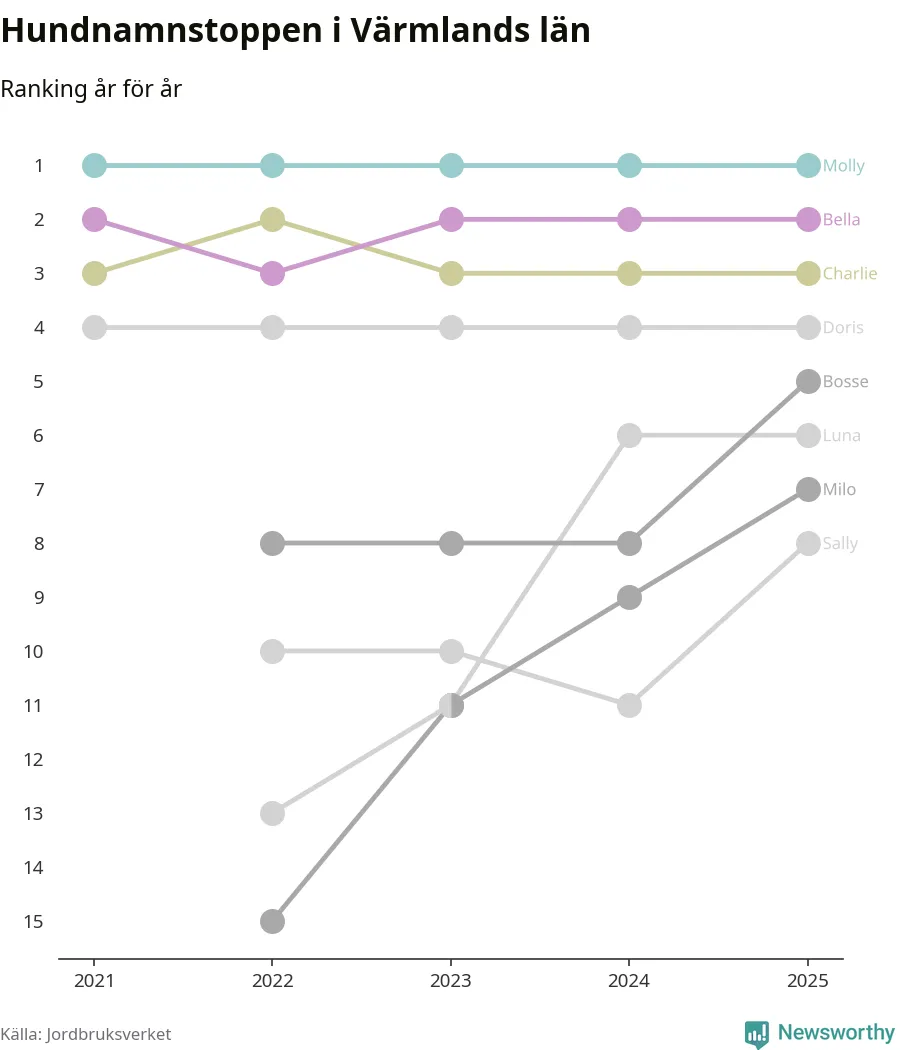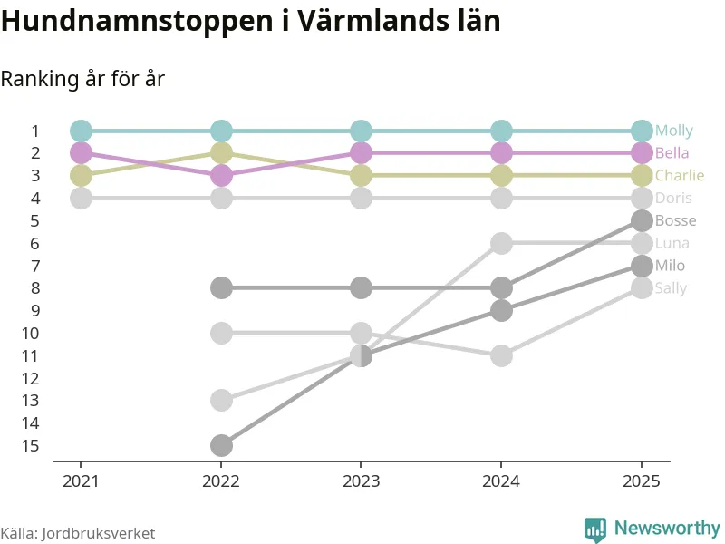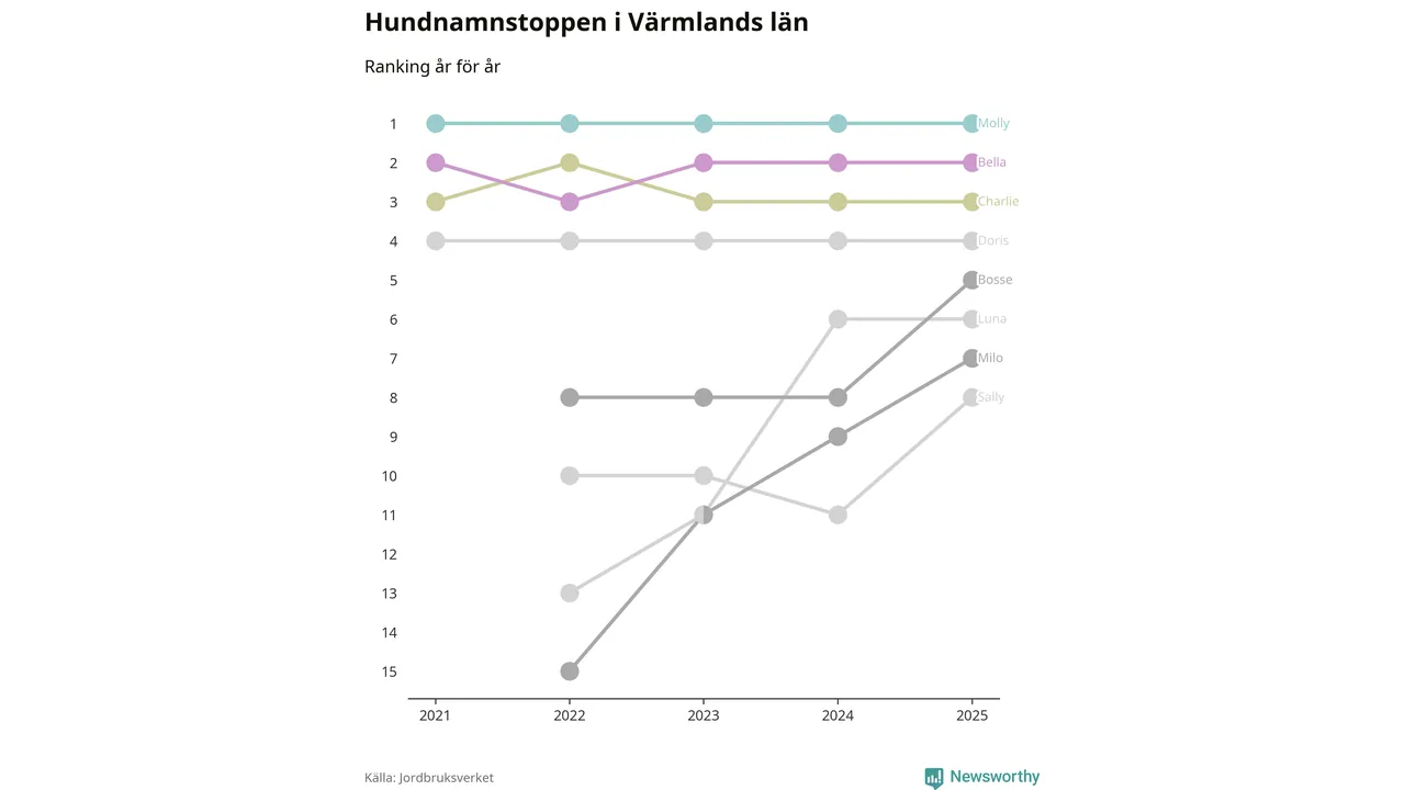 Molly toppar hundnamnsligan i Värmlands län, precis som i landet som helhet. Det visar färsk statistik från Jordbruksverket. Här finns hela topplistan för länet.