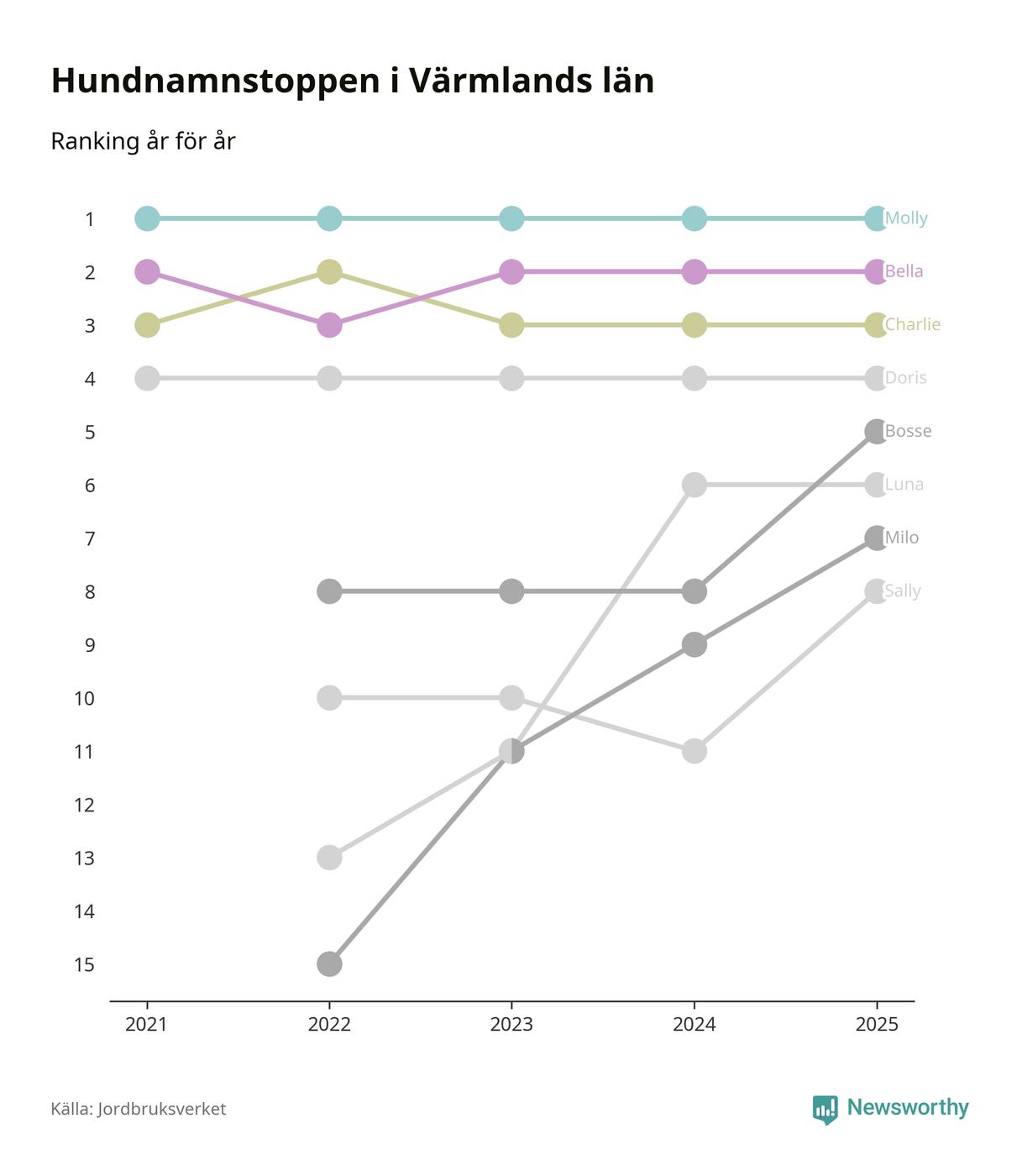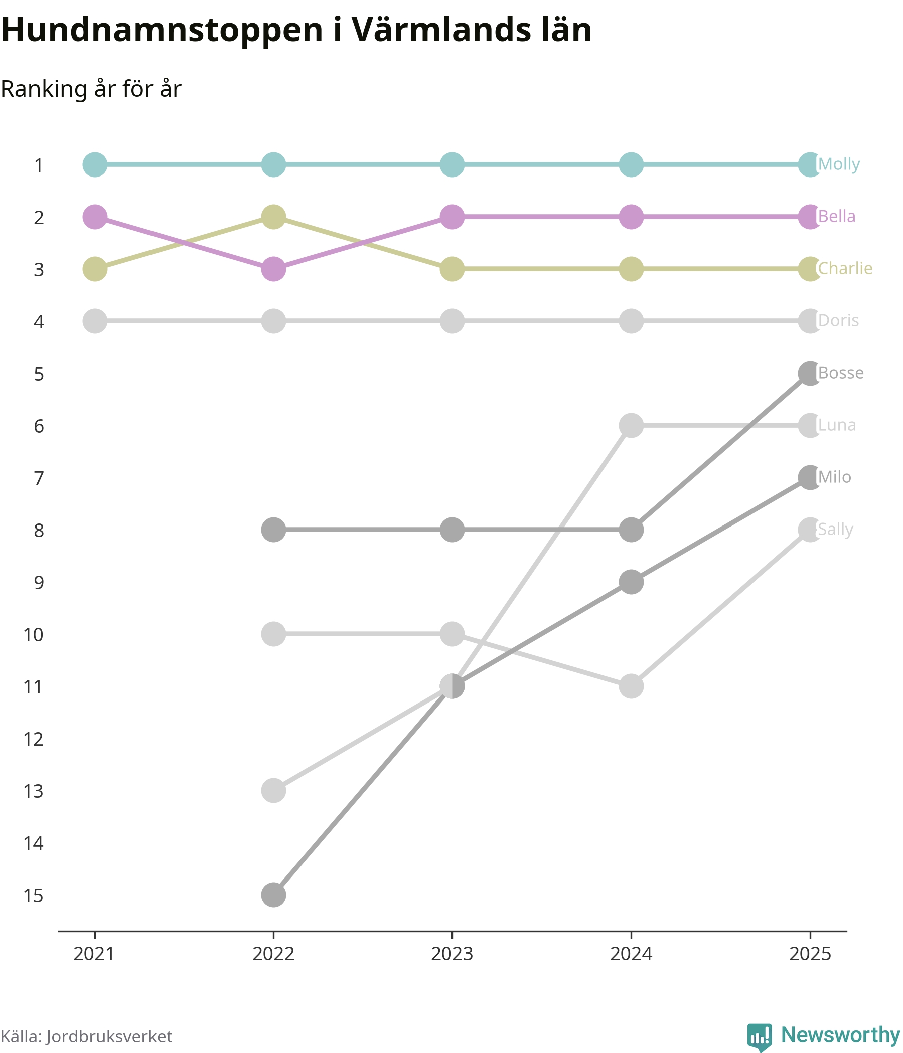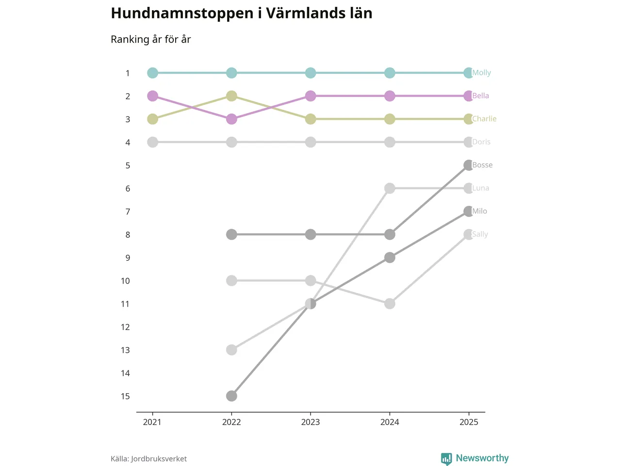 I hela landet är Molly det ohotat populäraste tilltalsnamnet för hundar sedan flera år, följt av Bella och Charlie. Något av de tre namnen toppar listan i 243 av 290 kommuner, och de har varit de vanligaste namnen sedan åtminstone 2018. Men det fjärde populäraste namnet, Doris, knappade in på ledartrion och kommer snart kunna utmana Charlie om tredjeplatsen, om trenden håller i sig.
