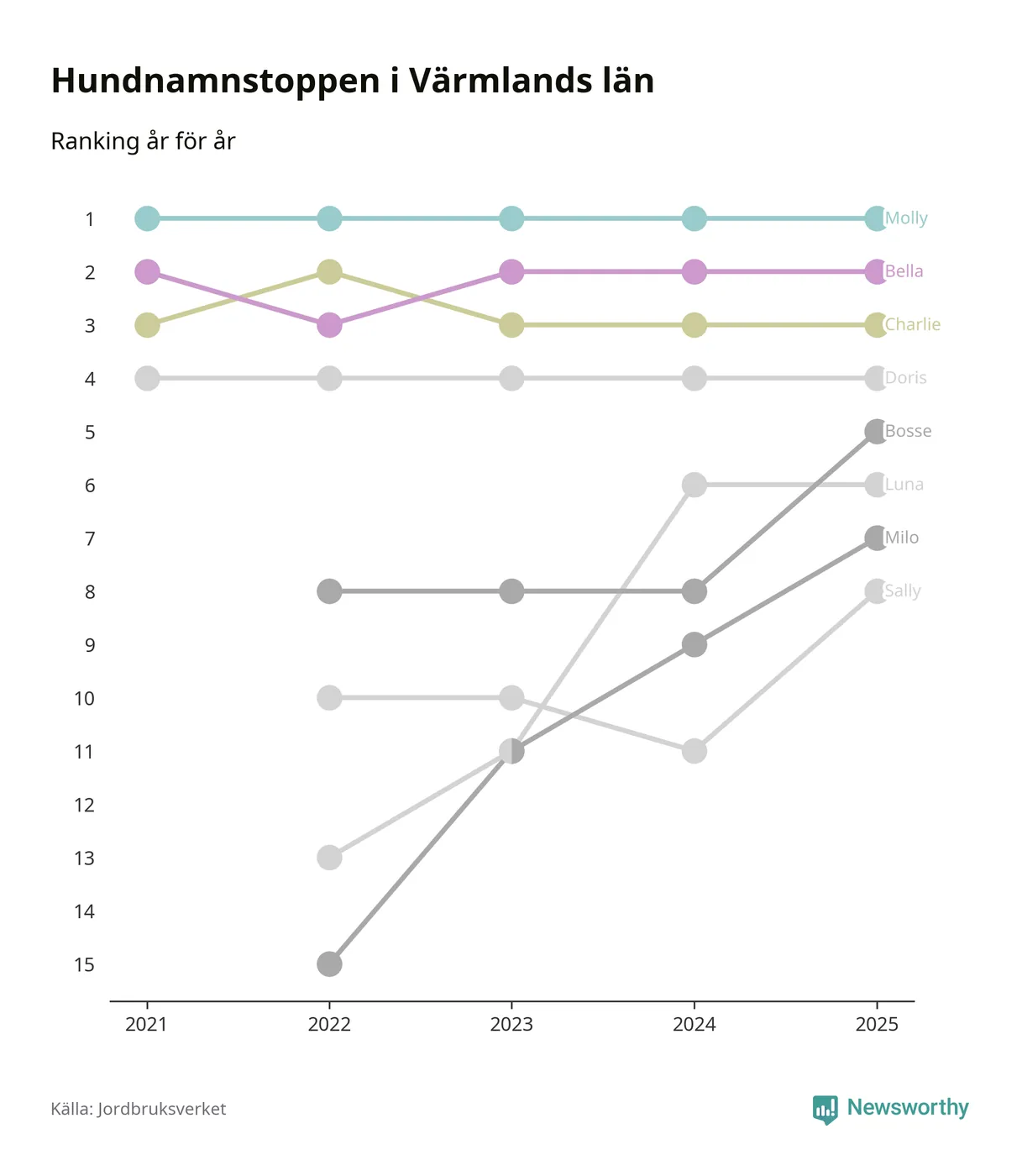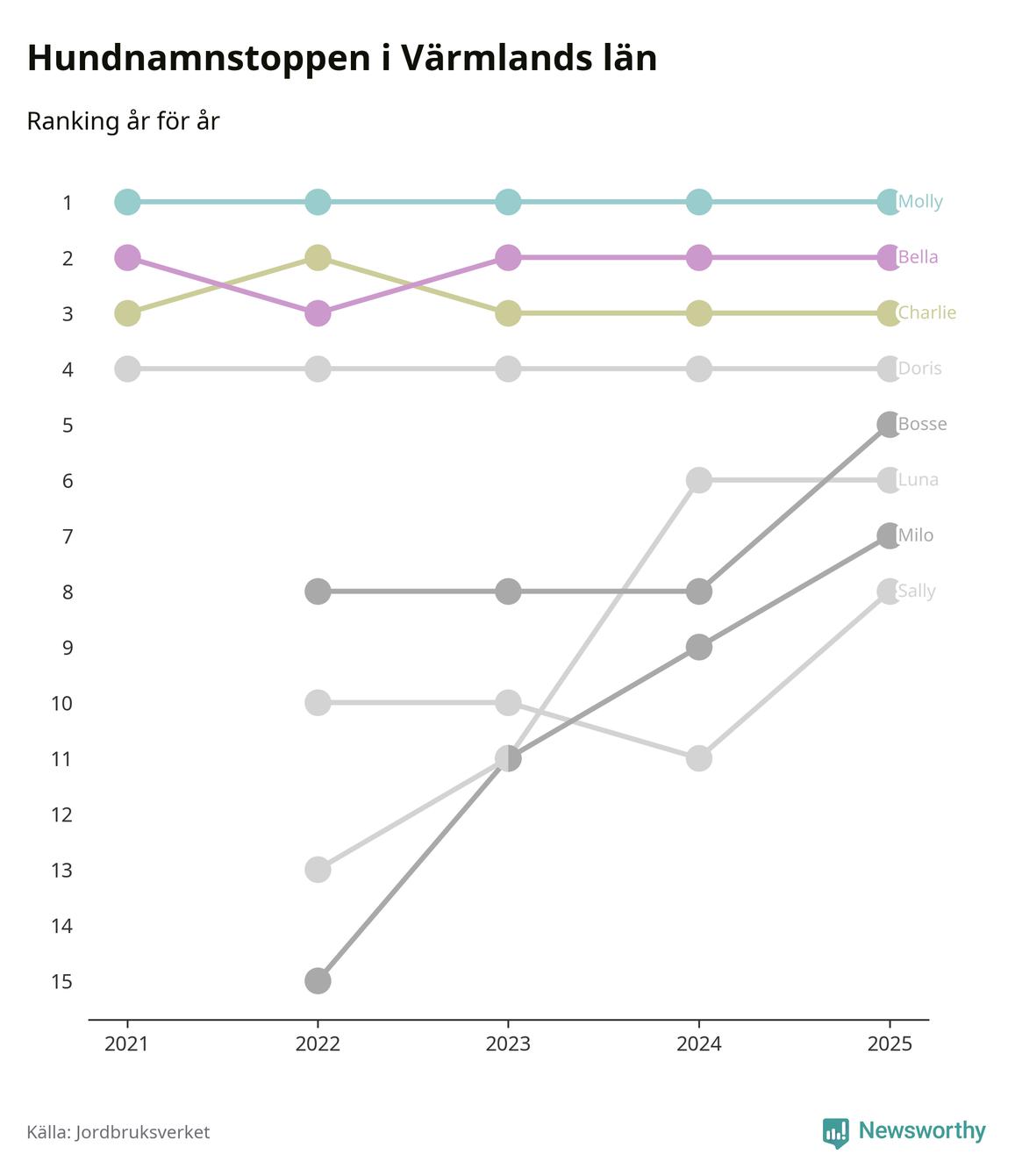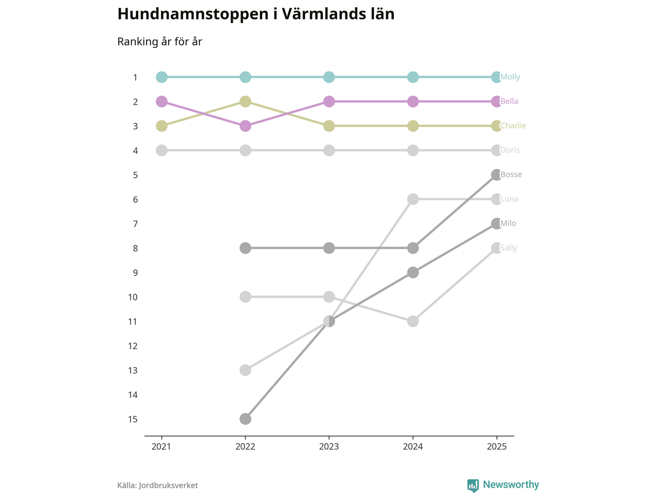 I hela landet är Molly det ohotat populäraste tilltalsnamnet för hundar sedan flera år, följt av Bella och Charlie. Något av de tre namnen toppar listan i 243 av 290 kommuner, och de har varit de vanligaste namnen sedan åtminstone 2018. Men det fjärde populäraste namnet, Doris, knappade in på ledartrion och kommer snart kunna utmana Charlie om tredjeplatsen, om trenden håller i sig.