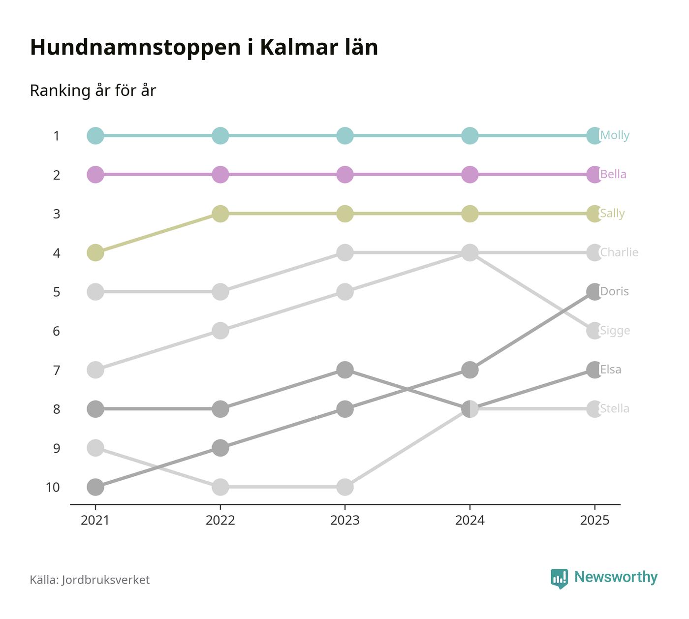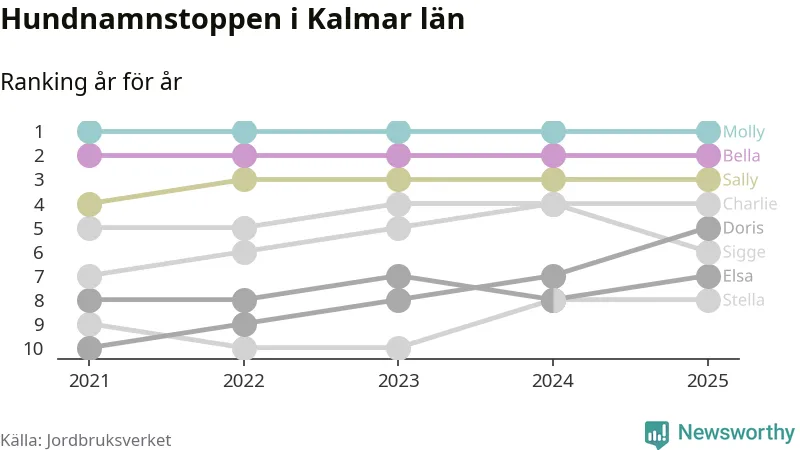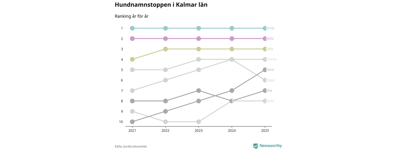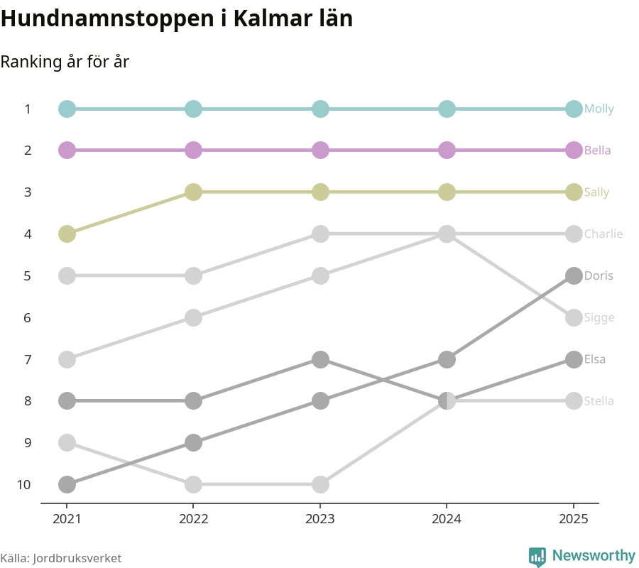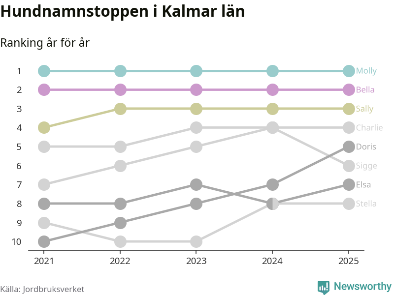 I hela landet är Molly det ohotat populäraste tilltalsnamnet för hundar sedan flera år, följt av Bella och Charlie. Något av de tre namnen toppar listan i 243 av 290 kommuner, och de har varit de vanligaste namnen sedan åtminstone 2018. Men det fjärde populäraste namnet, Doris, knappade in på ledartrion och kommer snart kunna utmana Charlie om tredjeplatsen, om trenden håller i sig.