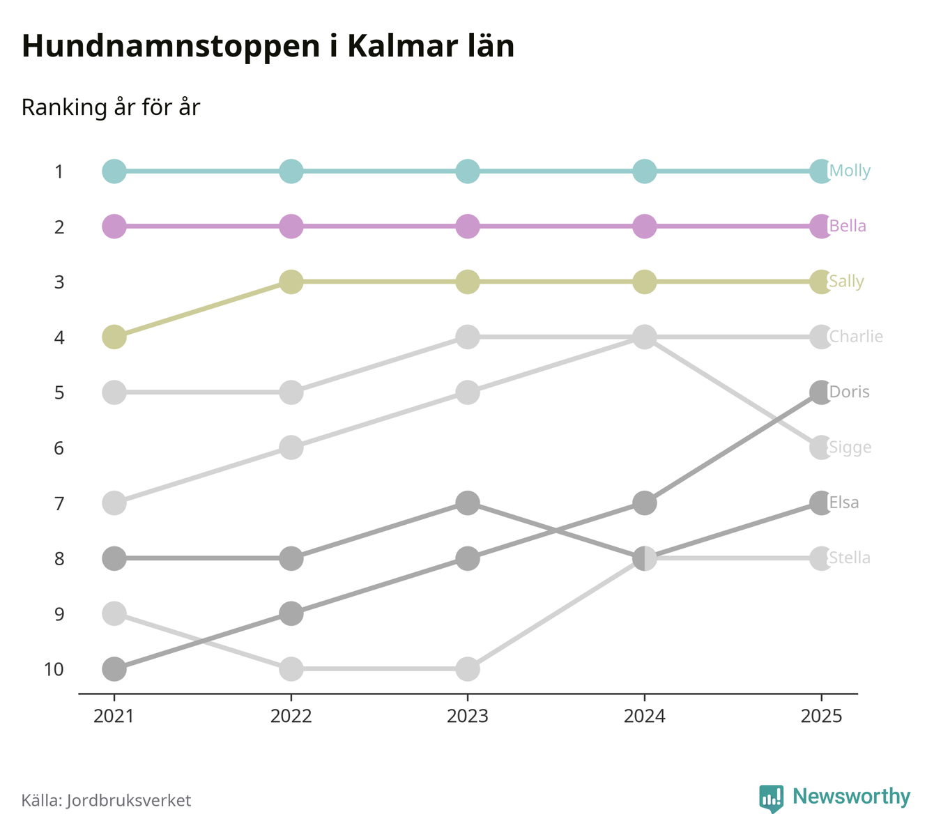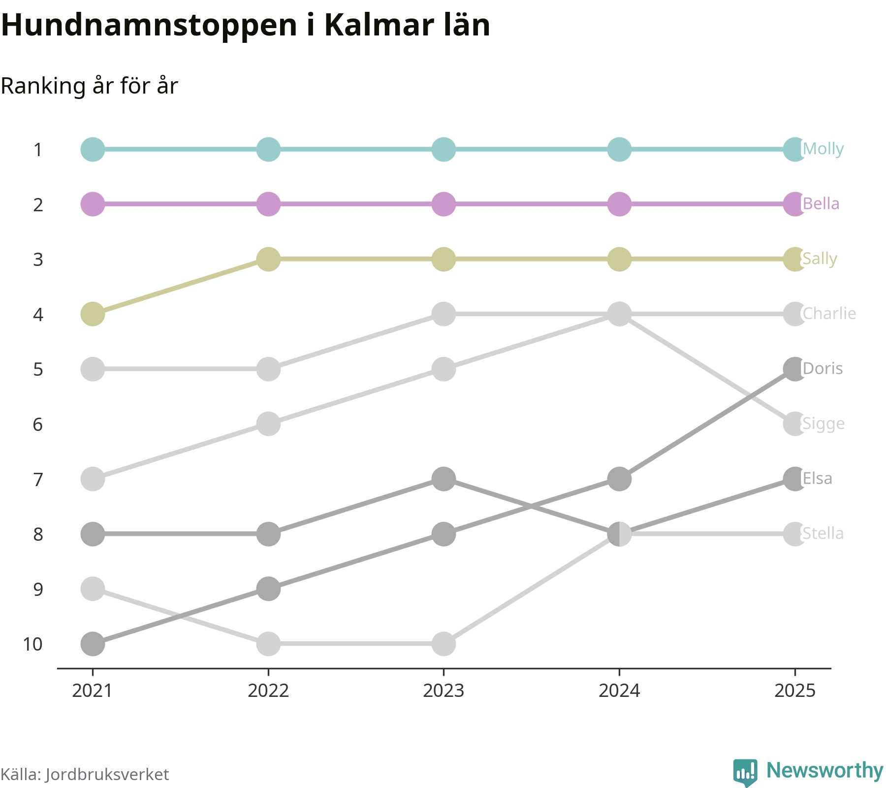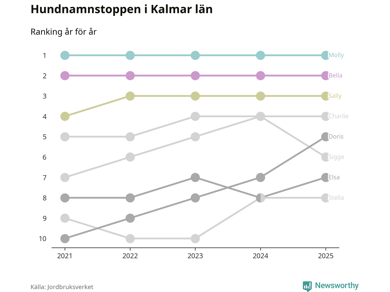 I hela landet är Molly det ohotat populäraste tilltalsnamnet för hundar sedan flera år, följt av Bella och Charlie. Något av de tre namnen toppar listan i 243 av 290 kommuner, och de har varit de vanligaste namnen sedan åtminstone 2018. Men det fjärde populäraste namnet, Doris, knappade in på ledartrion och kommer snart kunna utmana Charlie om tredjeplatsen, om trenden håller i sig.