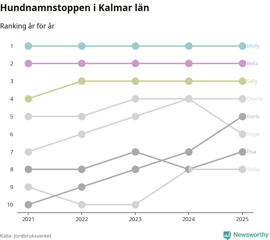 Molly är fortsatt ohotad etta bland hundnamnen i Sverige, följt av Bella och Charlie. Så har det sett ut flera år i rad, och även bland Kalmarhundarna ligger alltså Molly i topp.
