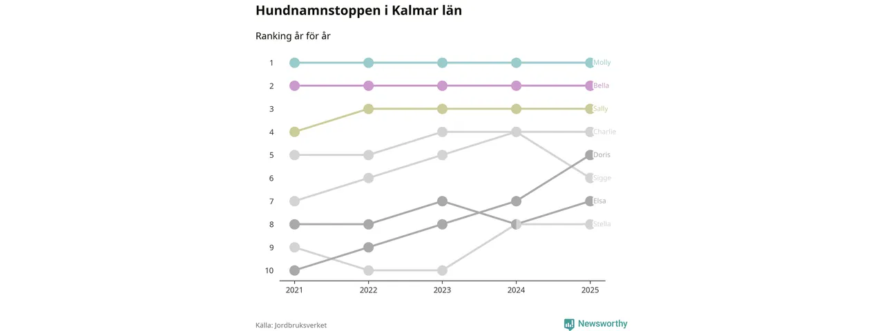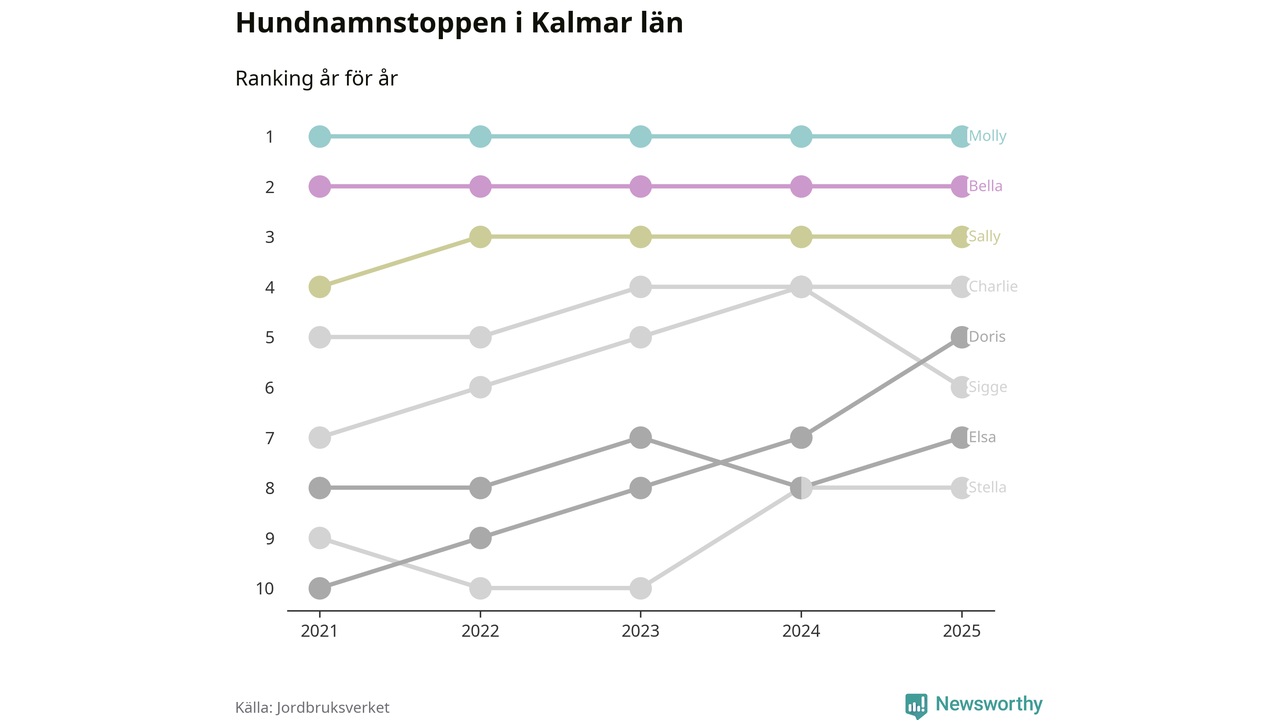Molly toppar hundnamnsligan i Kalmar län, precis som i landet som helhet. Det visar färsk statistik från Jordbruksverket. Här finns hela topplistan för länet.