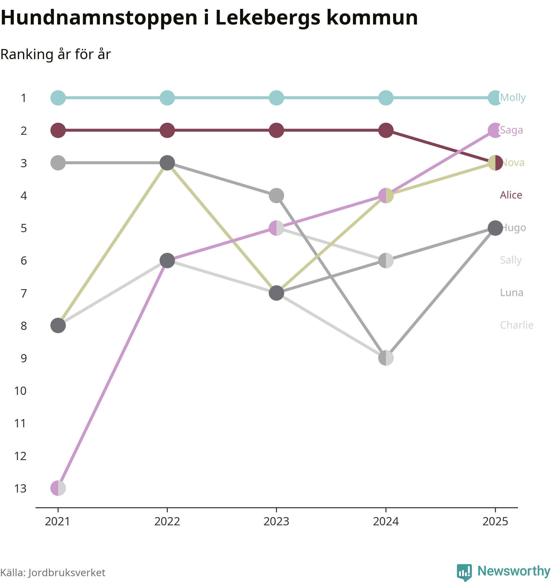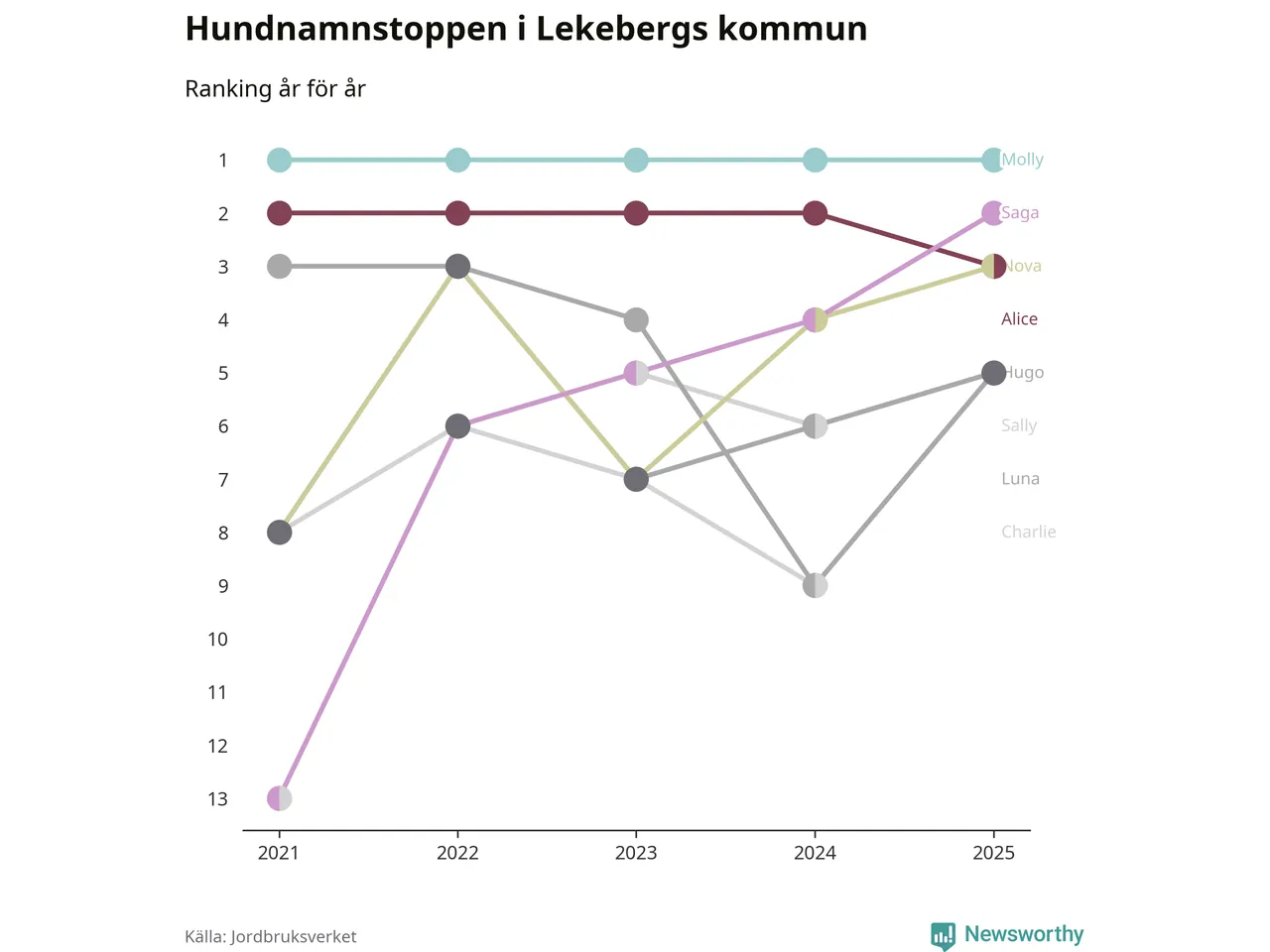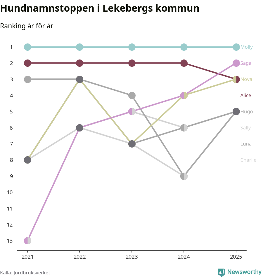 Molly är fortsatt ohotad etta bland hundnamnen i Sverige, följt av Bella och Charlie. Så har det sett ut flera år i rad, och även bland Lekebergshundarna ligger alltså Molly i topp.