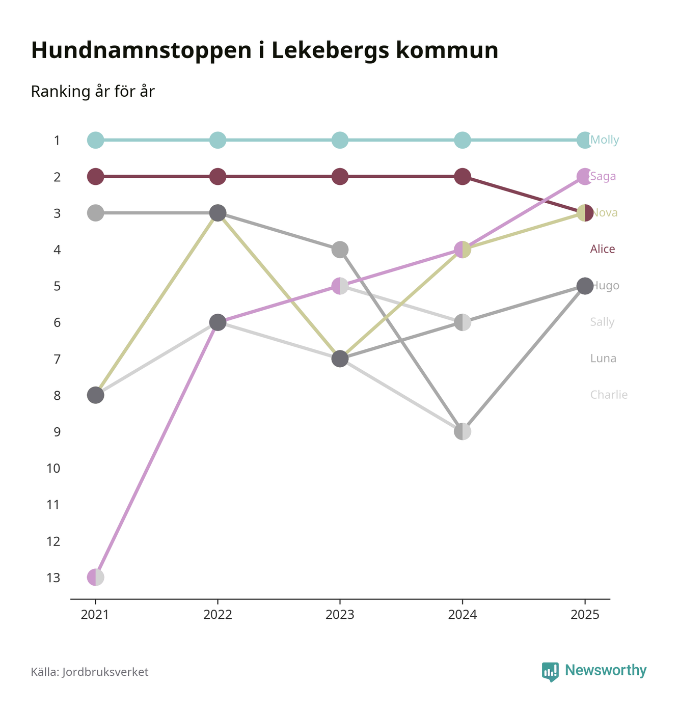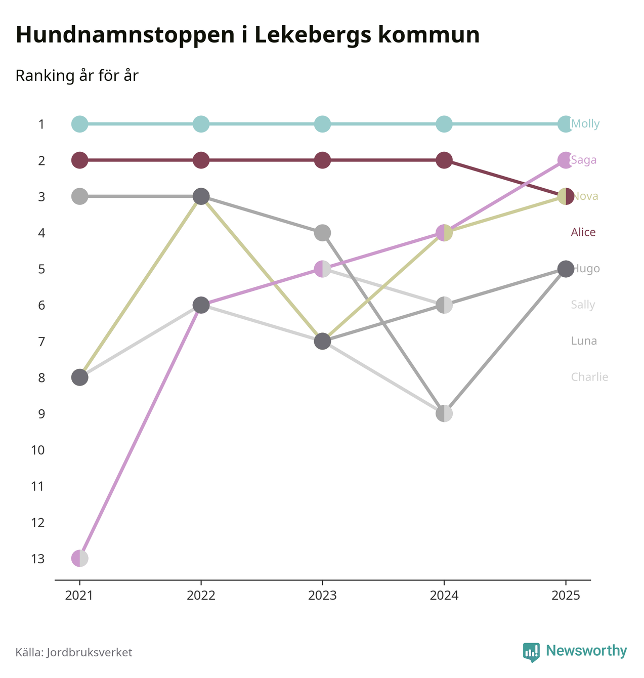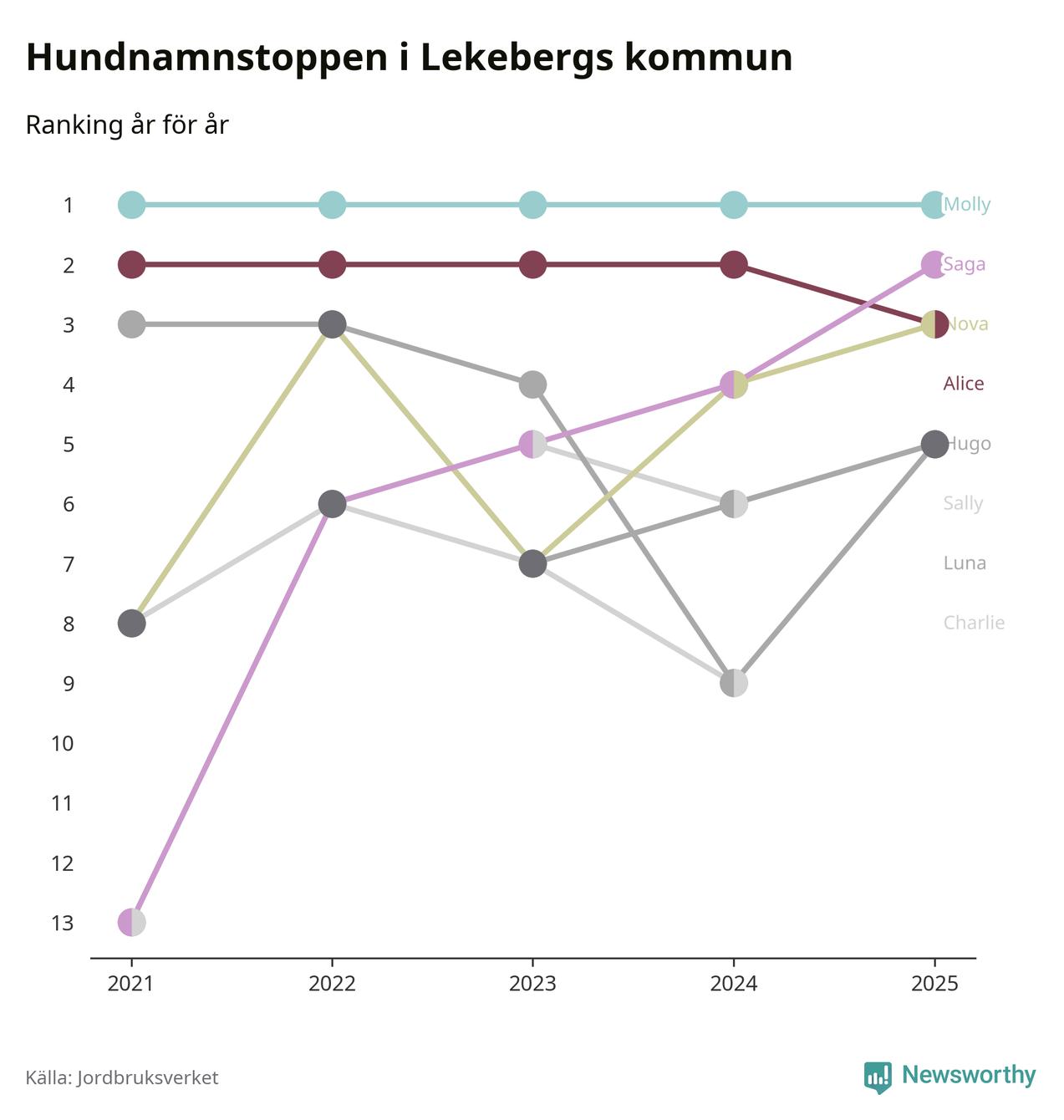 Molly är fortsatt ohotad etta bland hundnamnen i Sverige, följt av Bella och Charlie. Så har det sett ut flera år i rad, och även bland Lekebergshundarna ligger alltså Molly i topp.
