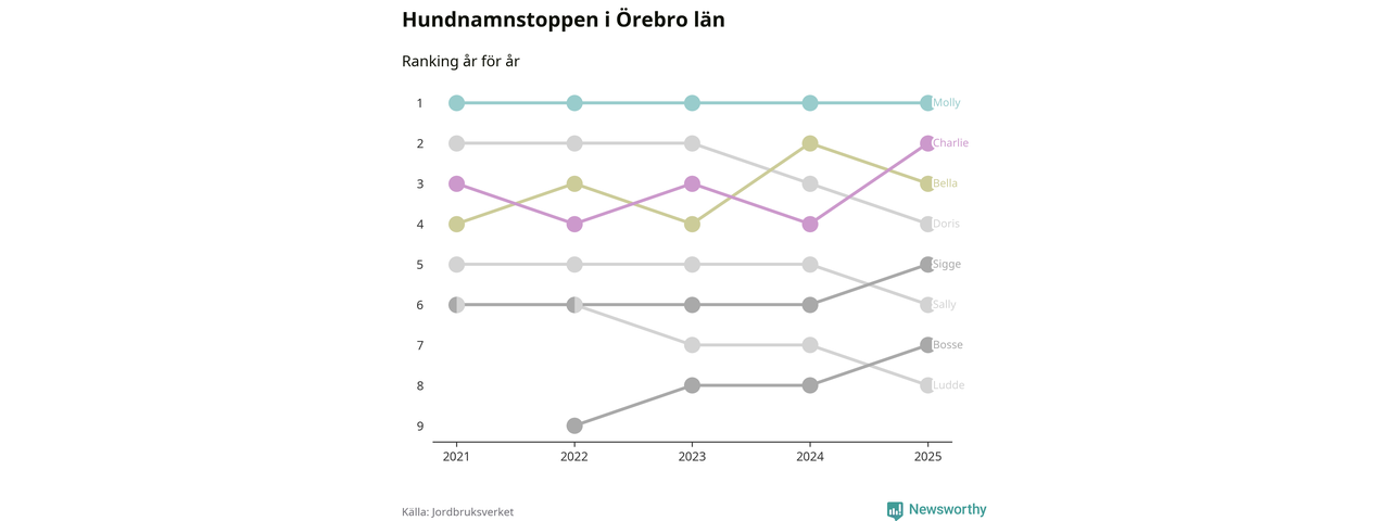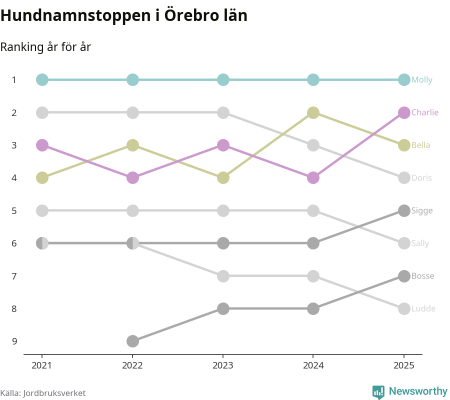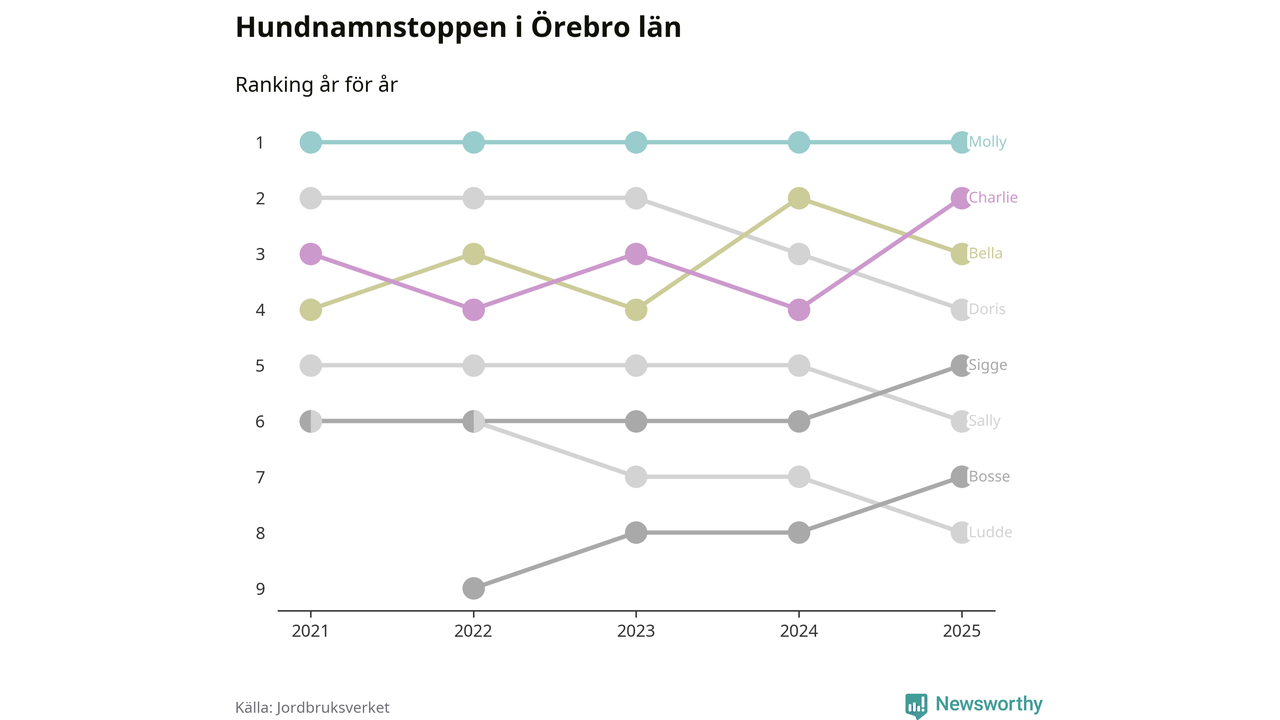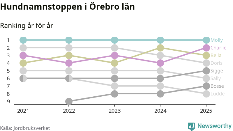 Molly är fortsatt ohotad etta bland hundnamnen i Sverige, följt av Bella och Charlie. Så har det sett ut flera år i rad, och även bland Örebrohundarna ligger alltså Molly i topp.