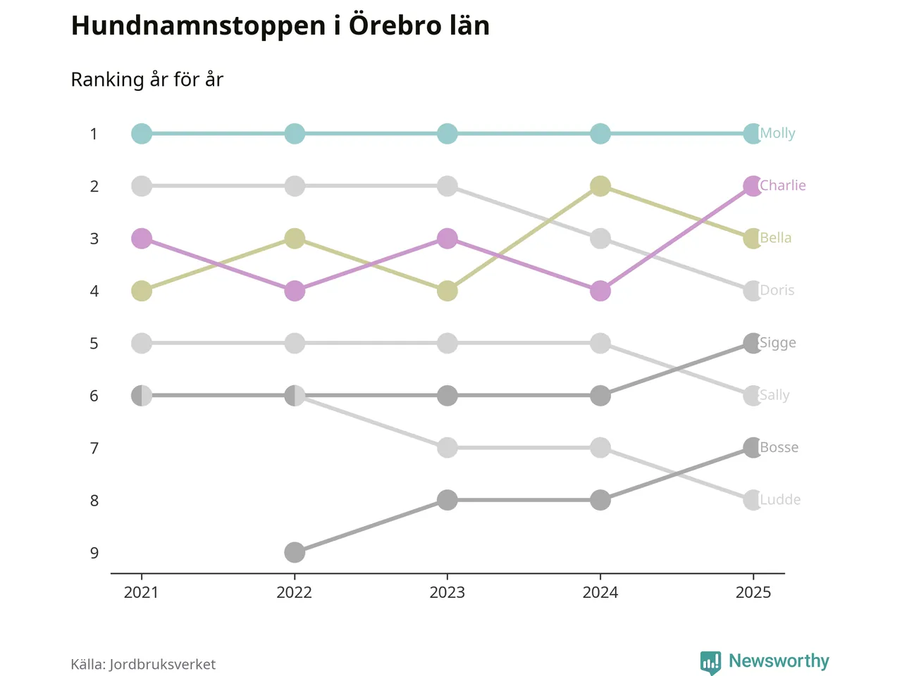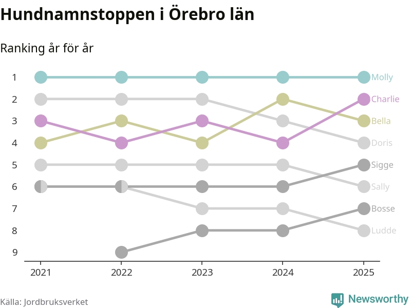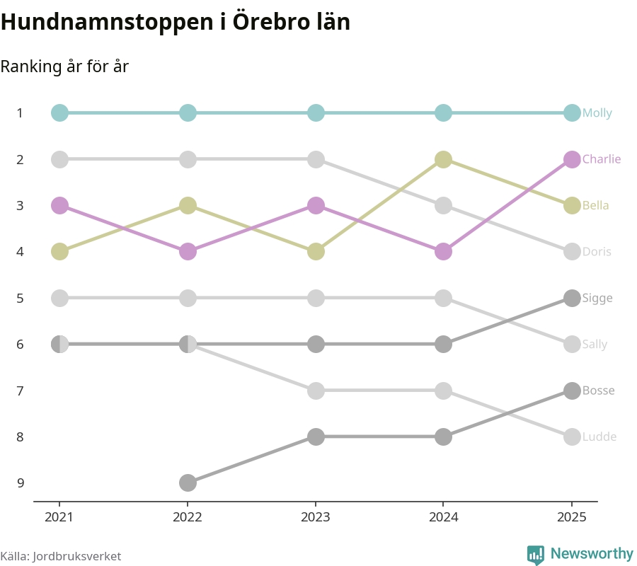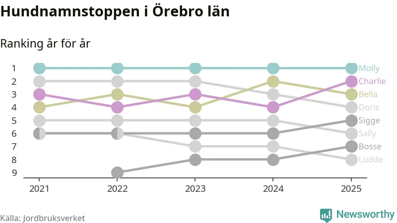 I hela landet är Molly det ohotat populäraste tilltalsnamnet för hundar sedan flera år, följt av Bella och Charlie. Något av de tre namnen toppar listan i 243 av 290 kommuner, och de har varit de vanligaste namnen sedan åtminstone 2018. Men det fjärde populäraste namnet, Doris, knappade in på ledartrion och kommer snart kunna utmana Charlie om tredjeplatsen, om trenden håller i sig.