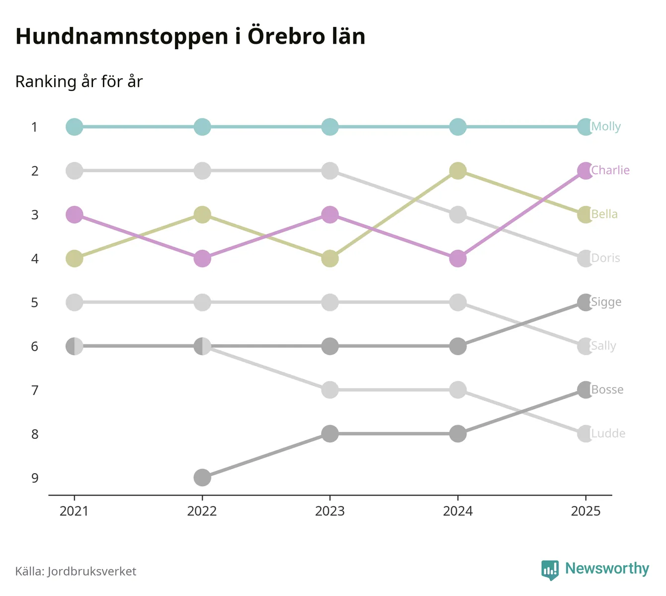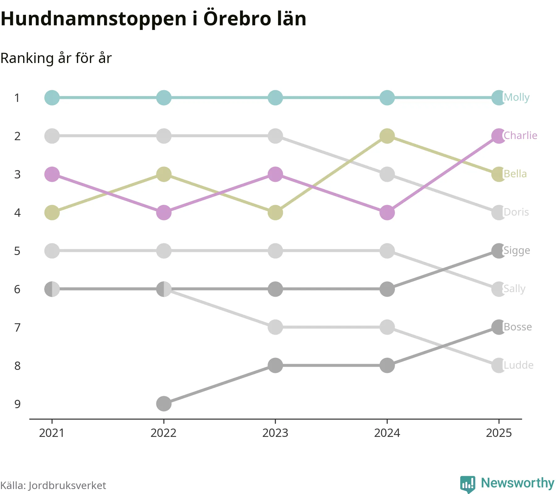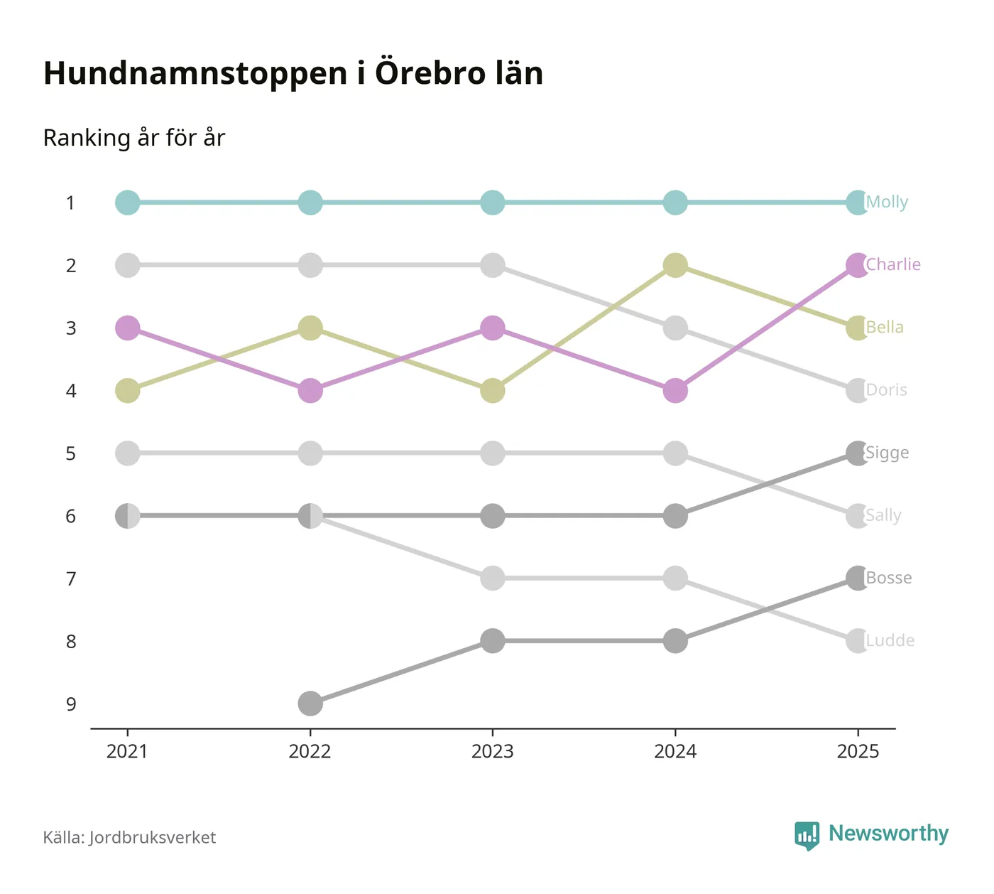 I hela landet är Molly det ohotat populäraste tilltalsnamnet för hundar sedan flera år, följt av Bella och Charlie. Något av de tre namnen toppar listan i 243 av 290 kommuner, och de har varit de vanligaste namnen sedan åtminstone 2018. Men det fjärde populäraste namnet, Doris, knappade in på ledartrion och kommer snart kunna utmana Charlie om tredjeplatsen, om trenden håller i sig.