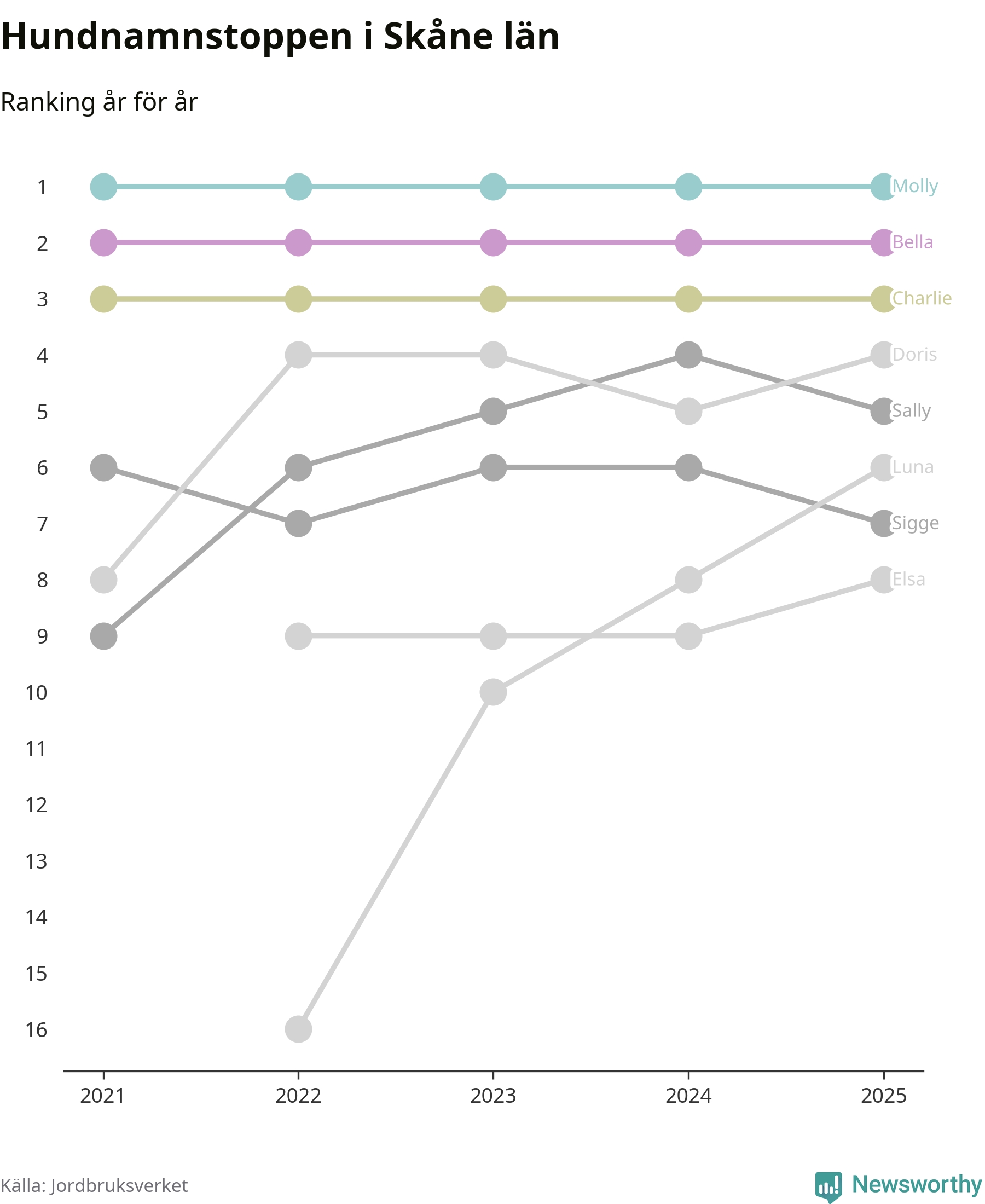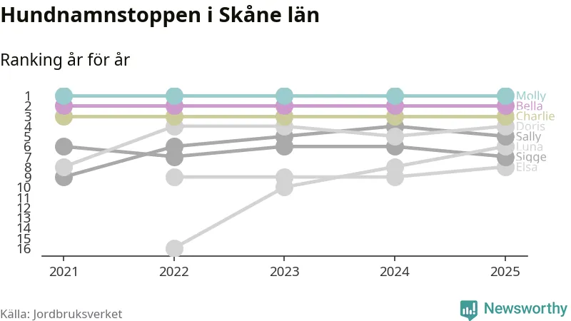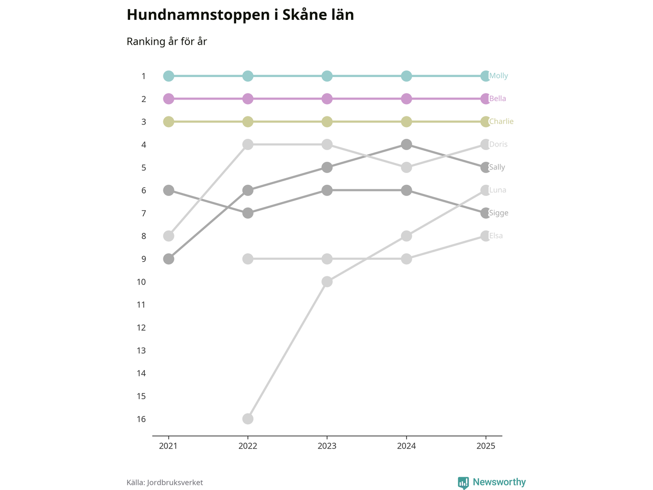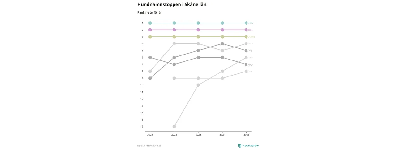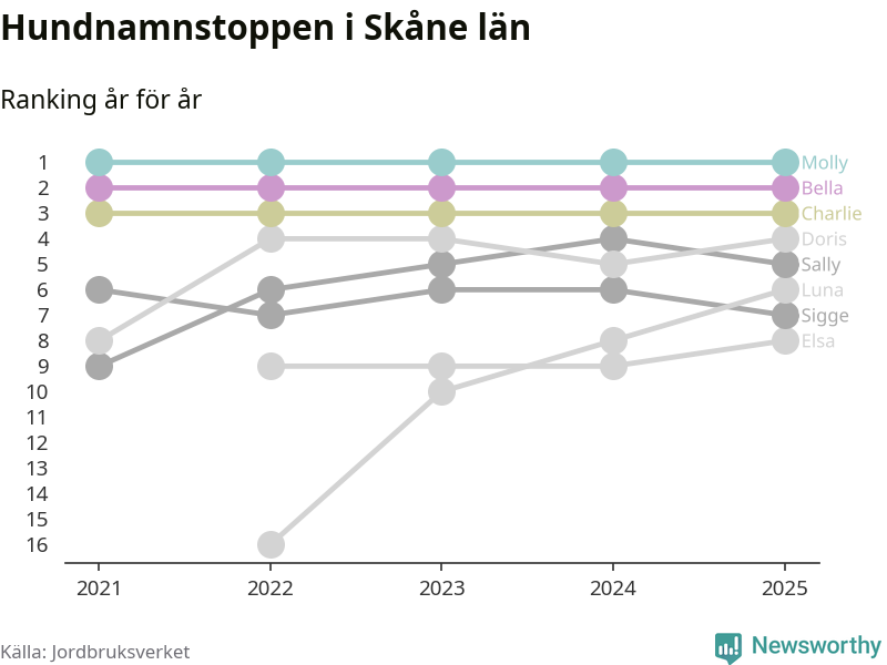 Molly är fortsatt ohotad etta bland hundnamnen i Sverige, följt av Bella och Charlie. Så har det sett ut flera år i rad, och även bland Skånehundarna ligger alltså Molly i topp.
