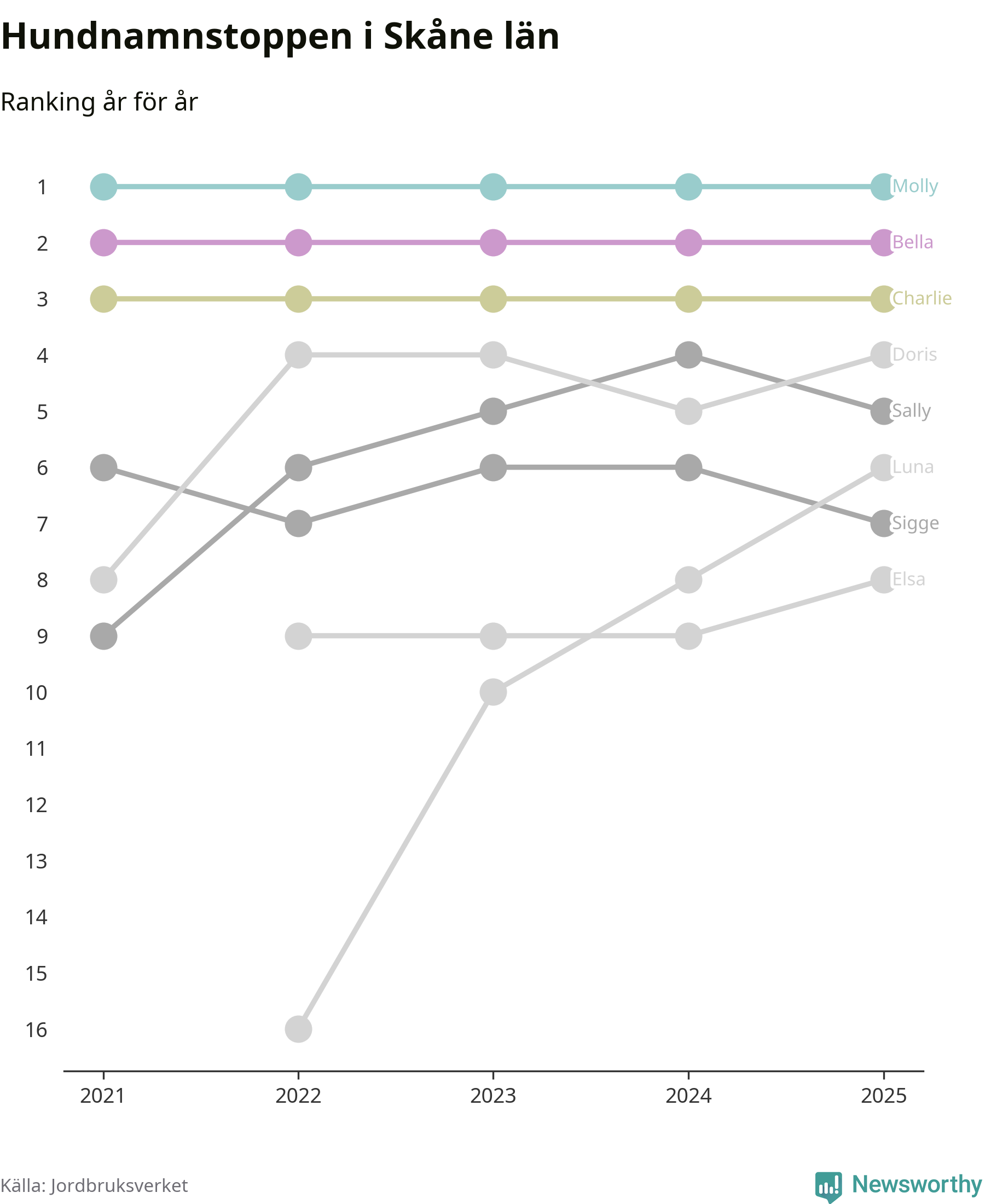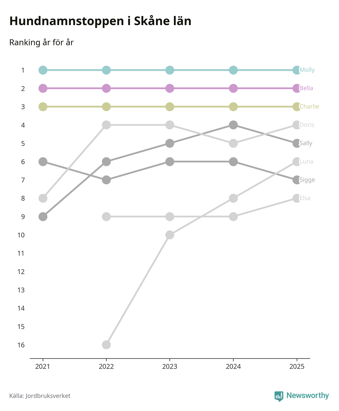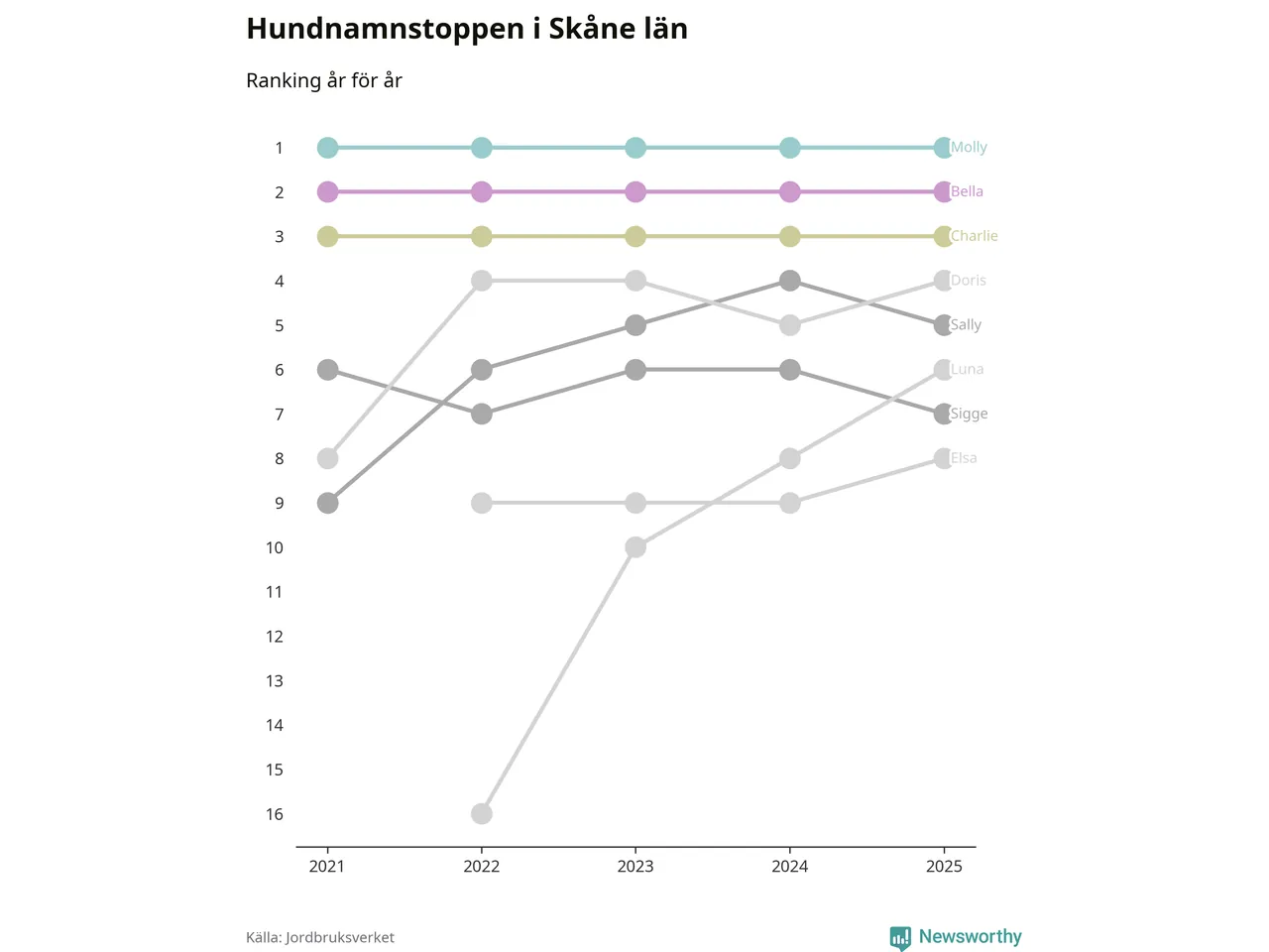 I hela landet är Molly det ohotat populäraste tilltalsnamnet för hundar sedan flera år, följt av Bella och Charlie. Något av de tre namnen toppar listan i 243 av 290 kommuner, och de har varit de vanligaste namnen sedan åtminstone 2018. Men det fjärde populäraste namnet, Doris, knappade in på ledartrion och kommer snart kunna utmana Charlie om tredjeplatsen, om trenden håller i sig.