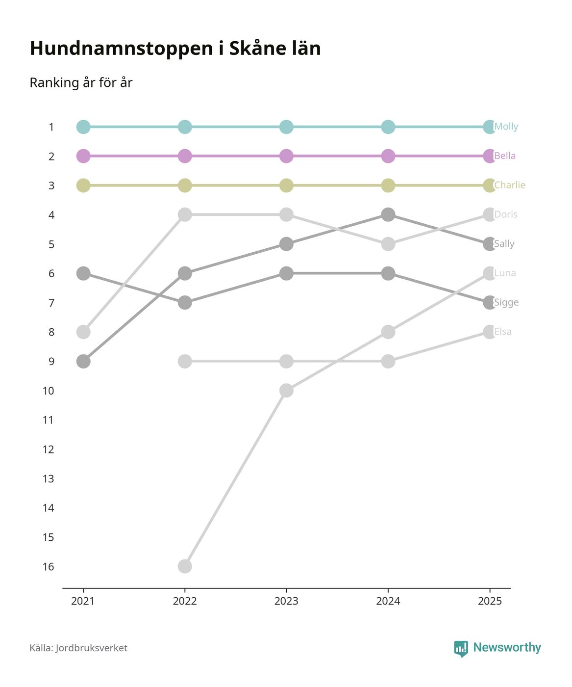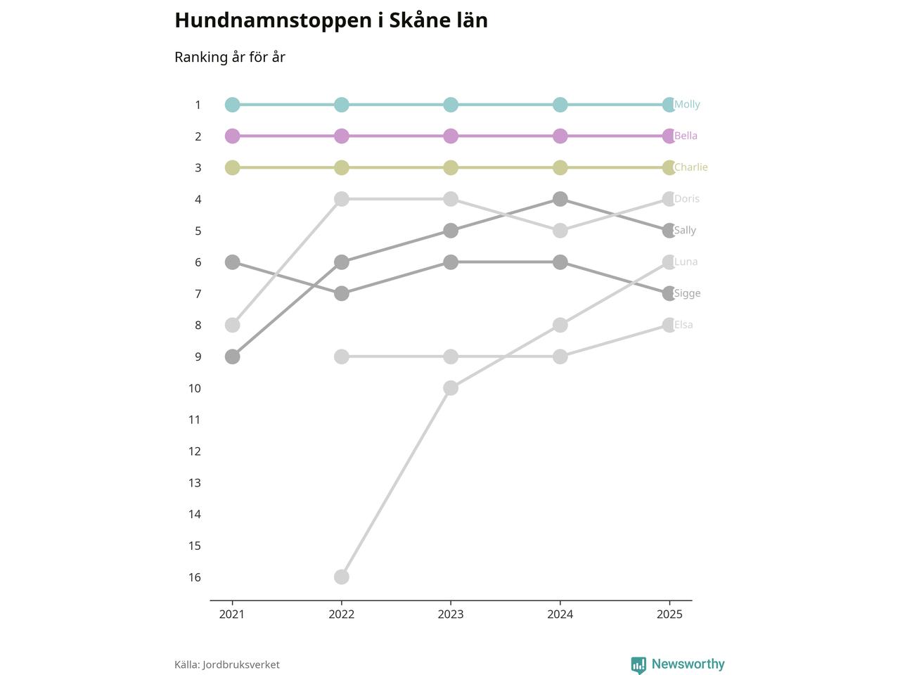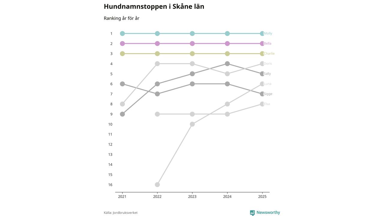 Molly toppar hundnamnsligan i Skåne län, precis som i landet som helhet. Det visar färsk statistik från Jordbruksverket. Här finns hela topplistan för länet.