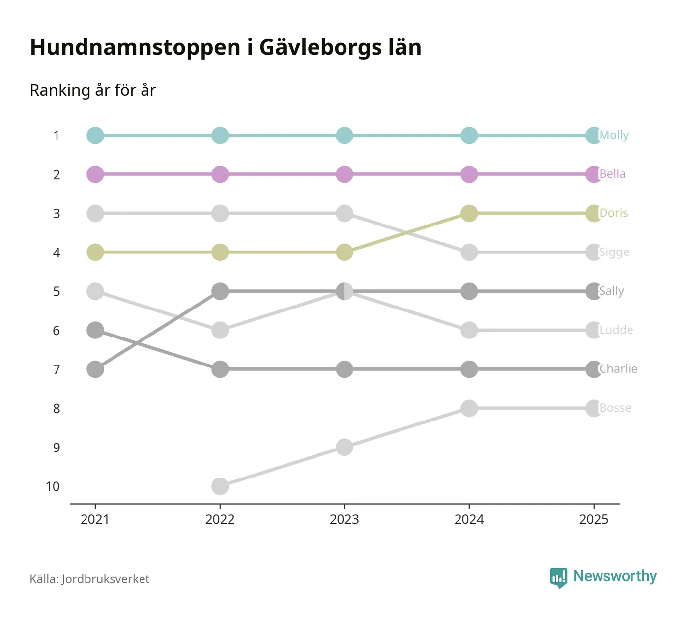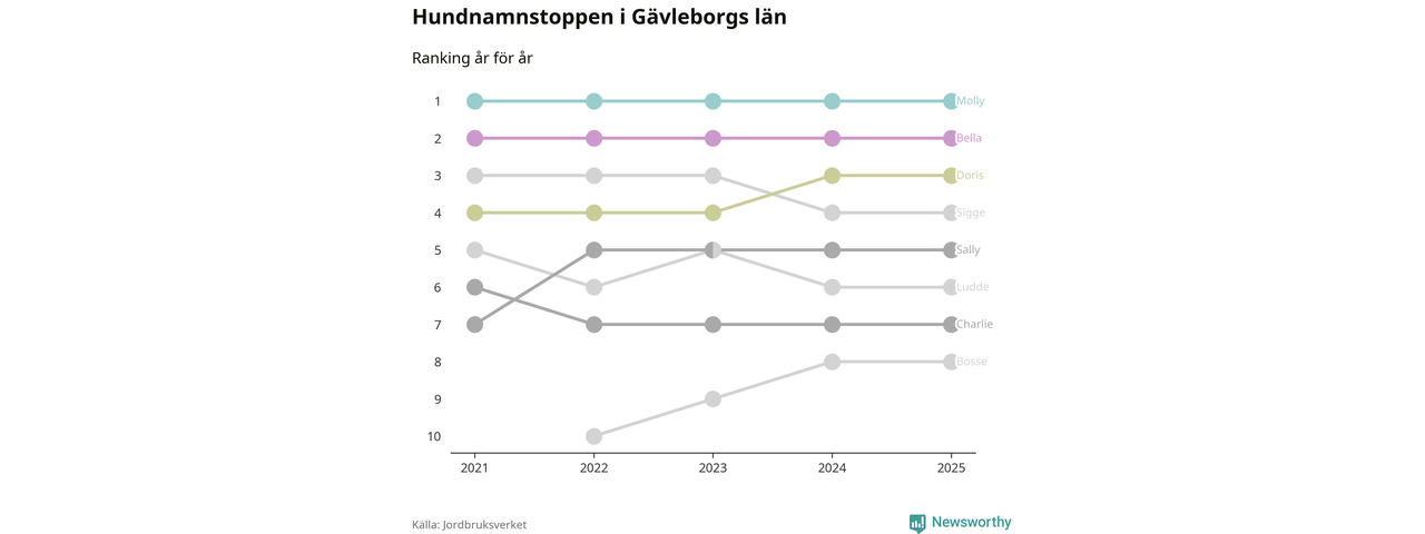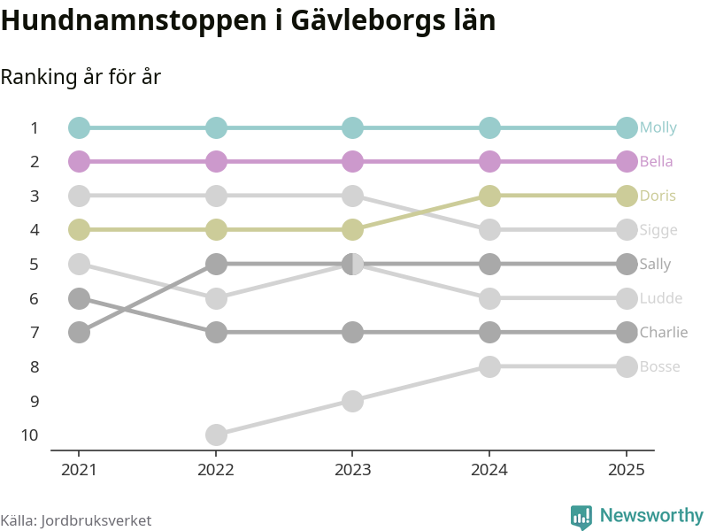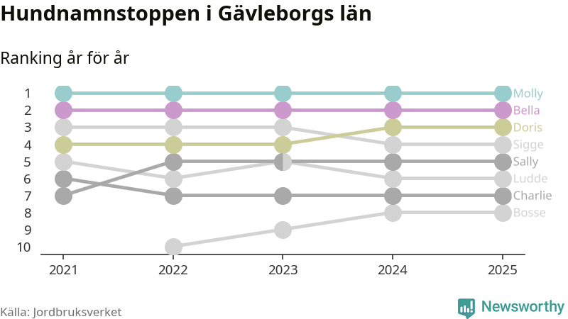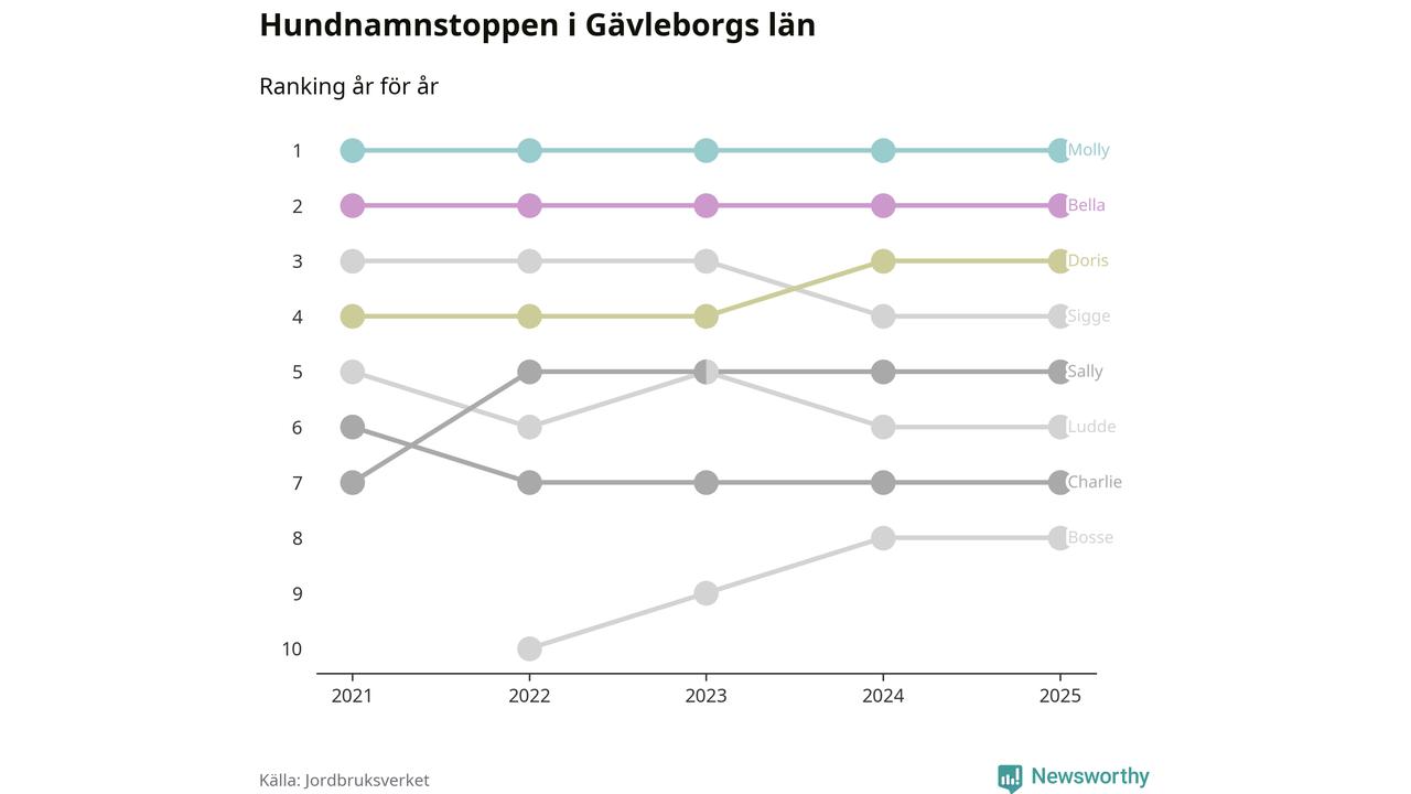 I hela landet är Molly det ohotat populäraste tilltalsnamnet för hundar sedan flera år, följt av Bella och Charlie. Något av de tre namnen toppar listan i 243 av 290 kommuner, och de har varit de vanligaste namnen sedan åtminstone 2018. Men det fjärde populäraste namnet, Doris, knappade in på ledartrion och kommer snart kunna utmana Charlie om tredjeplatsen, om trenden håller i sig.