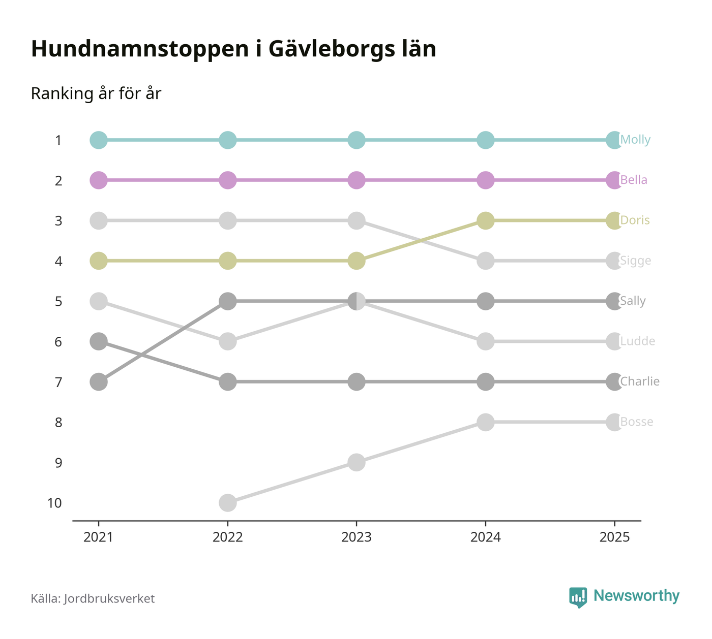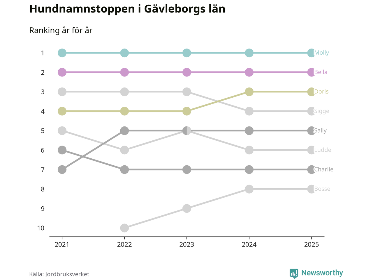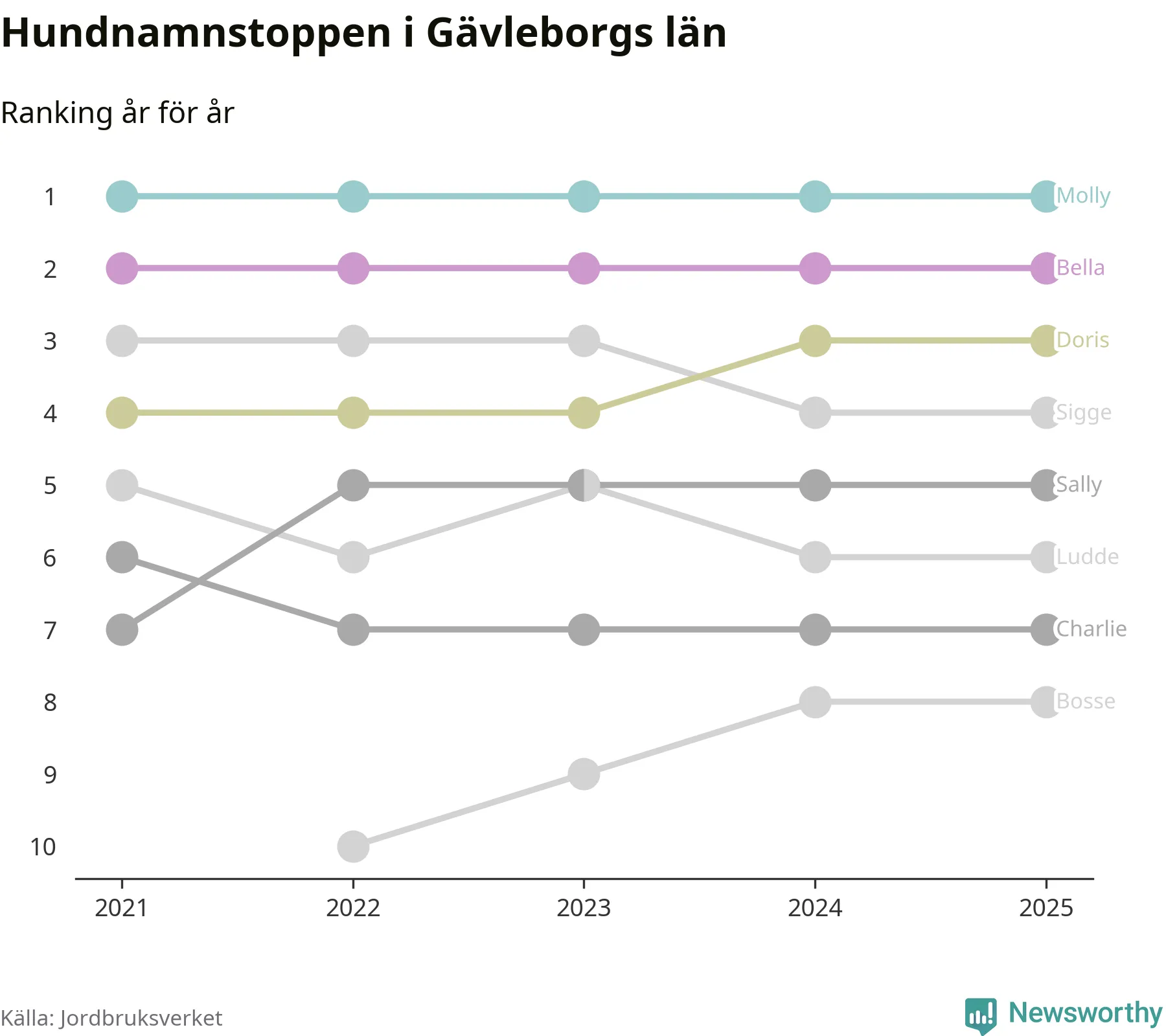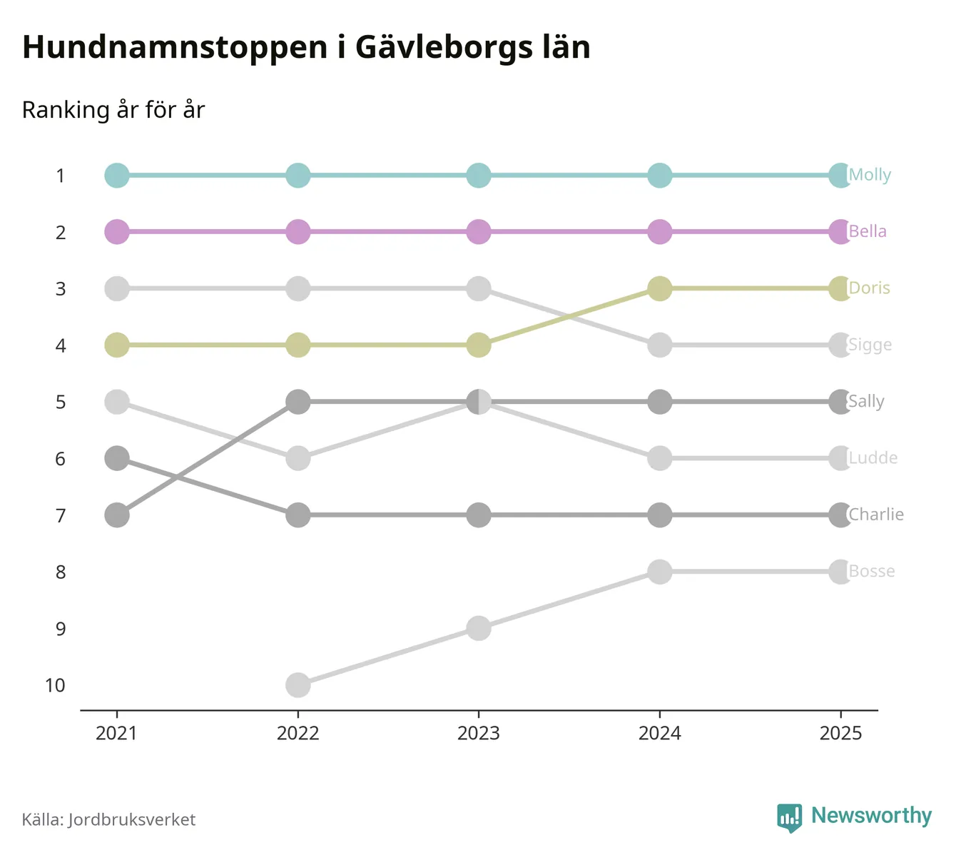 I hela landet är Molly det ohotat populäraste tilltalsnamnet för hundar sedan flera år, följt av Bella och Charlie. Något av de tre namnen toppar listan i 243 av 290 kommuner, och de har varit de vanligaste namnen sedan åtminstone 2018. Men det fjärde populäraste namnet, Doris, knappade in på ledartrion och kommer snart kunna utmana Charlie om tredjeplatsen, om trenden håller i sig.