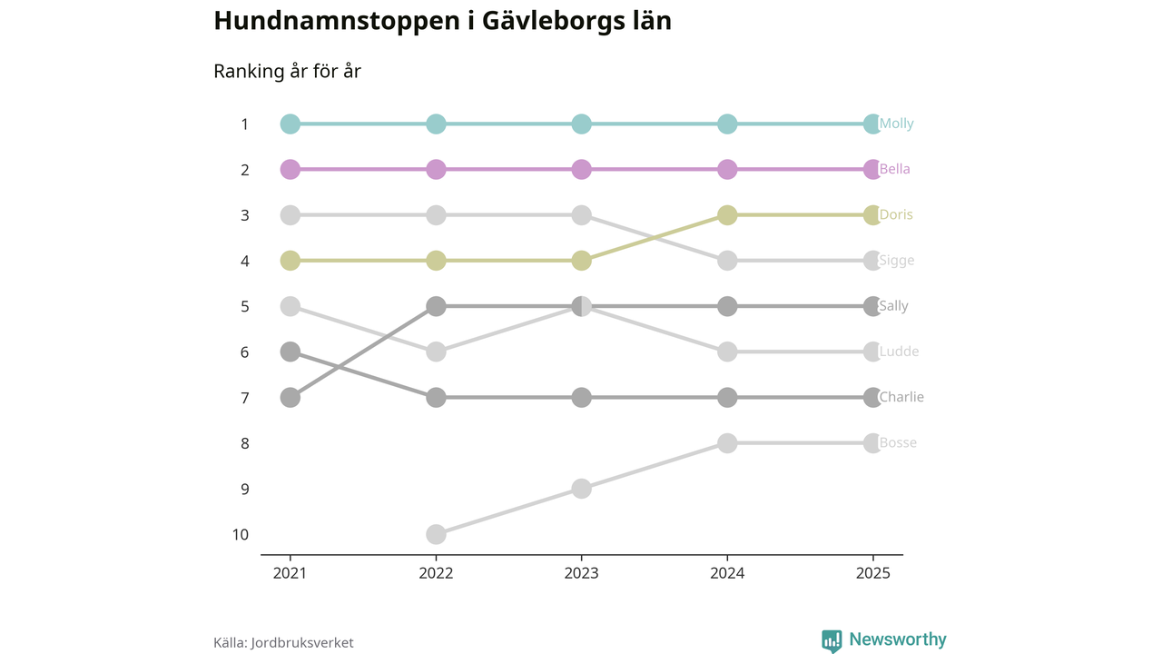 Molly toppar hundnamnsligan i Gävleborgs län, precis som i landet som helhet. Det visar färsk statistik från Jordbruksverket. Här finns hela topplistan för länet.