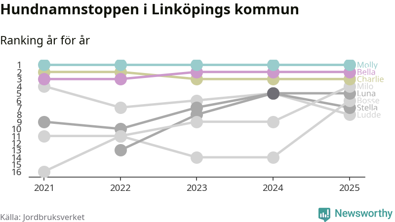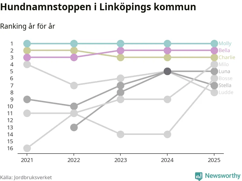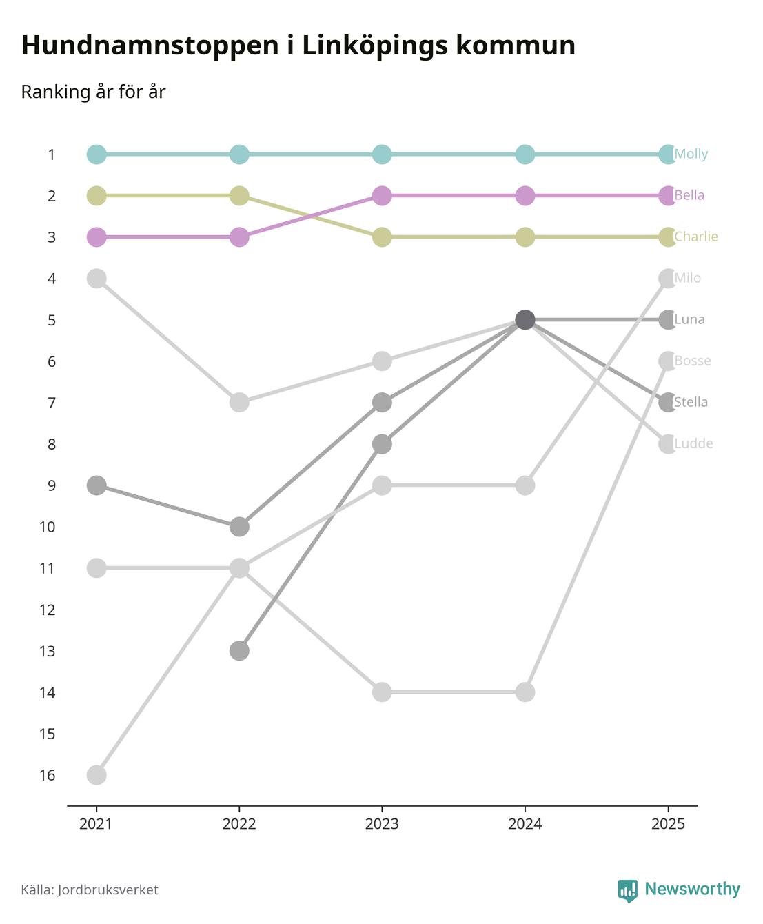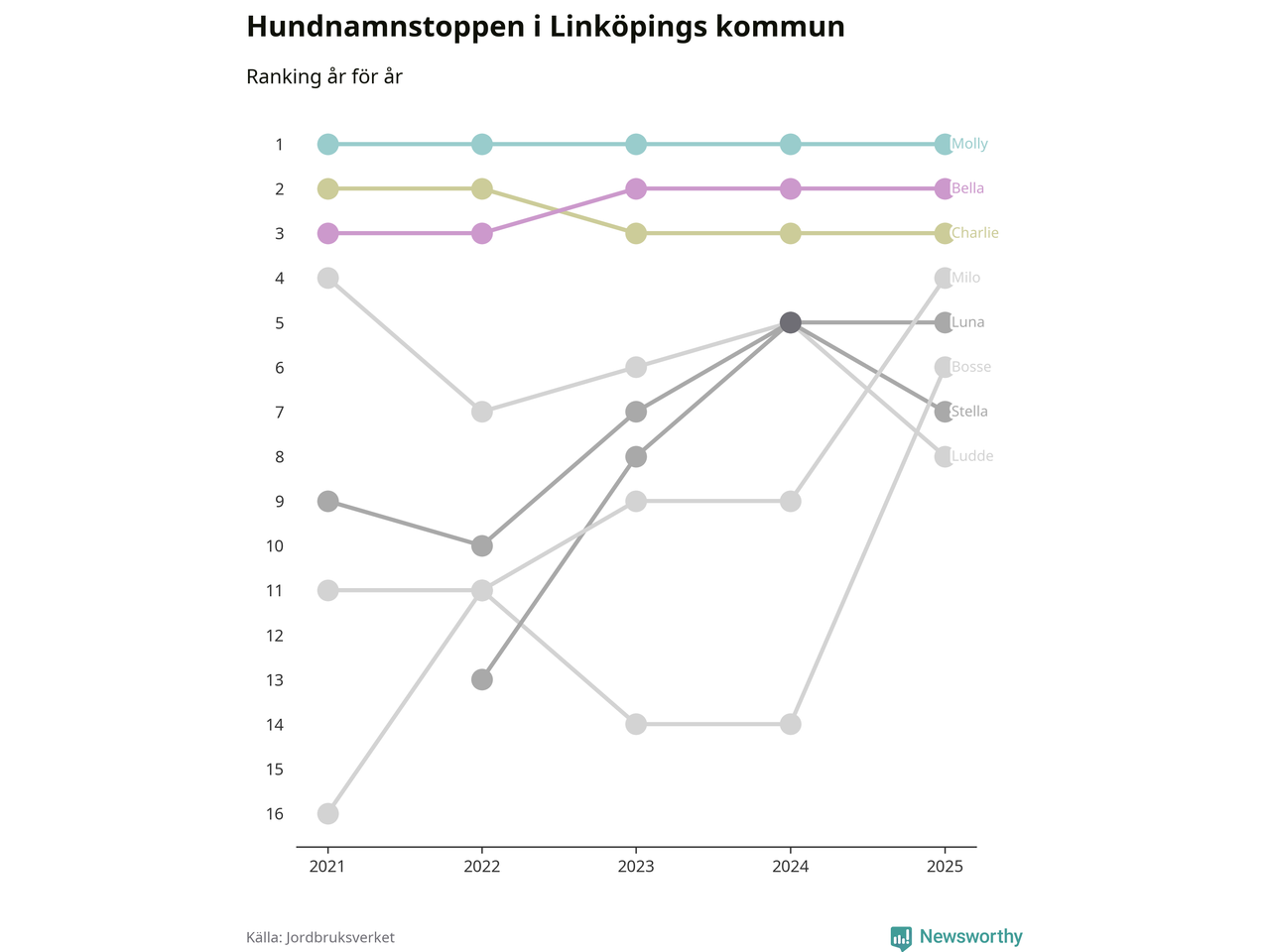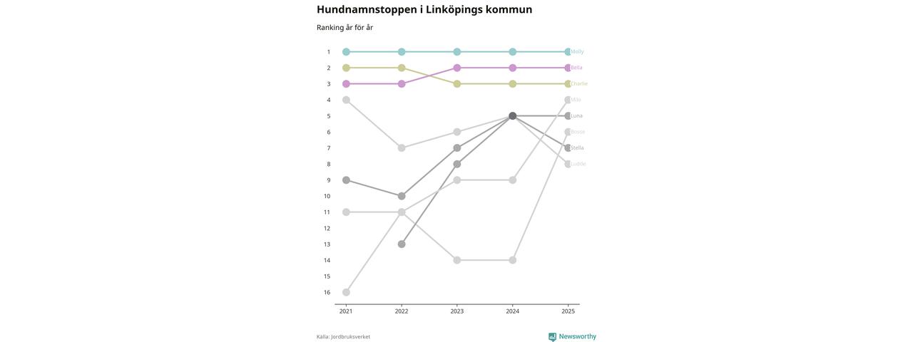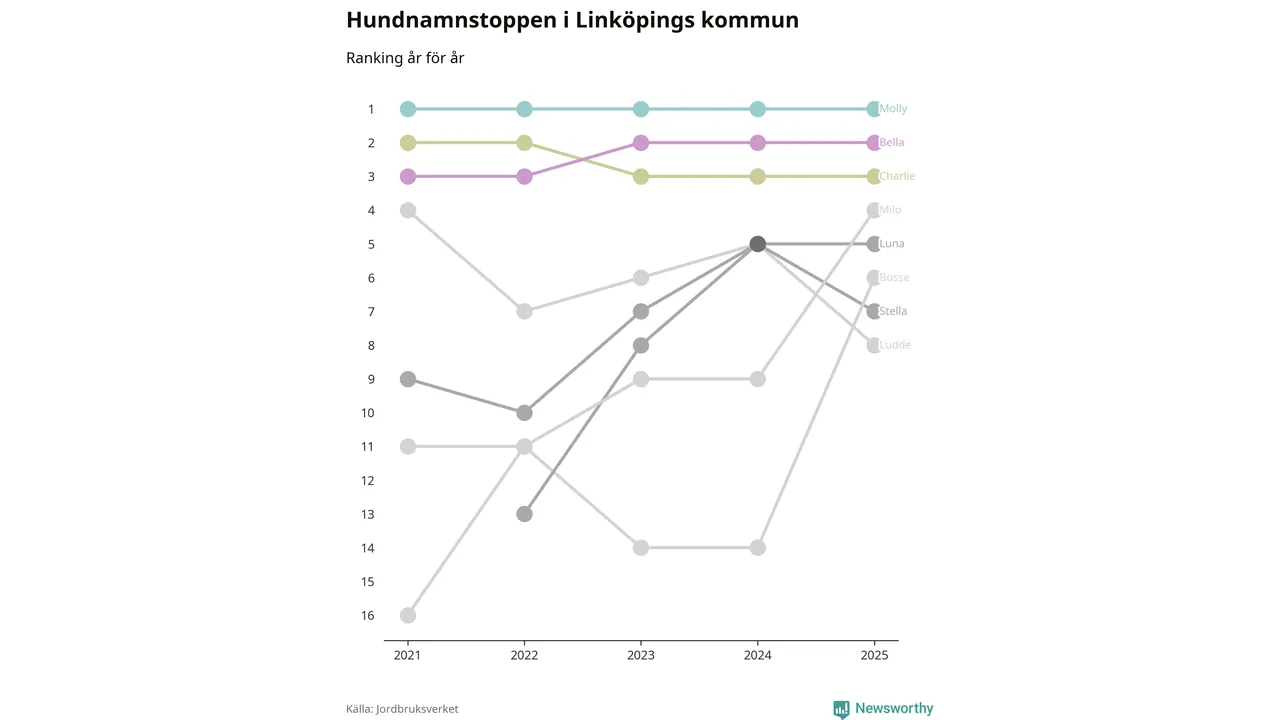 Molly toppar hundnamnsligan i Linköpings kommun, precis som i landet som helhet. Det visar färsk statistik från Jordbruksverket. Här finns hela topplistan för kommunen.