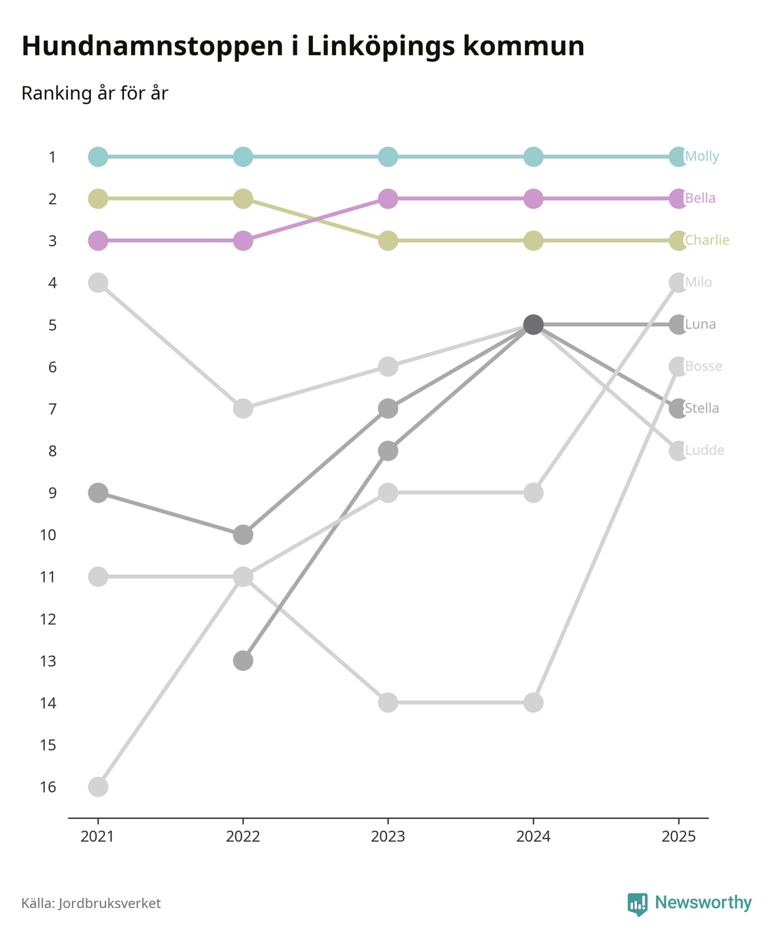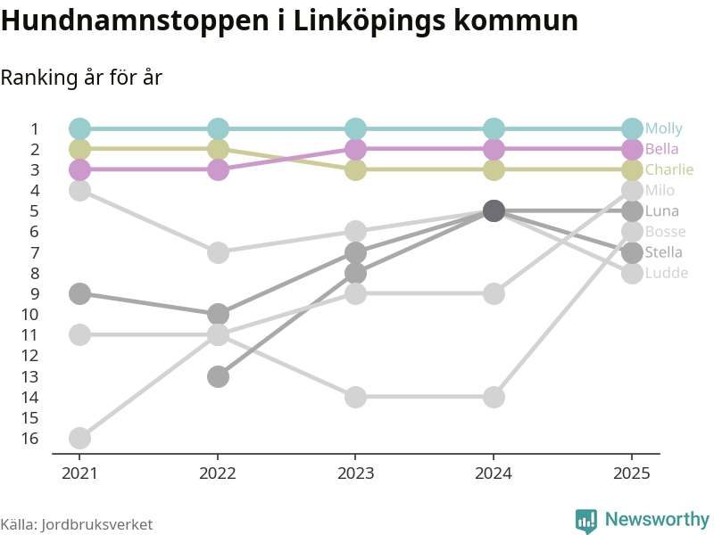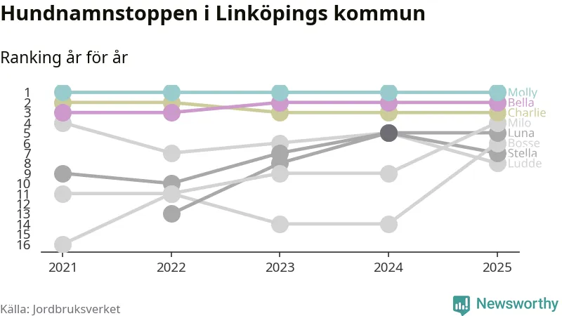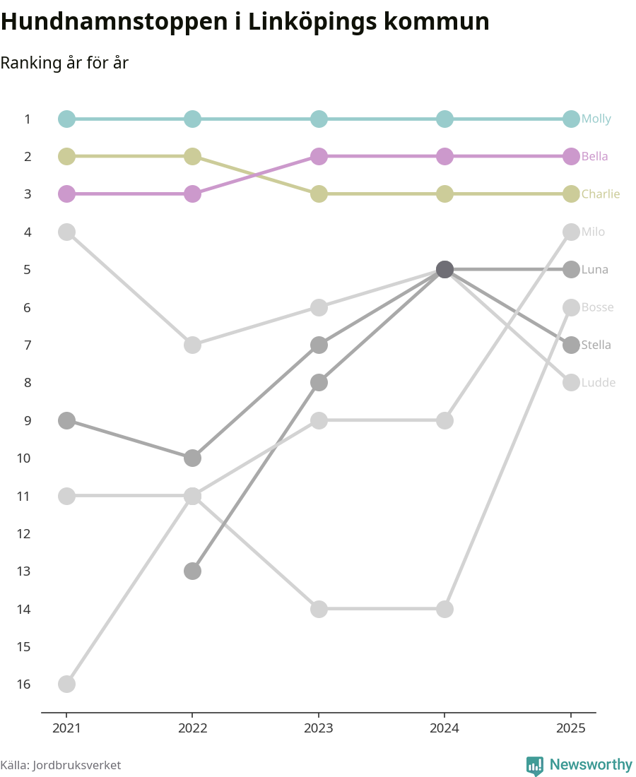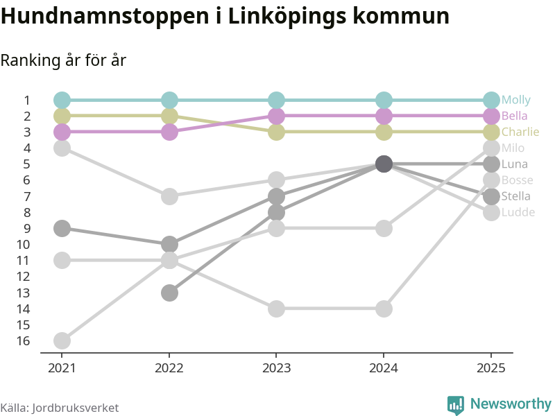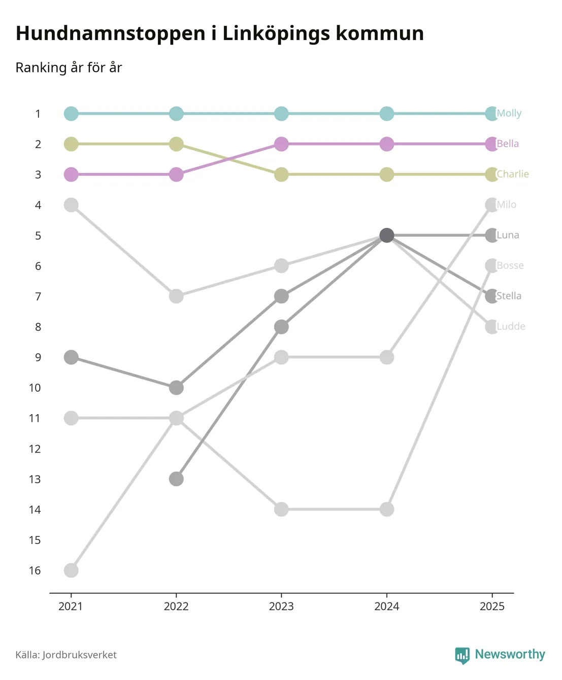 Molly är fortsatt ohotad etta bland hundnamnen i Sverige, följt av Bella och Charlie. Så har det sett ut flera år i rad, och även bland Linköpingshundarna ligger alltså Molly i topp.